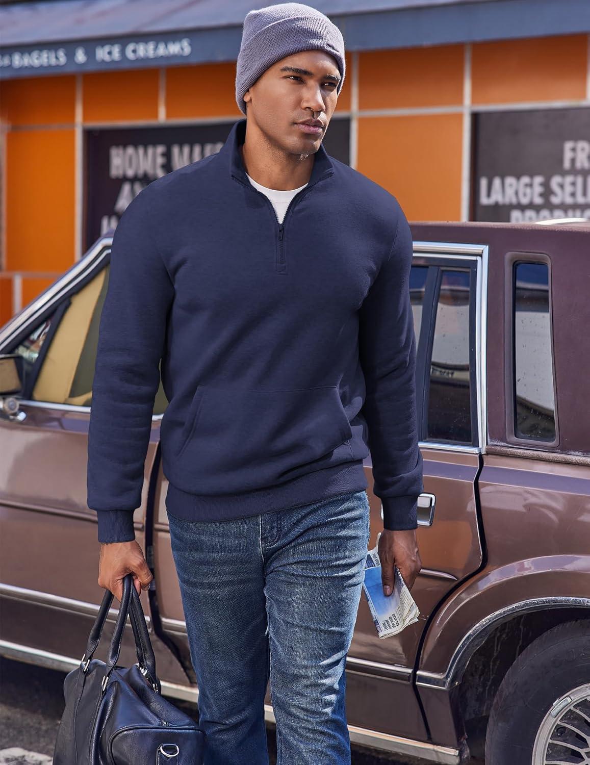 COOFANDY Mens Quarter Zip Pullover Fleece Lined Sweatshirts Long Sleeve Mock Neck Sweater with Pocket(Navy Blue)