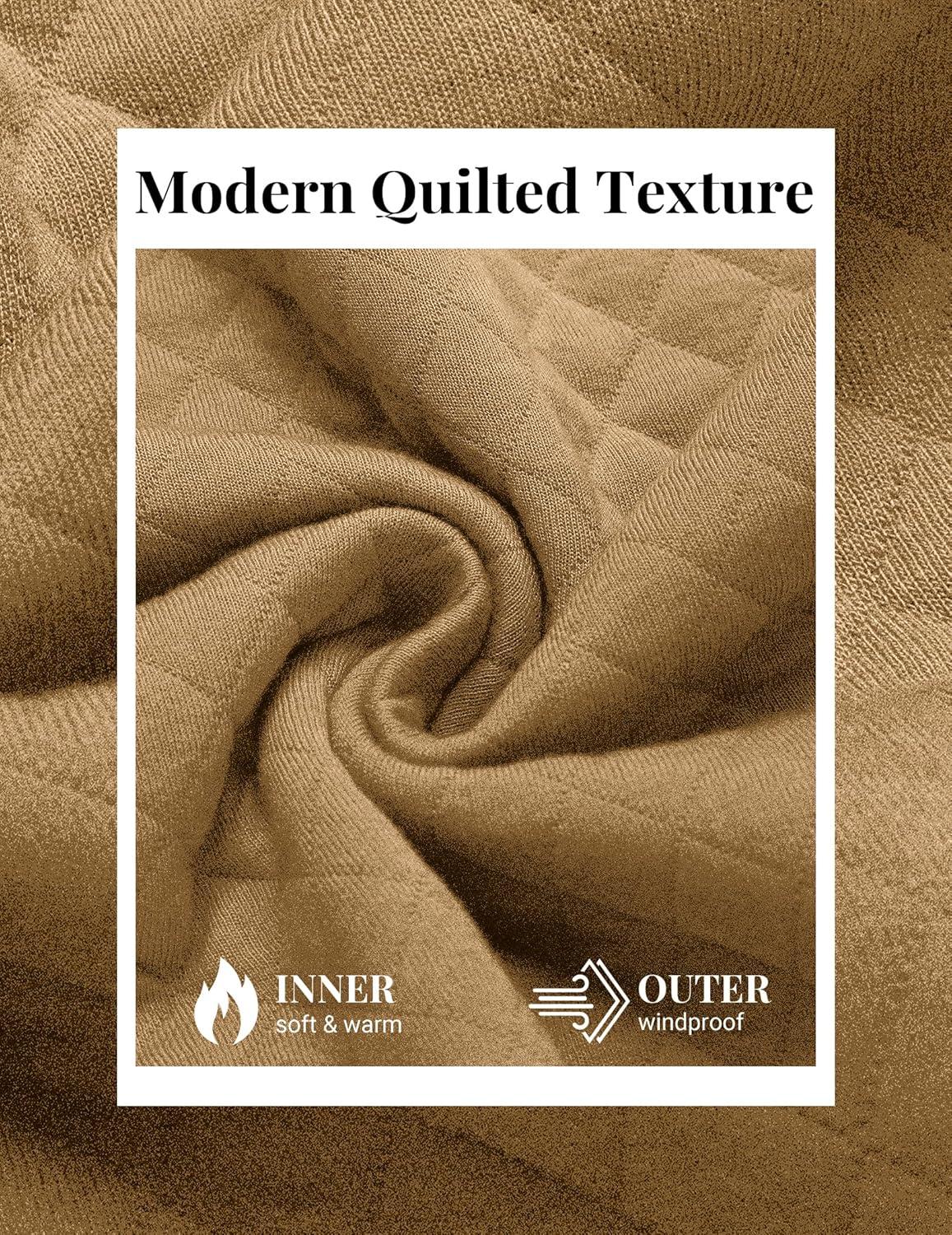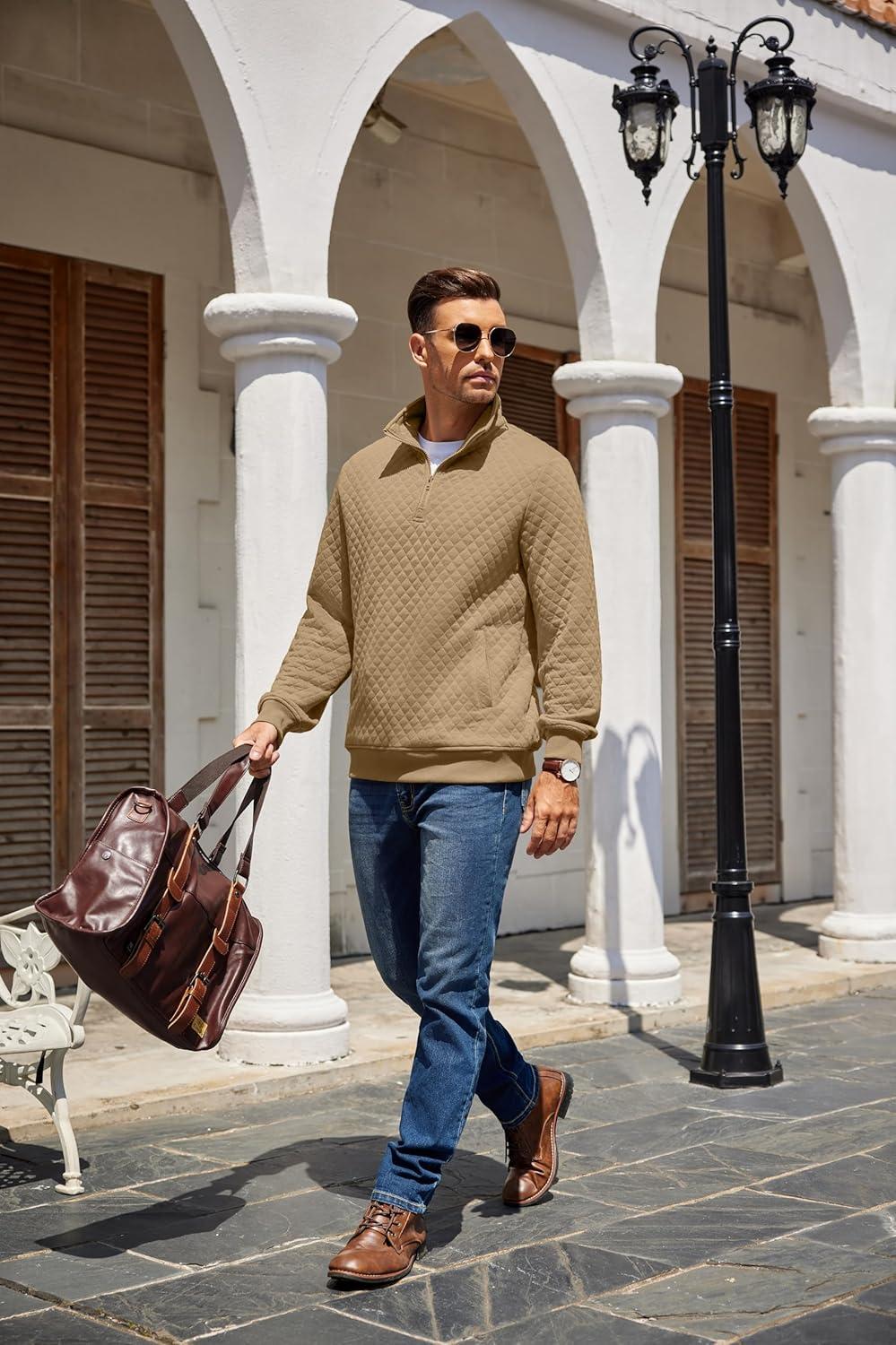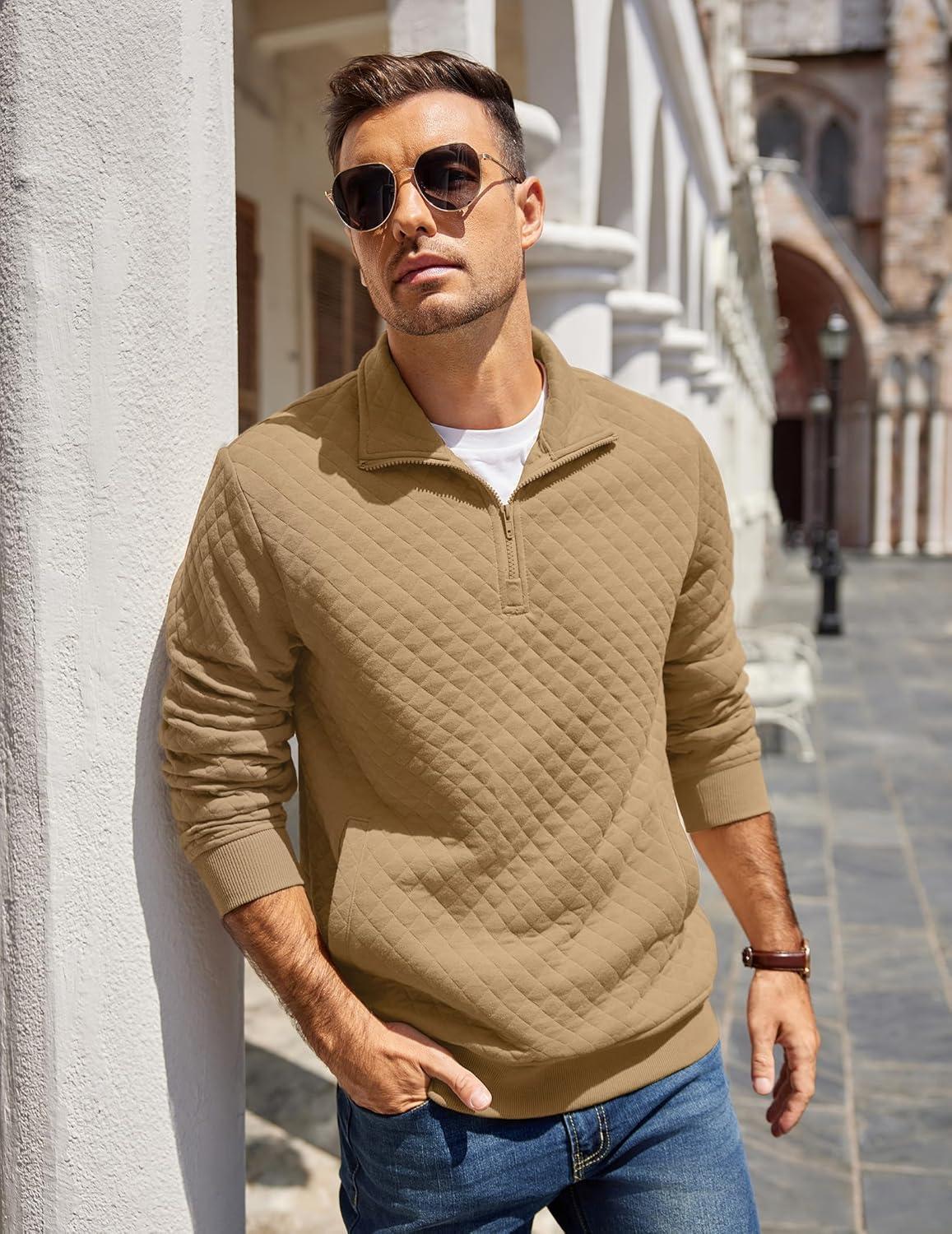 COOFANDY Mens Quarter Zip Pullover Quilted Sweatshirt Knit Long Sleeve Mock Neck Sweater Polo with Pocket(Camel)