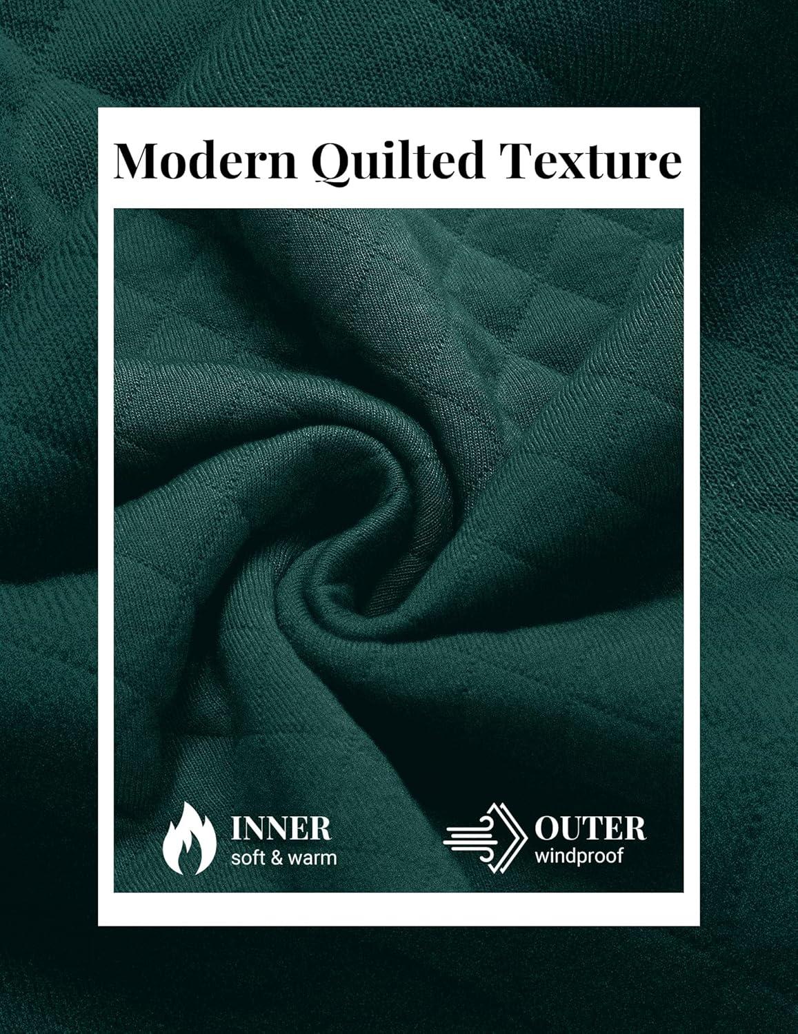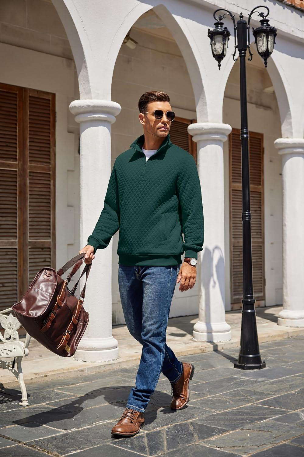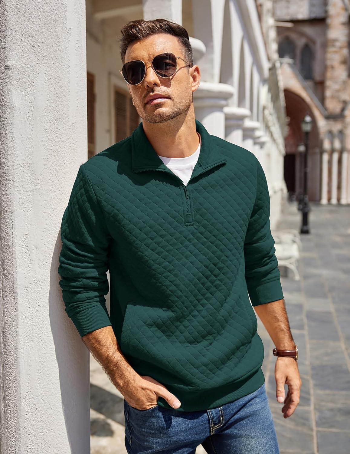 COOFANDY Mens Quarter Zip Pullover Quilted Sweatshirt Knit Long Sleeve Mock Neck Sweater Polo with Pocket(Green)