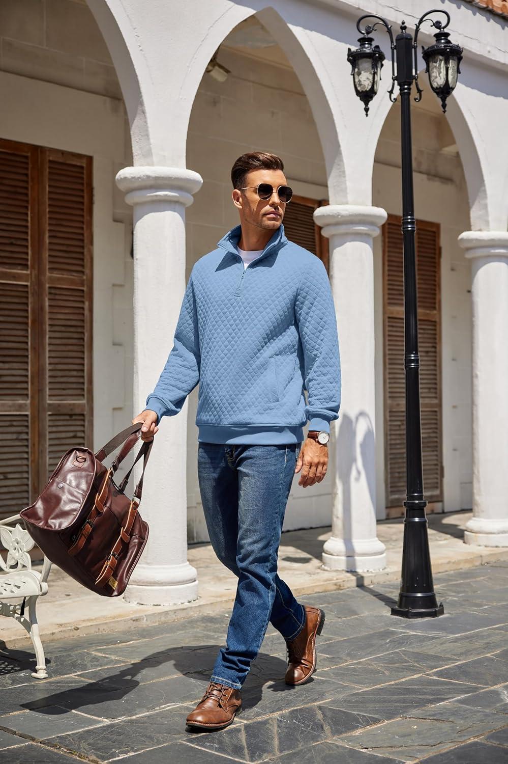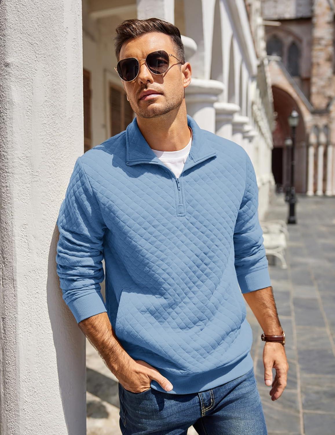COOFANDY Mens Quarter Zip Pullover Quilted Sweatshirt Knit Long Sleeve Mock Neck Sweater Polo with Pocket(Light Blue)