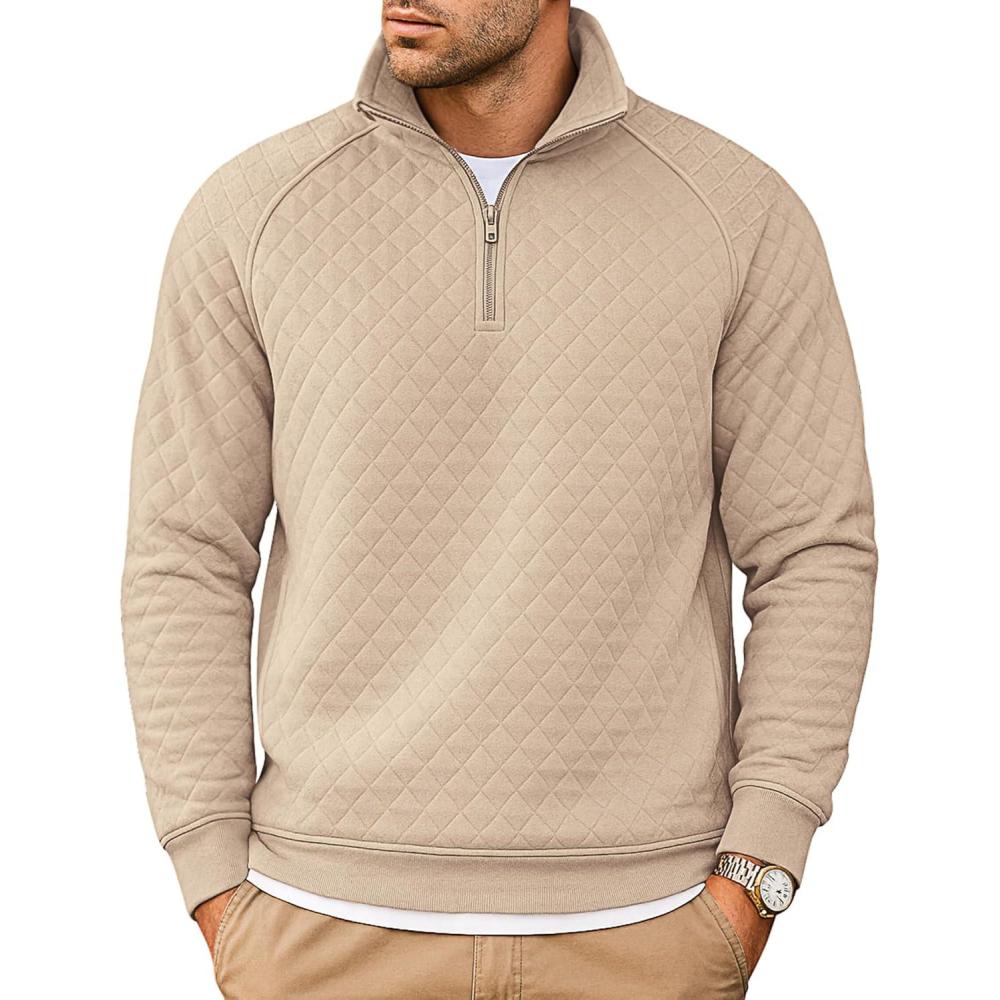 COOFANDY Mens Quarter Zip Pullover Quilted Sweatshirt Knit Long Sleeve Sweater Half Zip Polo Sweatshirts with Pocket(All Khaki)