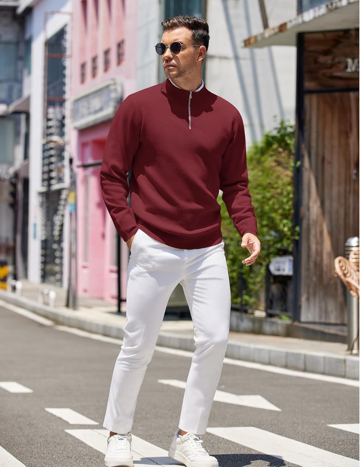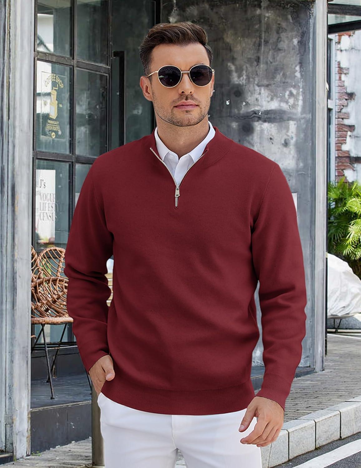 COOFANDY Mens Quarter Zip Pullover Slim Fit Lightweight Knit Pullover Sweaters Casual Polo Sweater(Wine Red)