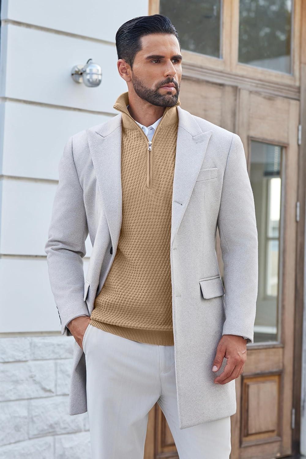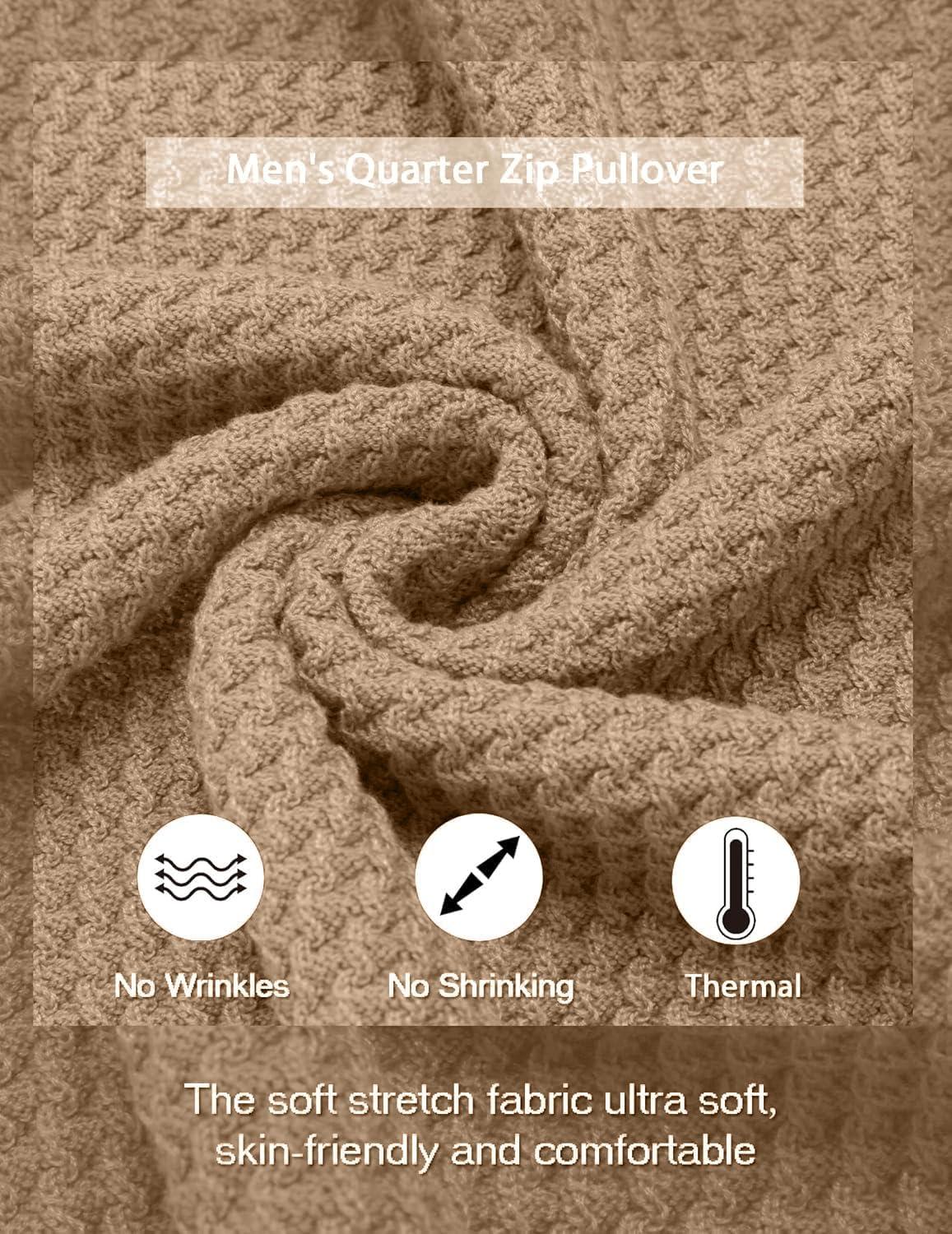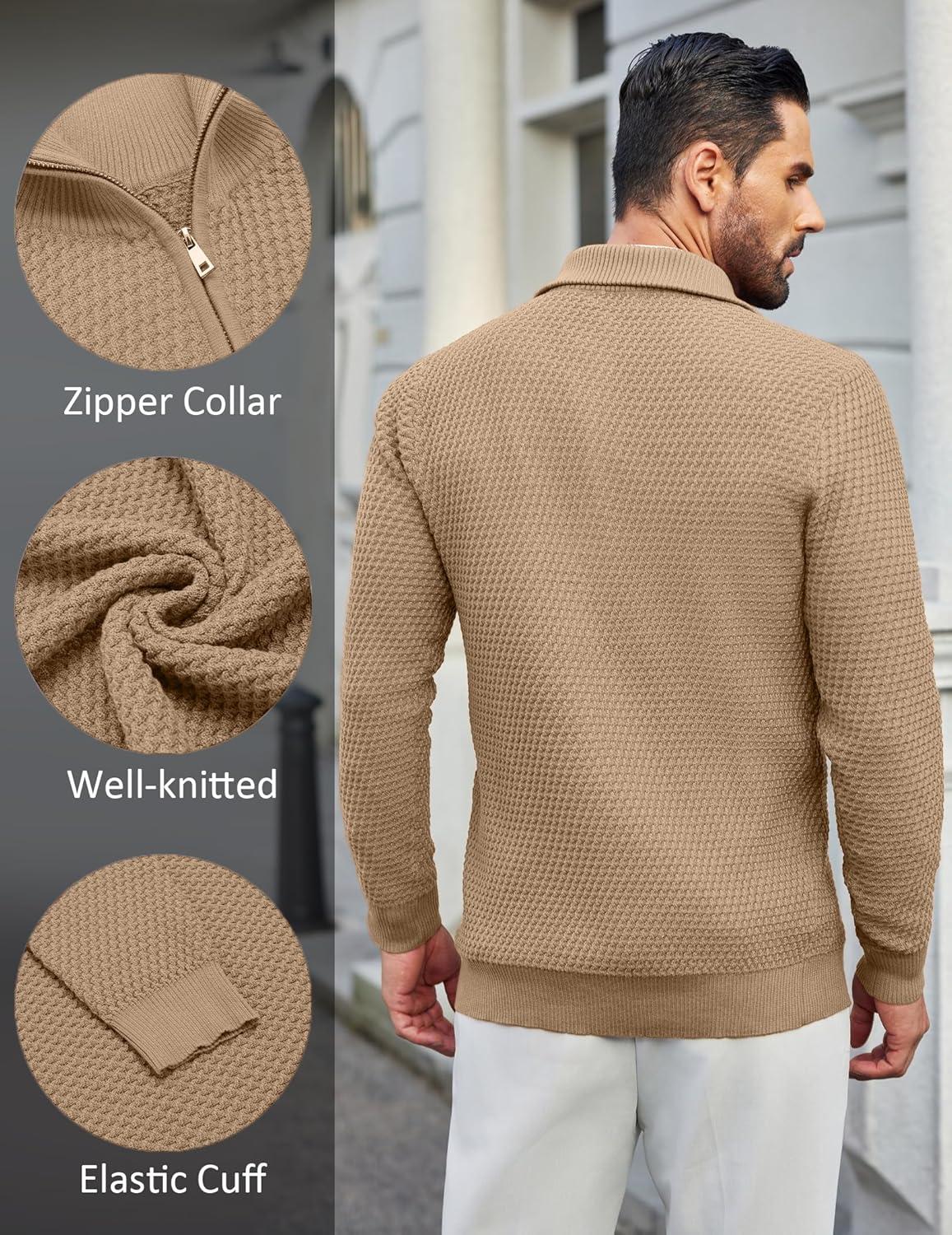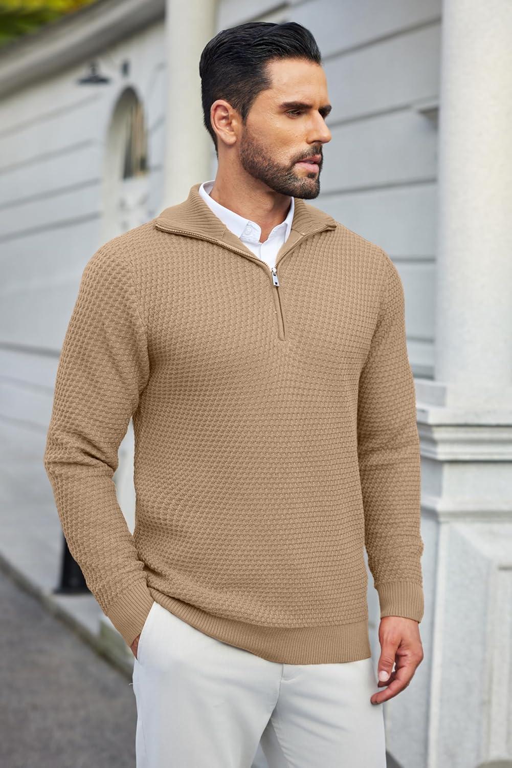 COOFANDY Mens Quarter Zip Pullover Sweater Slim Fit Waffle Mock Turtleneck Sweaters(Dark Khaki)