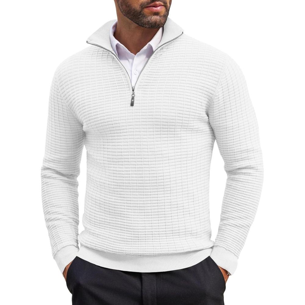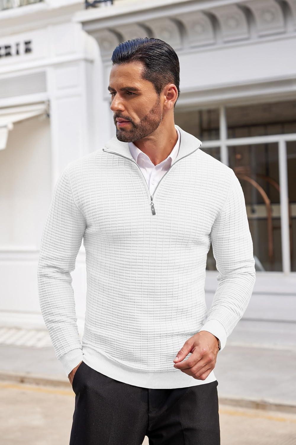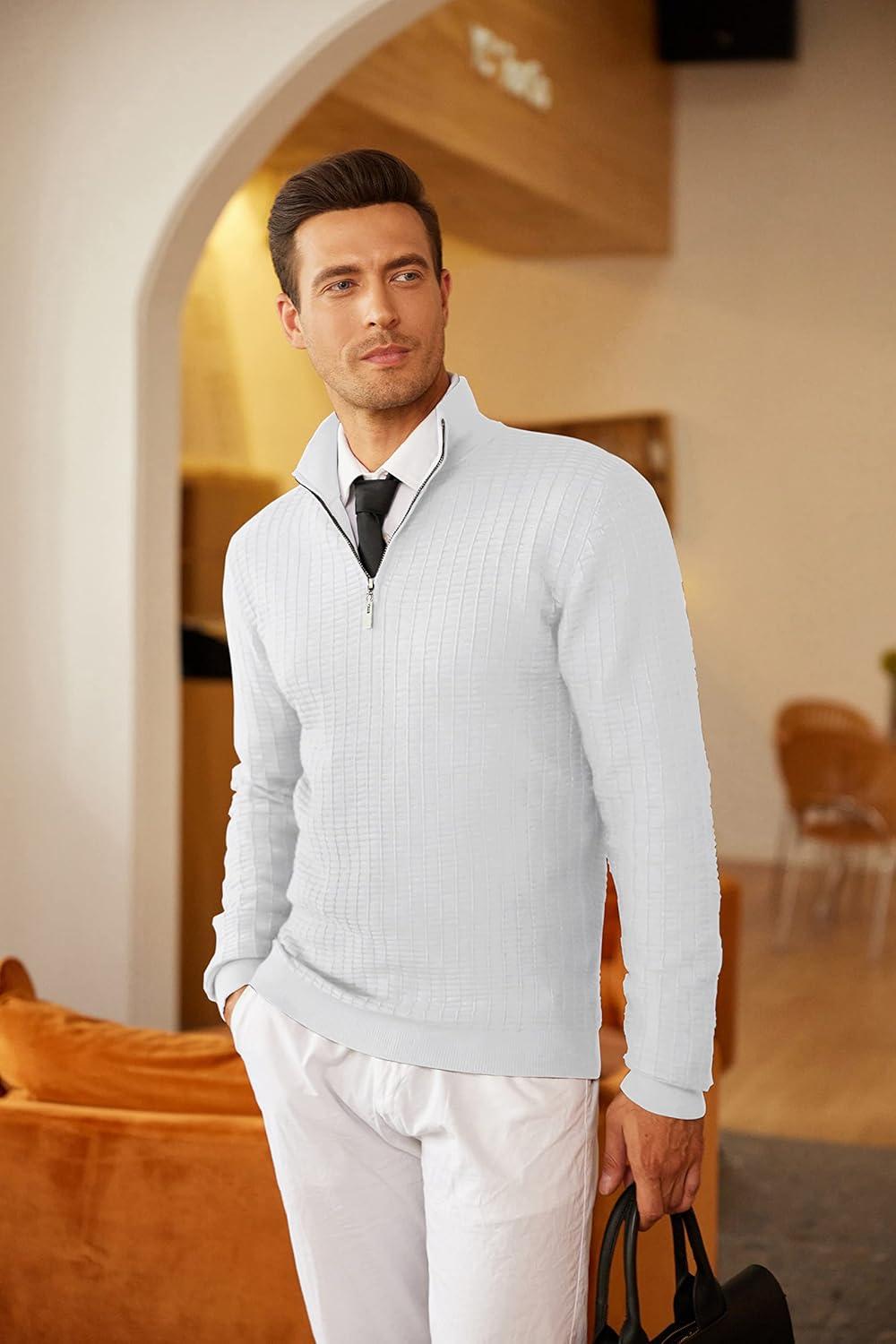 COOFANDY Men’s Quarter Zip Sweaters Slim Fit Lightweight Cotton Knitted Casual Mock Neck Pullover Sweaters(White)