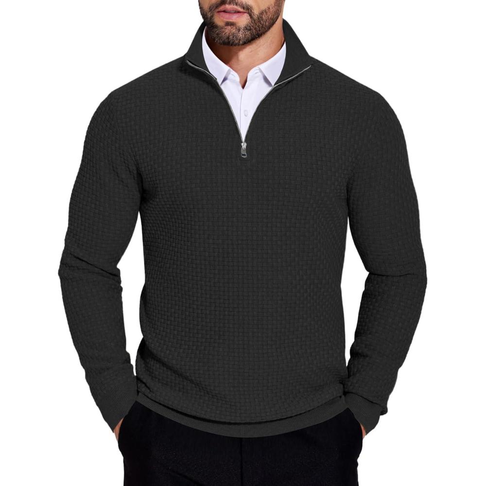 COOFANDY Men’s Quarter Zip Sweaters Slim Fit Lightweight Knitted Mock Neck Pullover Casual Polo Sweaters(All Black)
