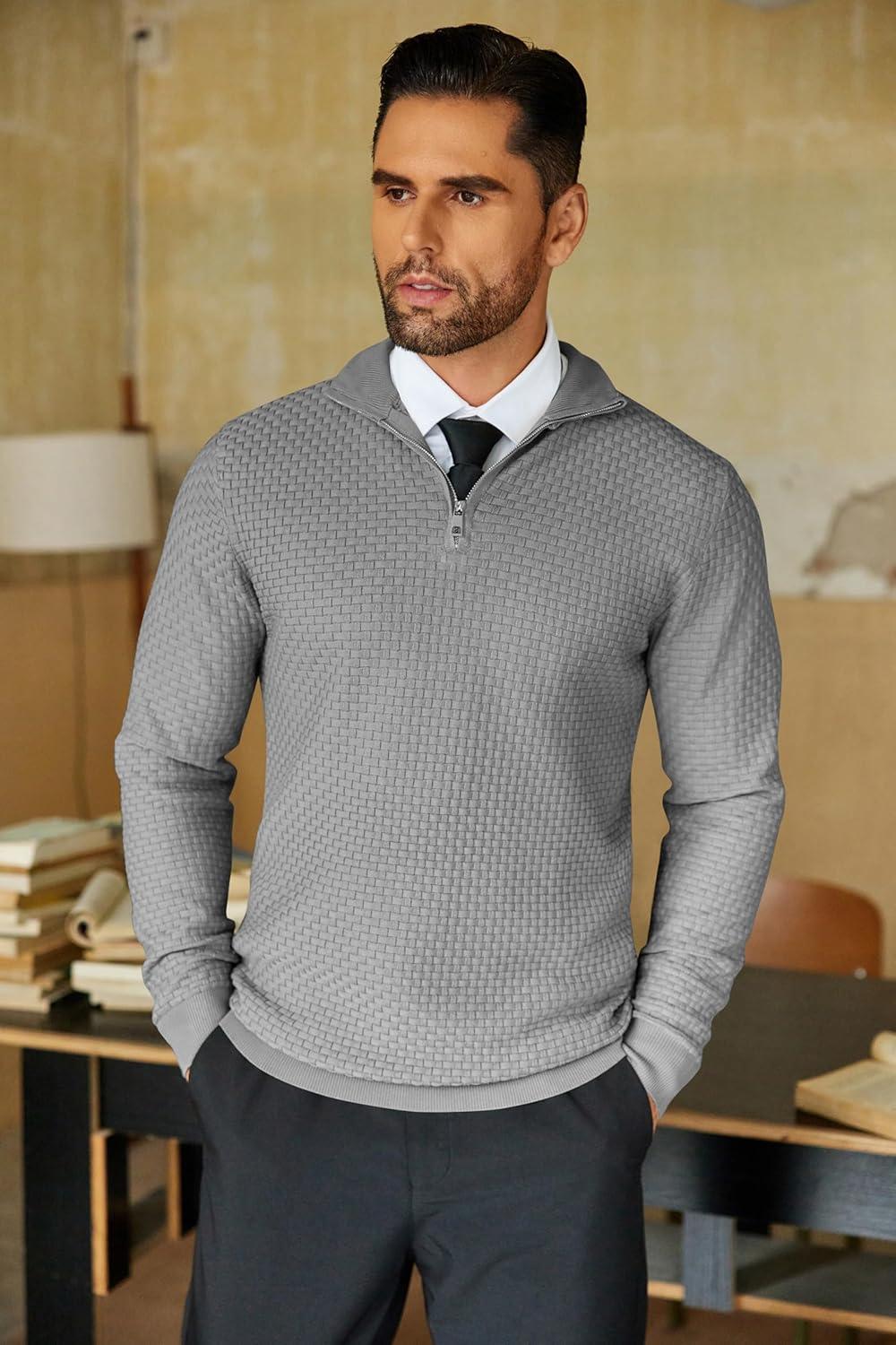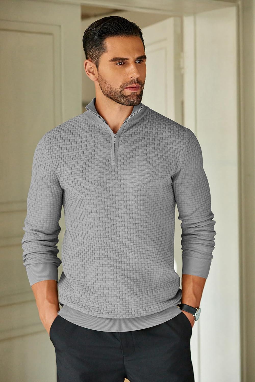 COOFANDY Men’s Quarter Zip Sweaters Slim Fit Lightweight Knitted Mock Neck Pullover Casual Polo Sweaters(Grey)