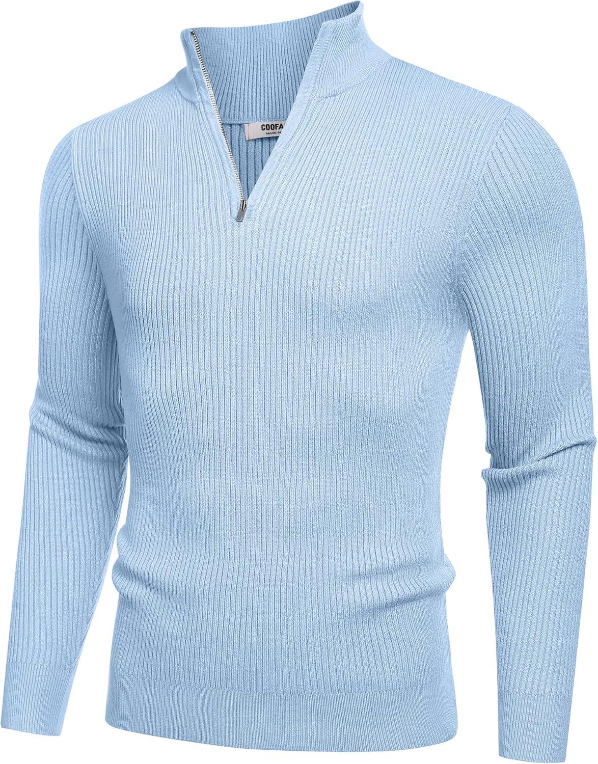 COOFANDY Men’s Quarter Zip Sweaters Slim Fit Mock Neck Pullover Sweaters Lightweight Knitted Polo Sweater(Light Blue)