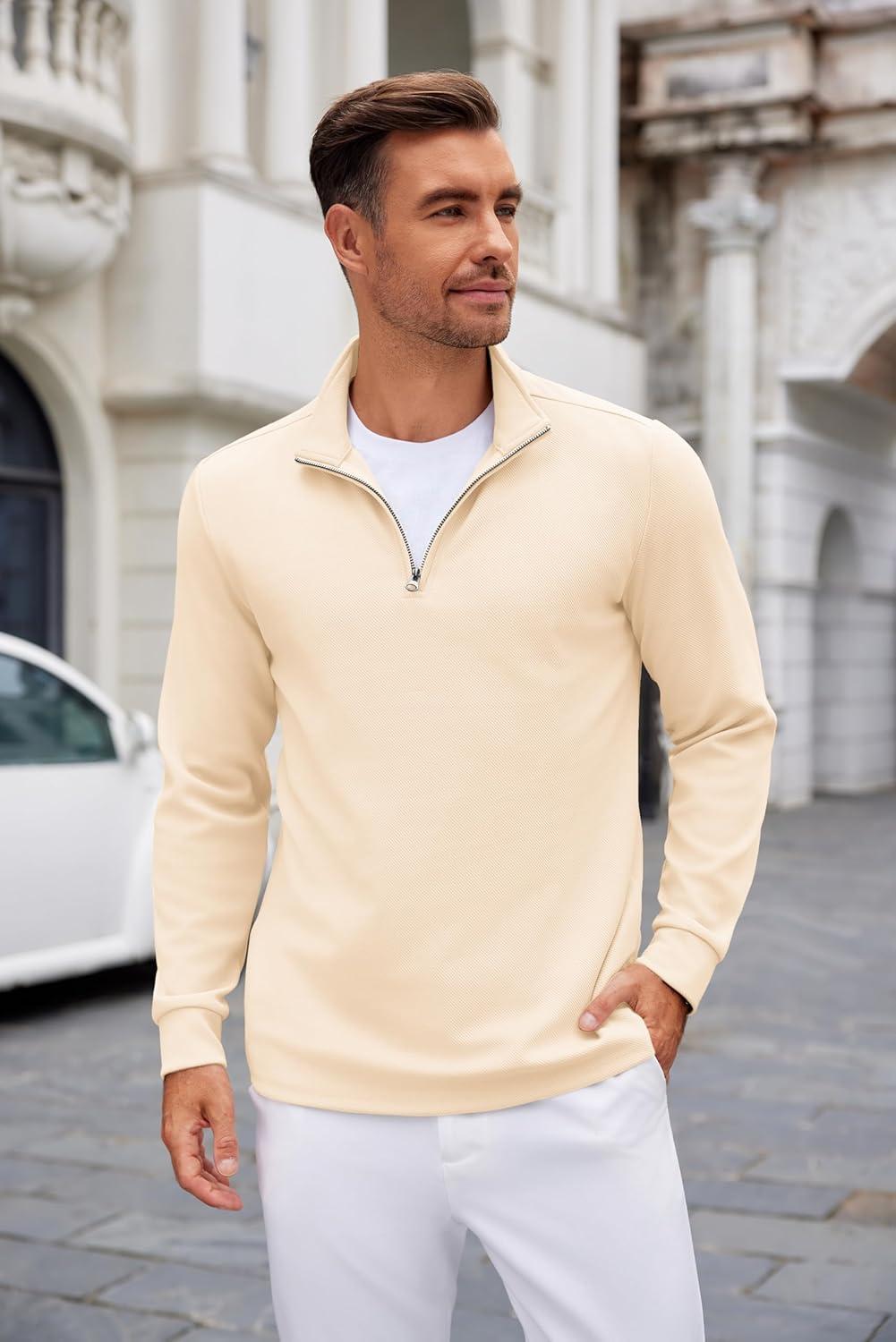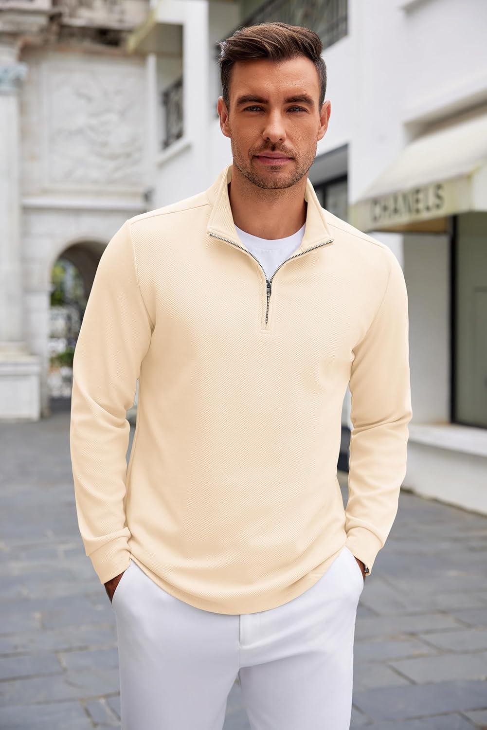 COOFANDY Men’s Quarter Zip Up Pullover Lightweight Mock Neck Sweatshirt Casual Long Sleeve Polo Shirt(Beige)