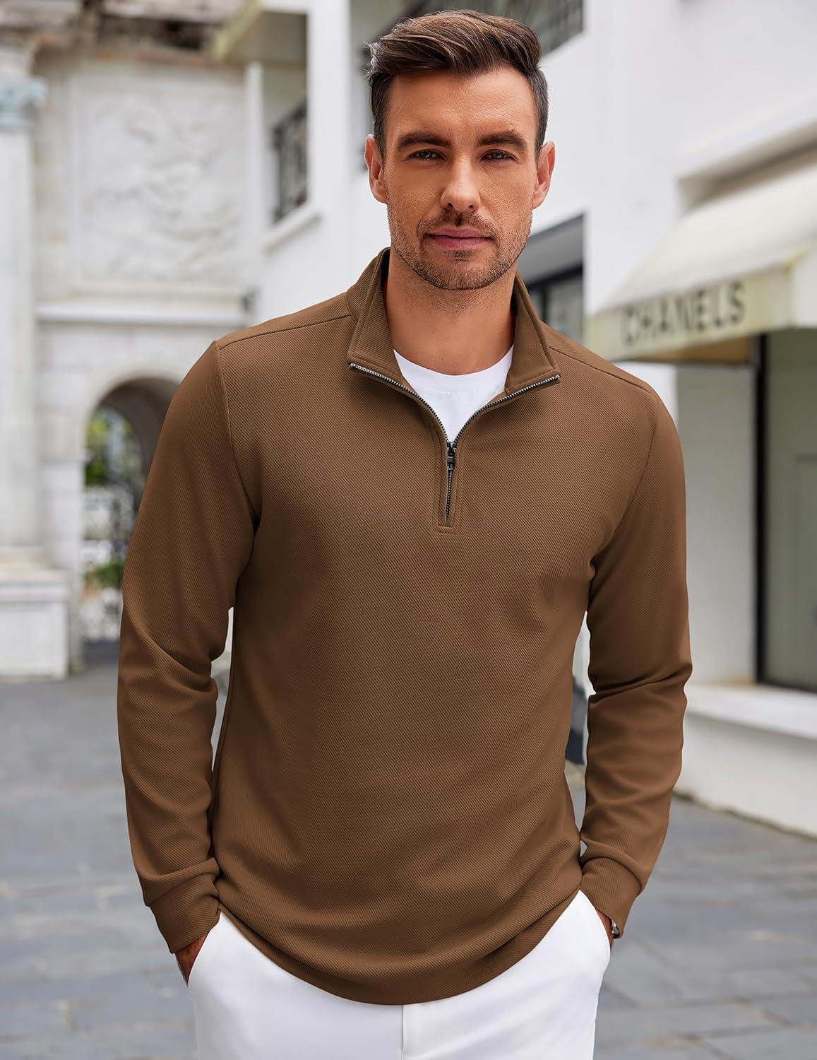 COOFANDY Men’s Quarter Zip Up Pullover Lightweight Mock Neck Sweatshirt Casual Long Sleeve Polo Shirt(Brown)
