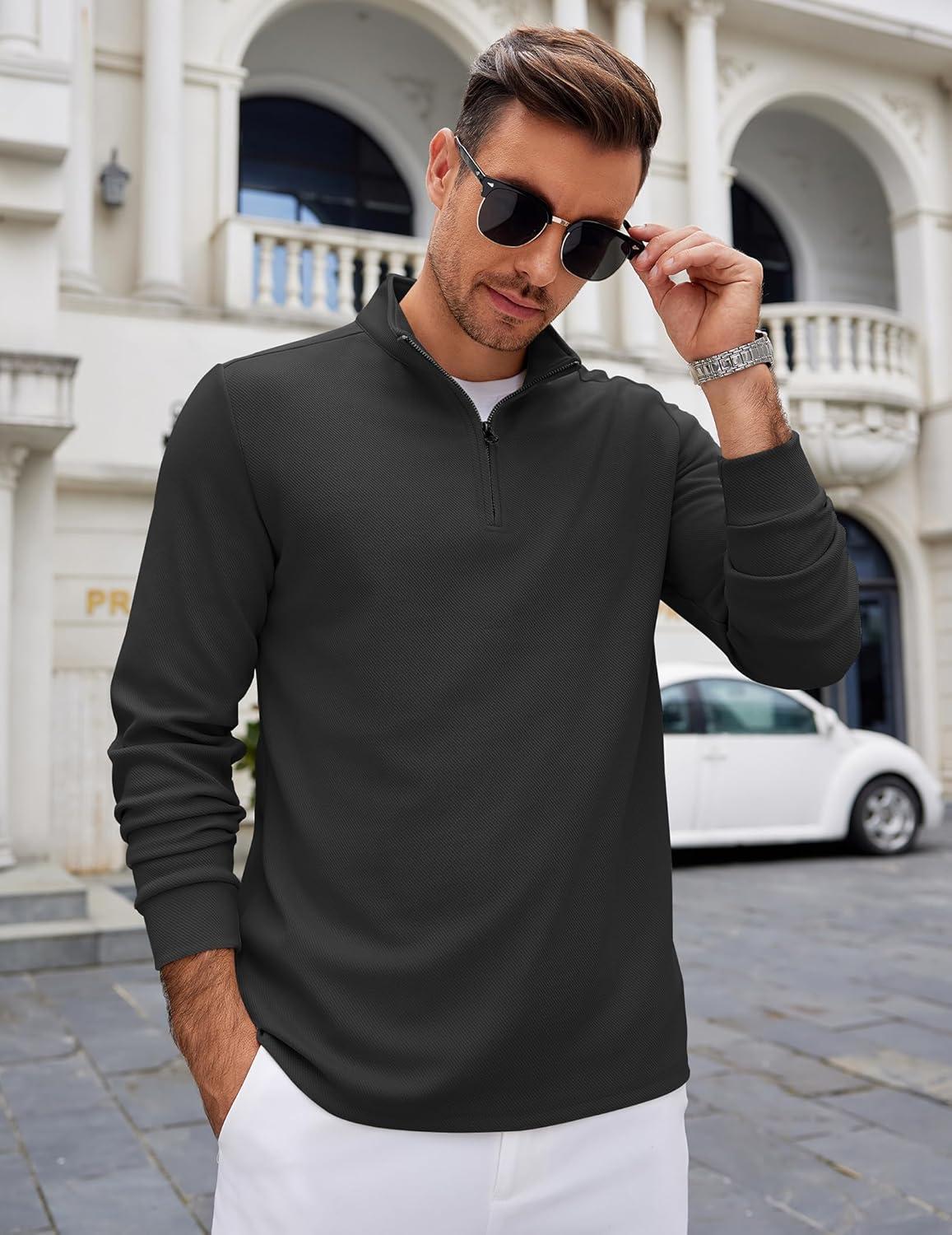 COOFANDY Men’s Quarter Zip Up Pullover Lightweight Mock Neck Sweatshirt Casual Long Sleeve Polo Shirt(Drak Grey)