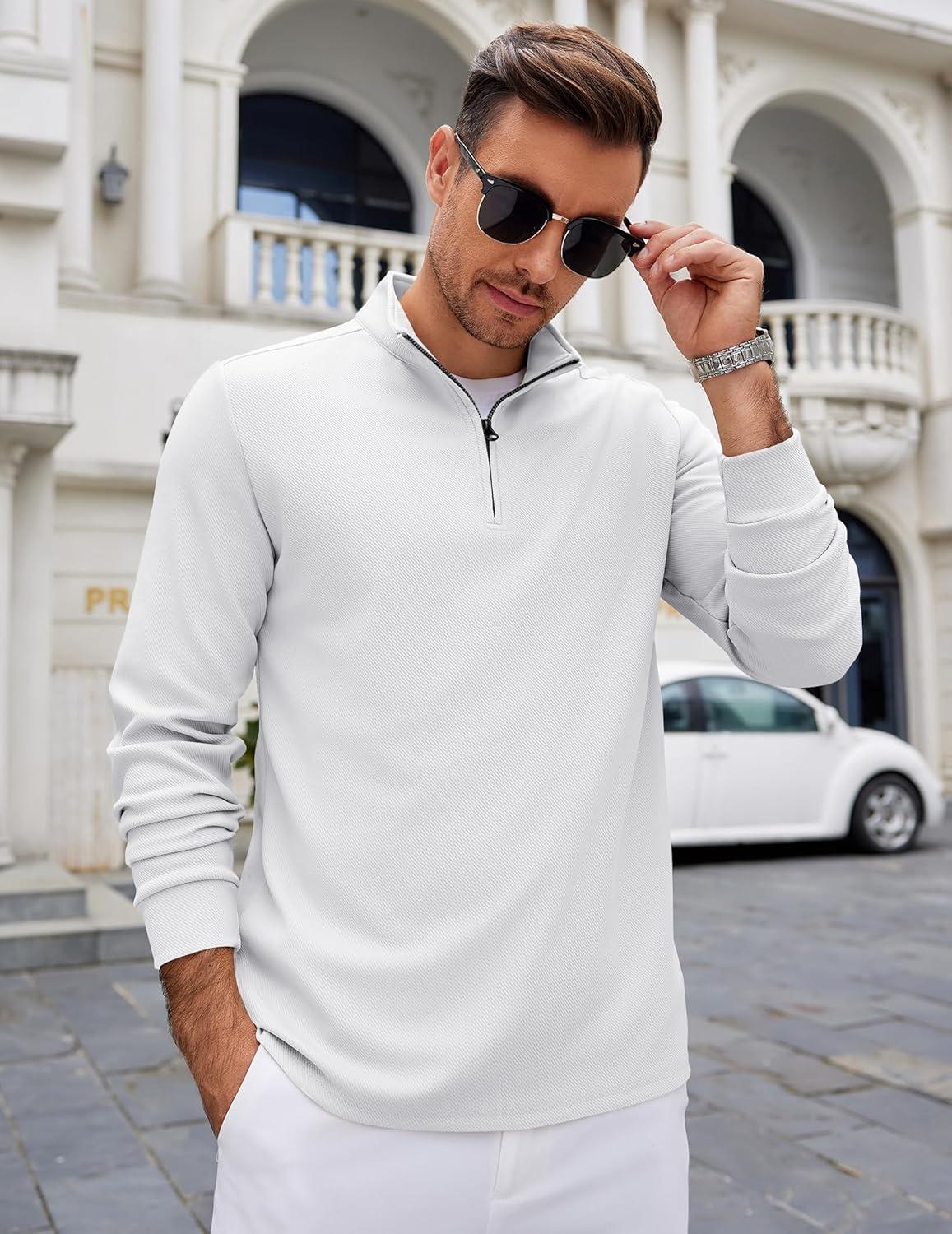 COOFANDY Men’s Quarter Zip Up Pullover Lightweight Mock Neck Sweatshirt Casual Long Sleeve Polo Shirt(White)