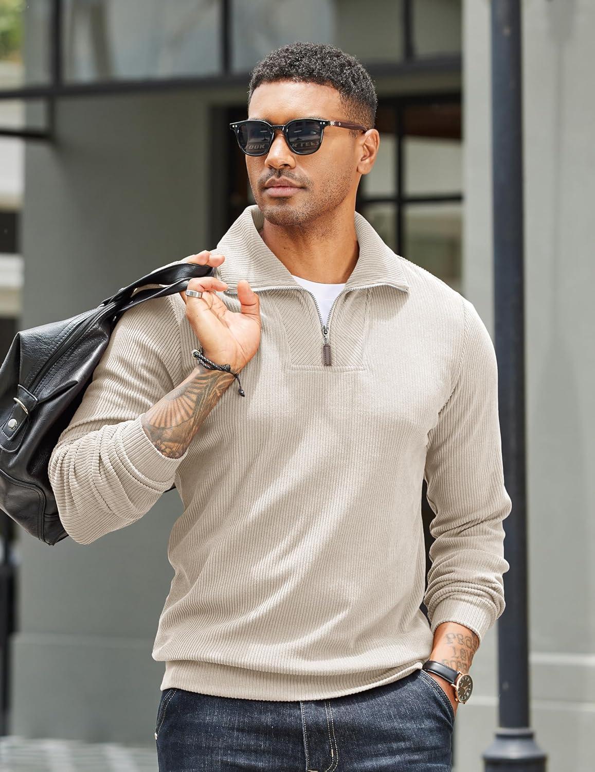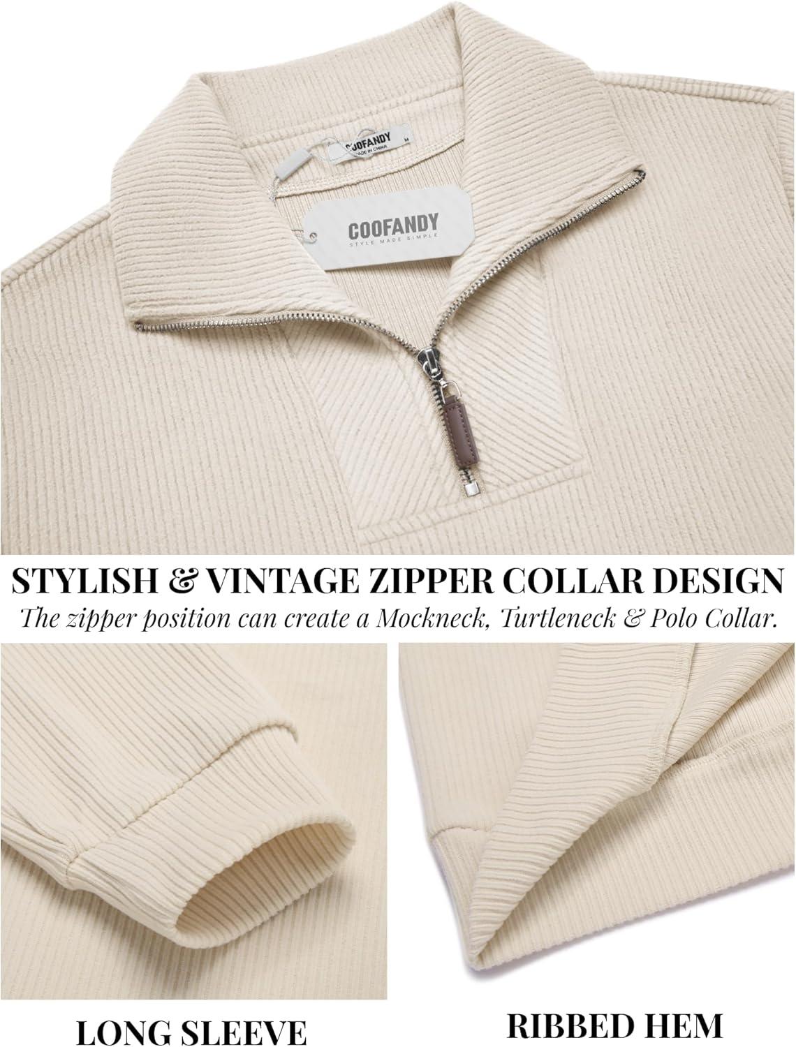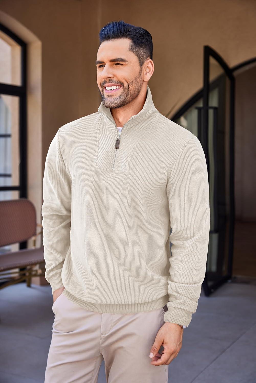 COOFANDY Men’s Quarter Zip Up Pullover Mock Neck Long Sleeve Sweater Casual Corduroy Polo Sweatshirt(Beige)