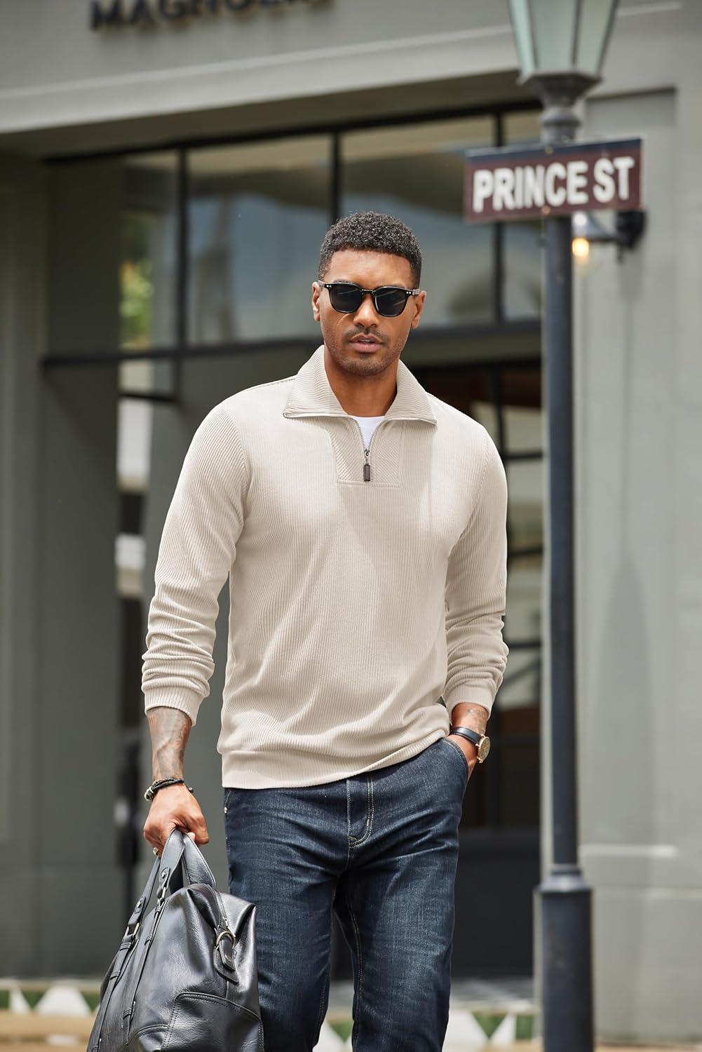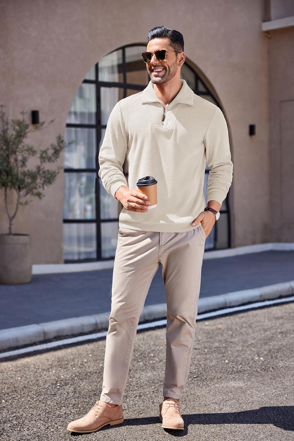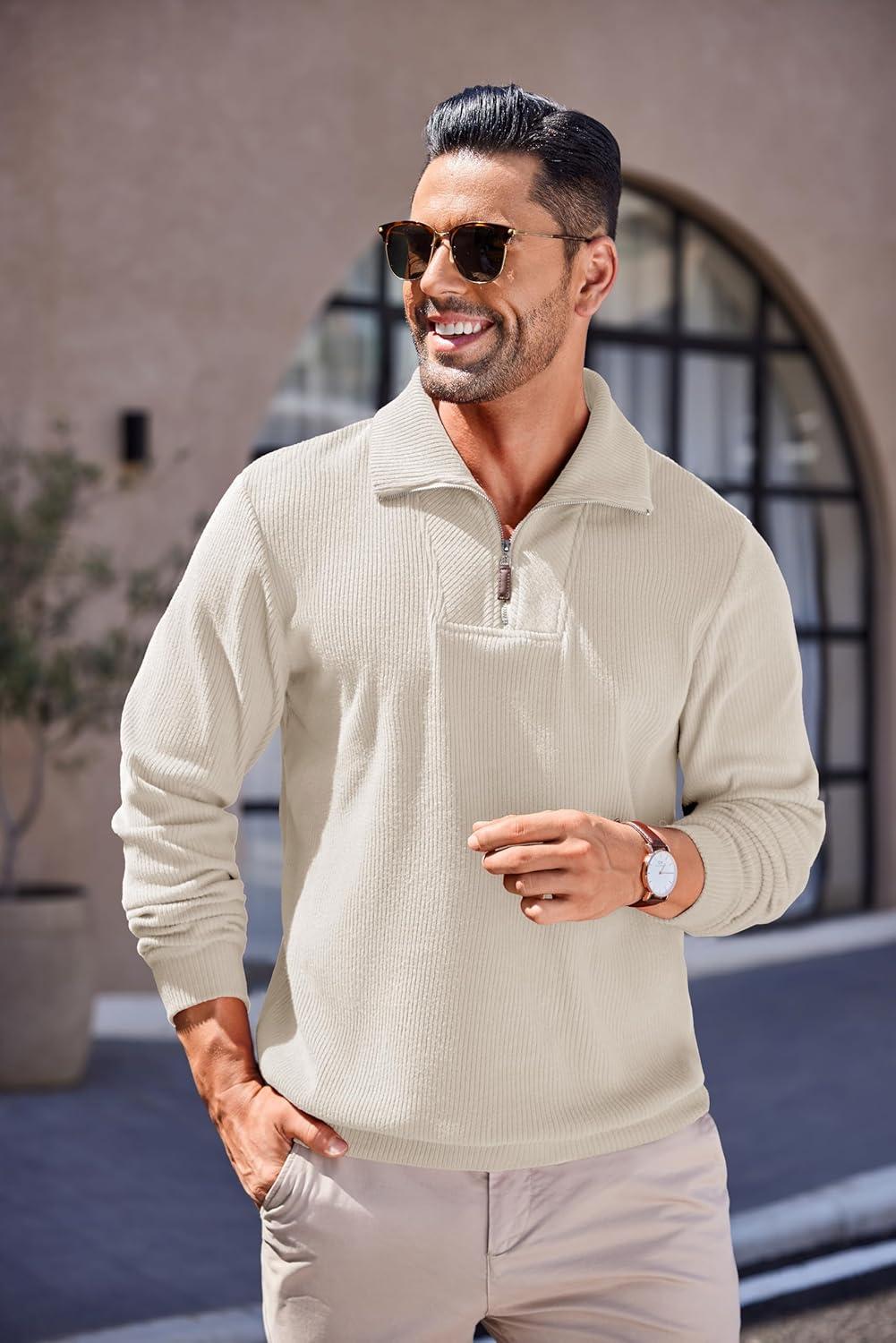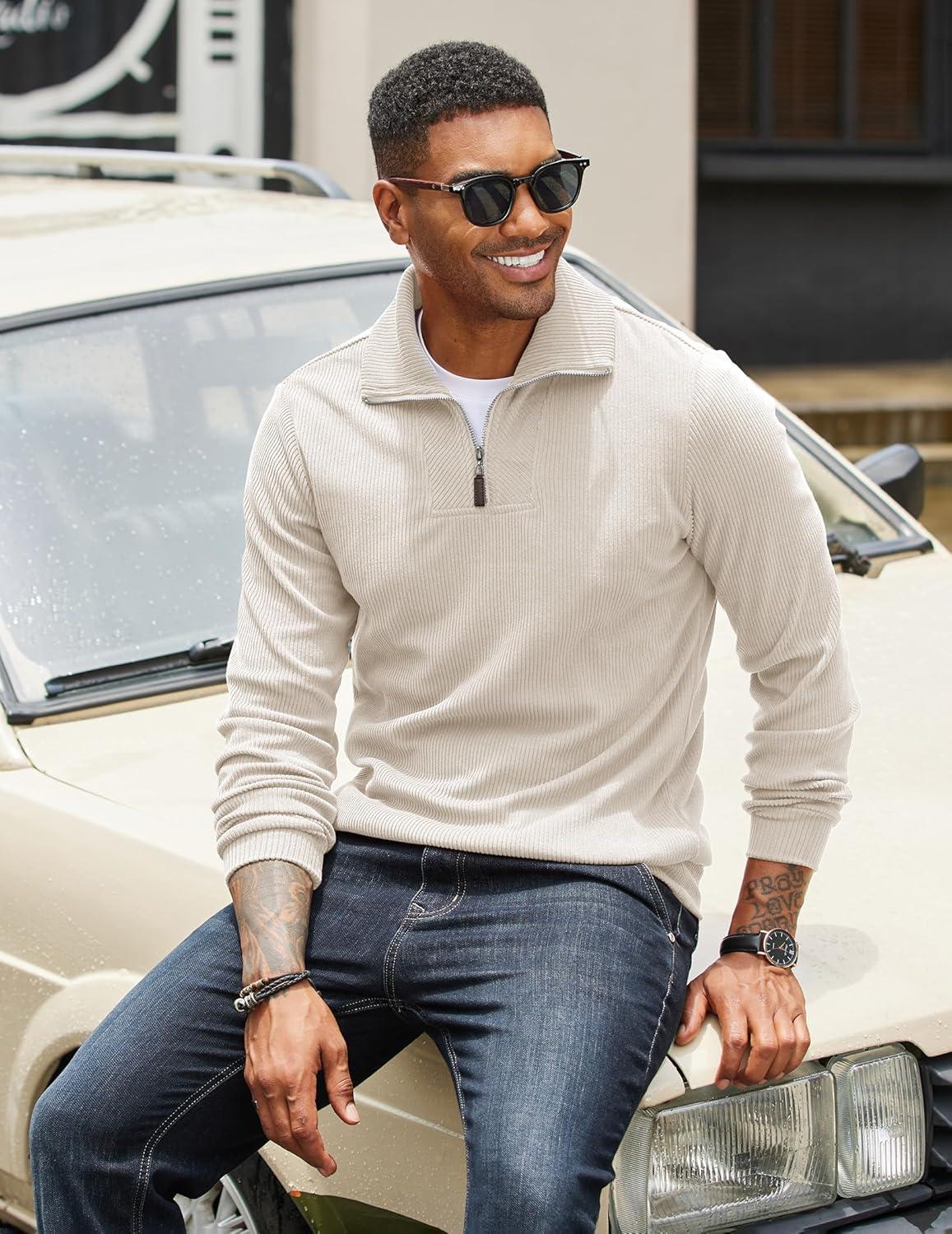 COOFANDY Men’s Quarter Zip Up Pullover Mock Neck Long Sleeve Sweater Casual Corduroy Polo Sweatshirt(Beige)