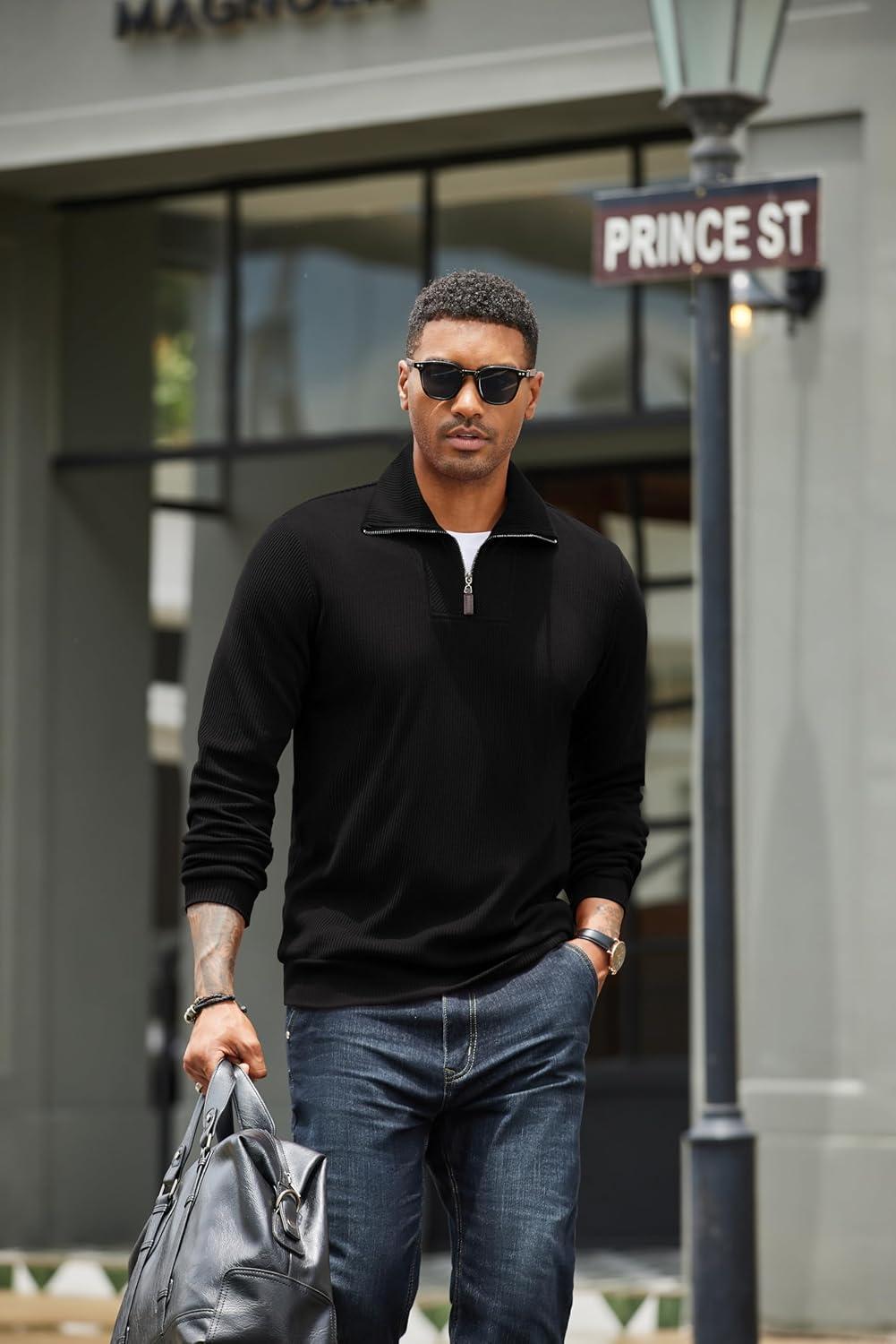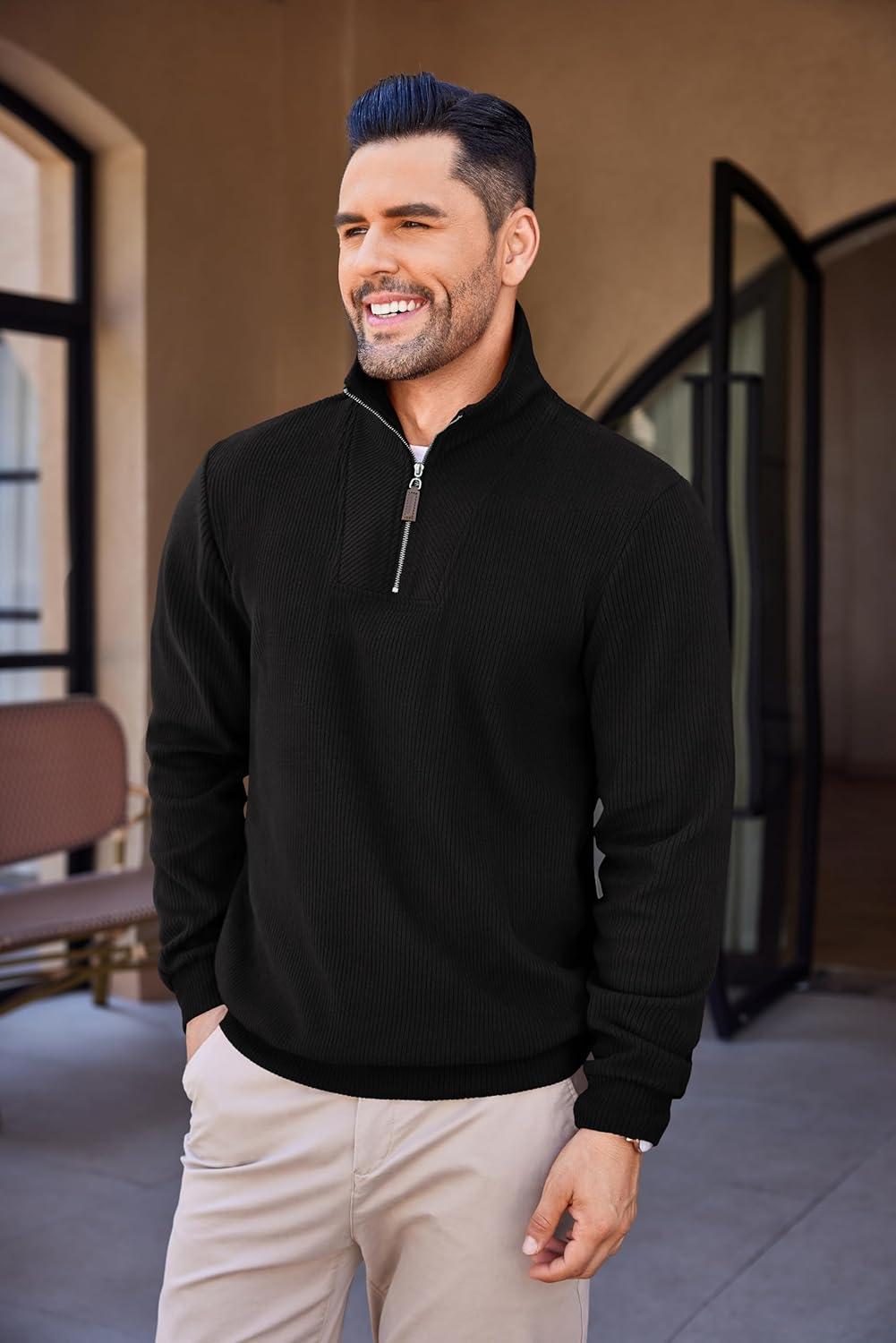 COOFANDY Men’s Quarter Zip Up Pullover Mock Neck Long Sleeve Sweater Casual Corduroy Polo Sweatshirt(Black)