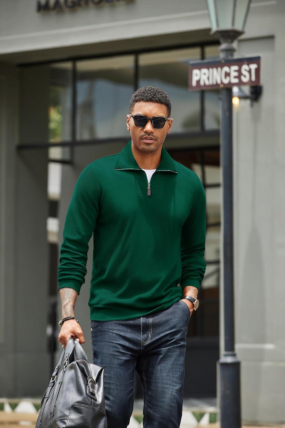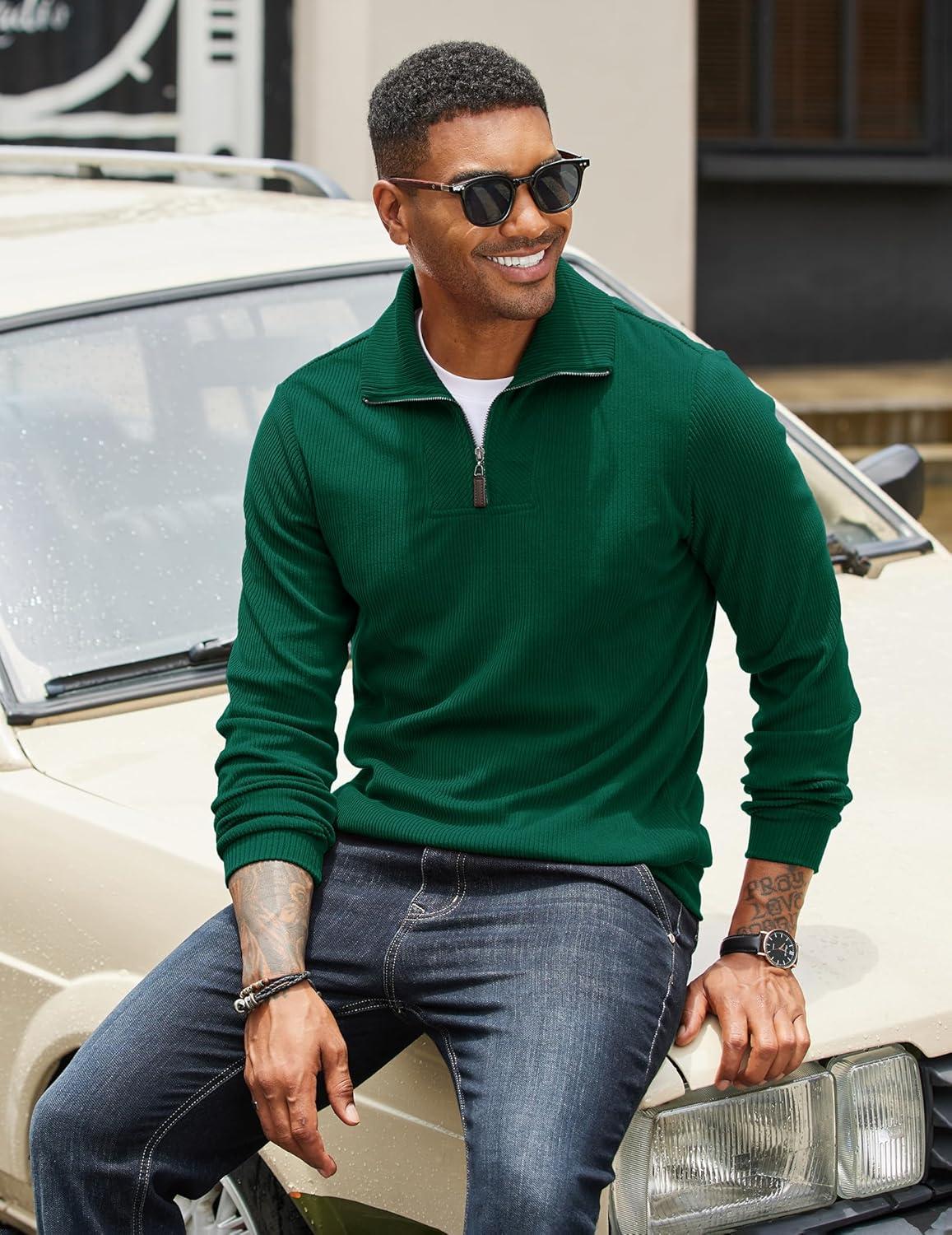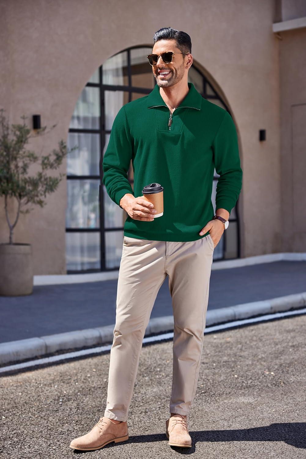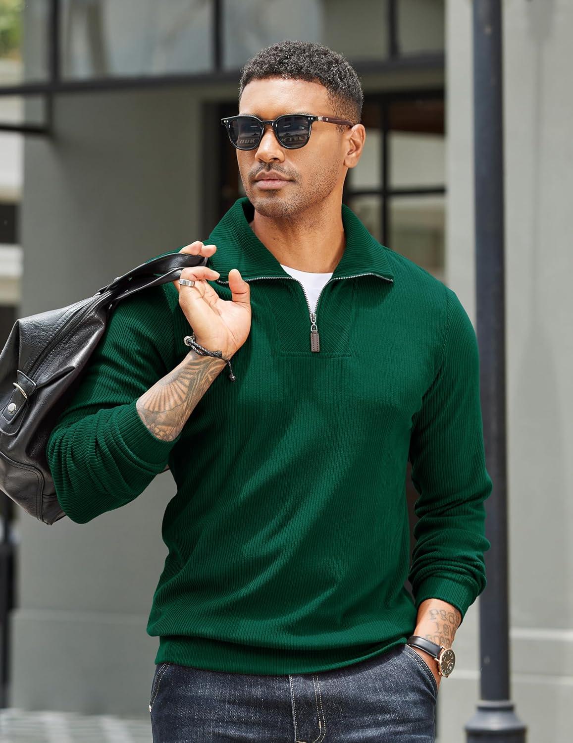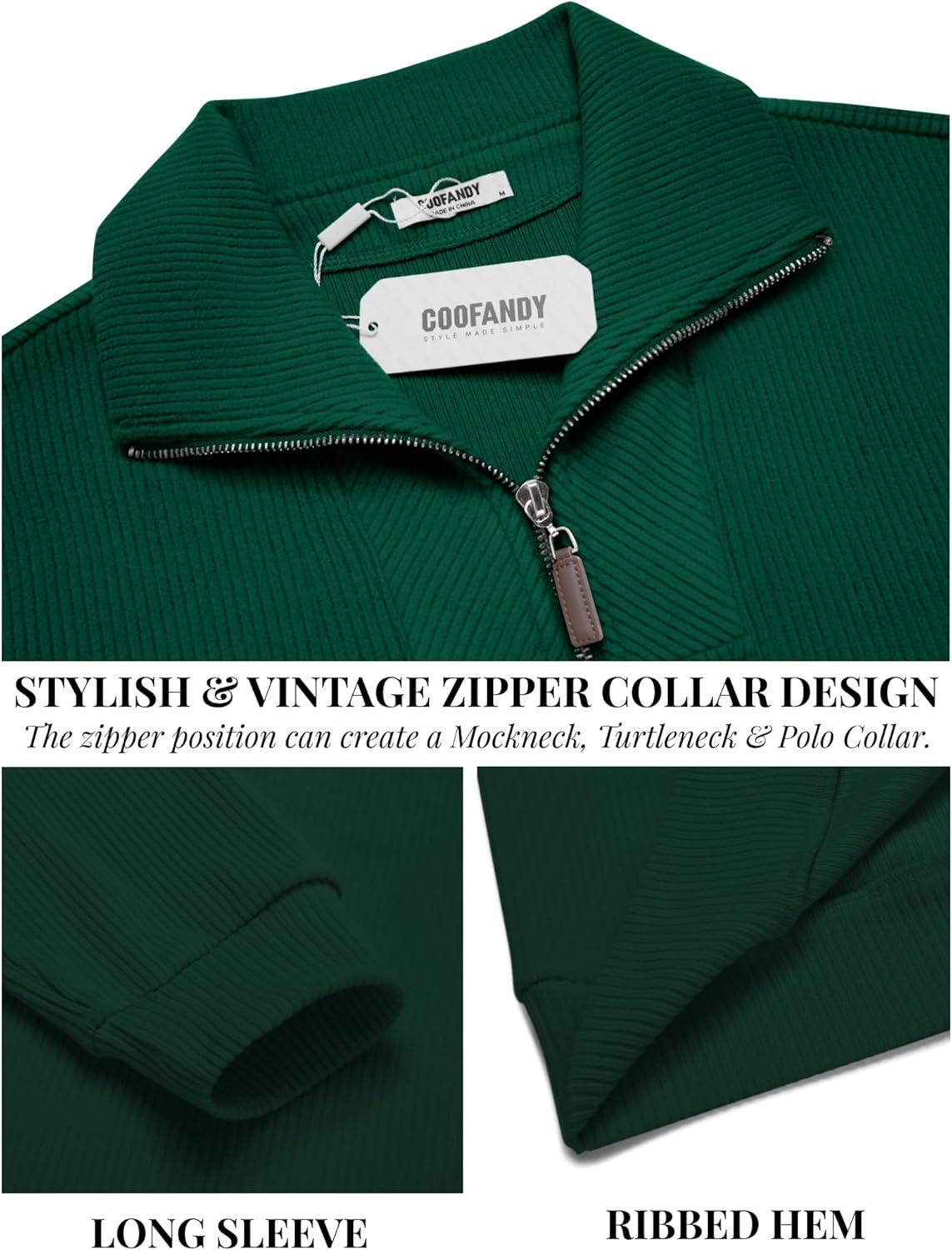 COOFANDY Men’s Quarter Zip Up Pullover Mock Neck Long Sleeve Sweater Casual Corduroy Polo Sweatshirt(Dark Green)