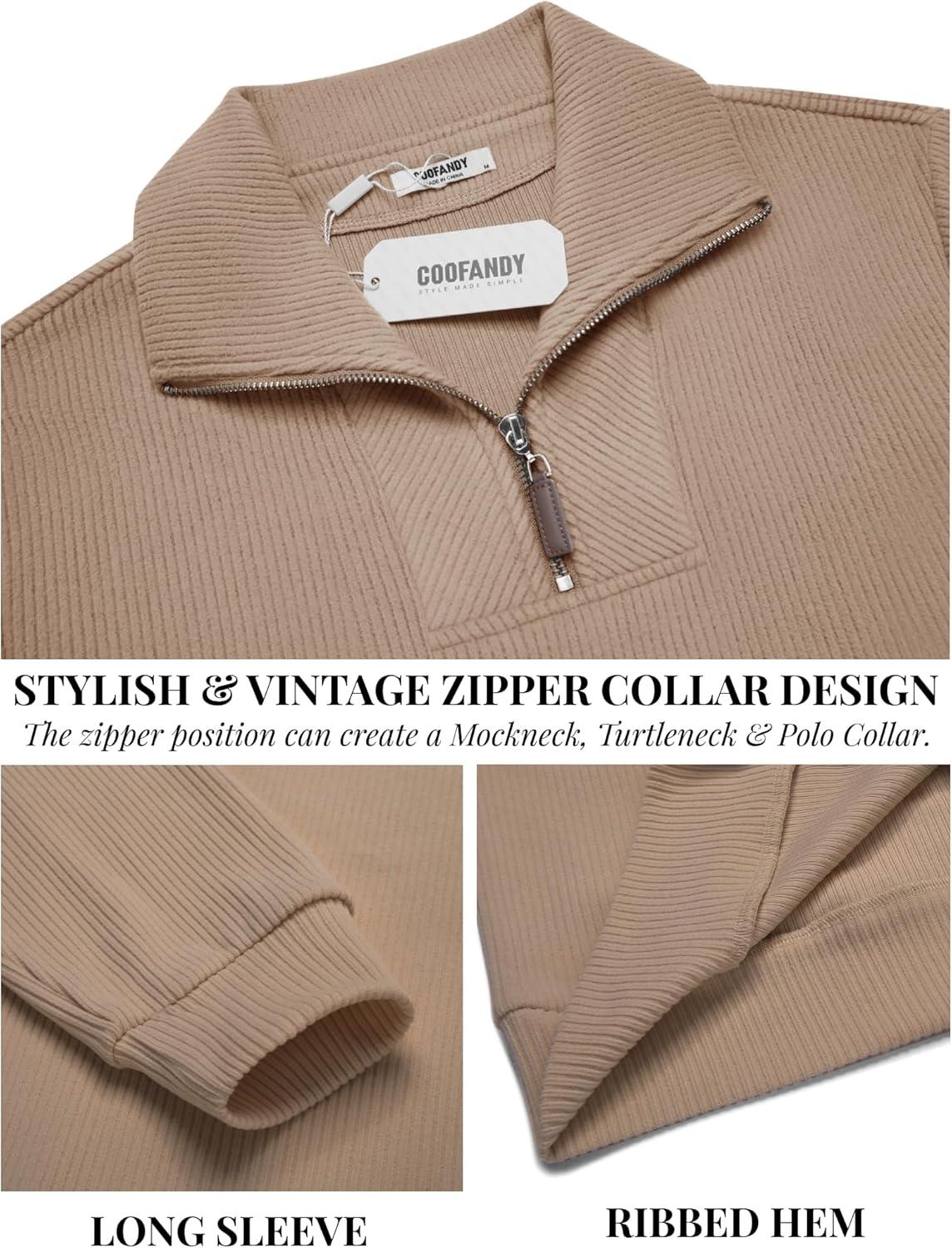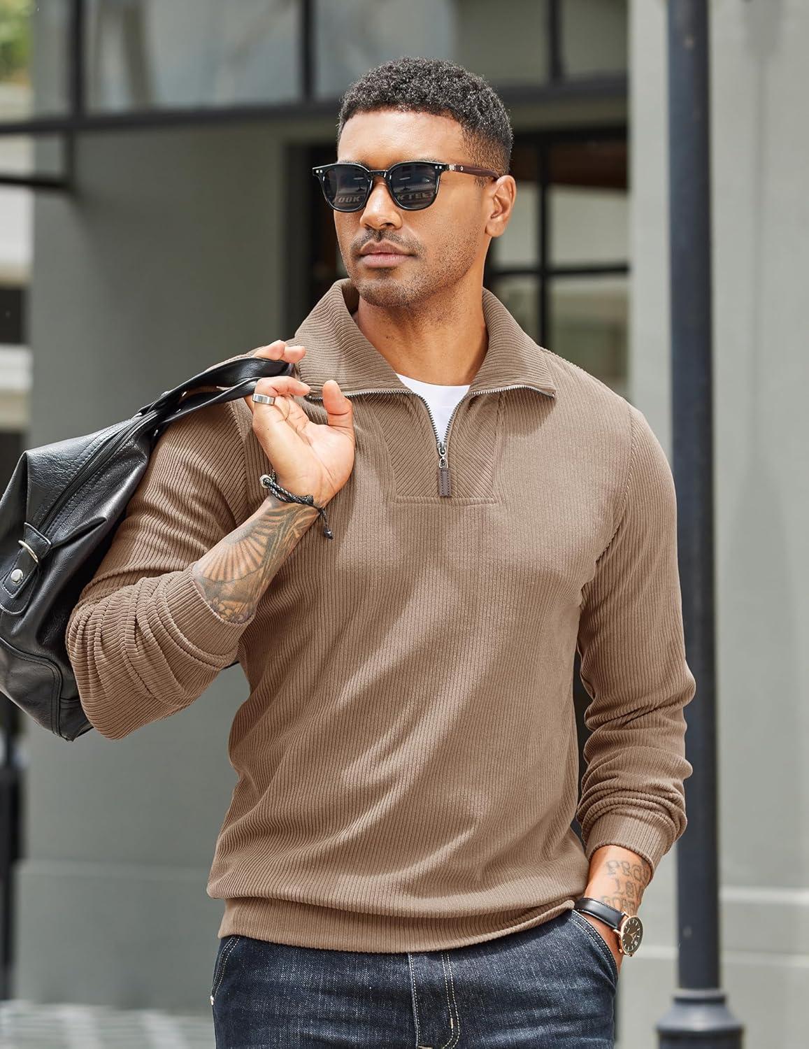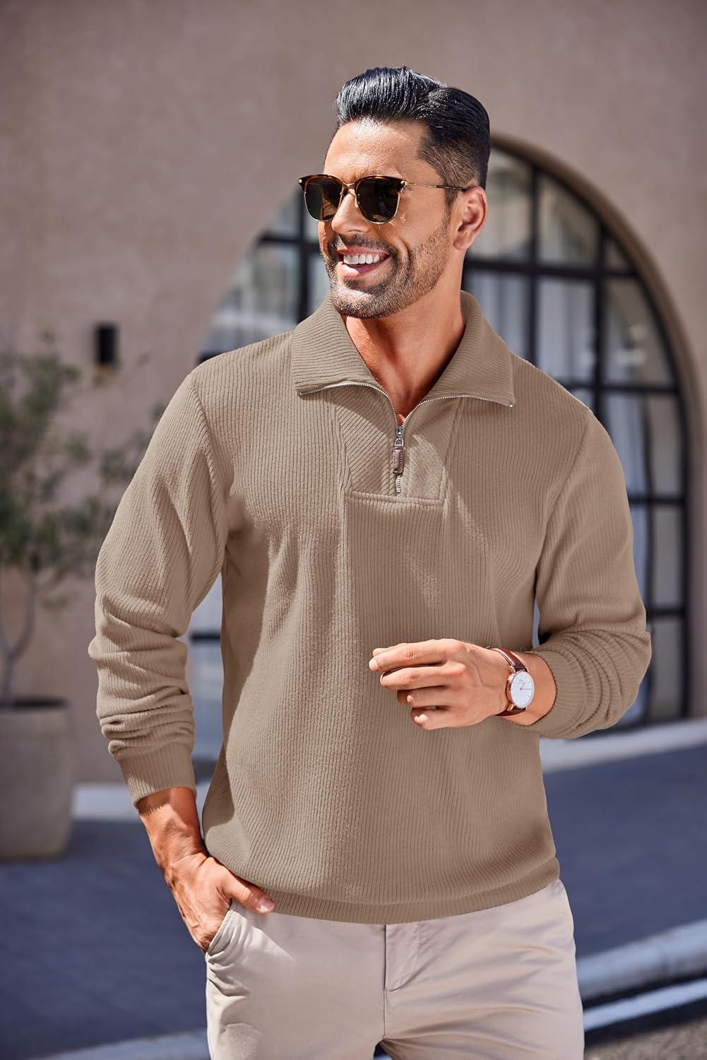 COOFANDY Men’s Quarter Zip Up Pullover Mock Neck Long Sleeve Sweater Casual Corduroy Polo Sweatshirt(Khaki)