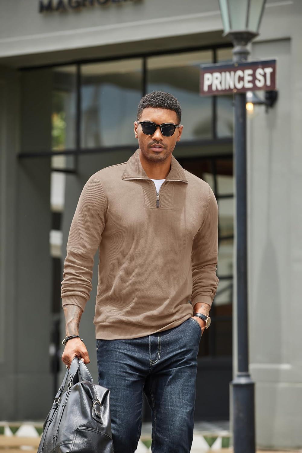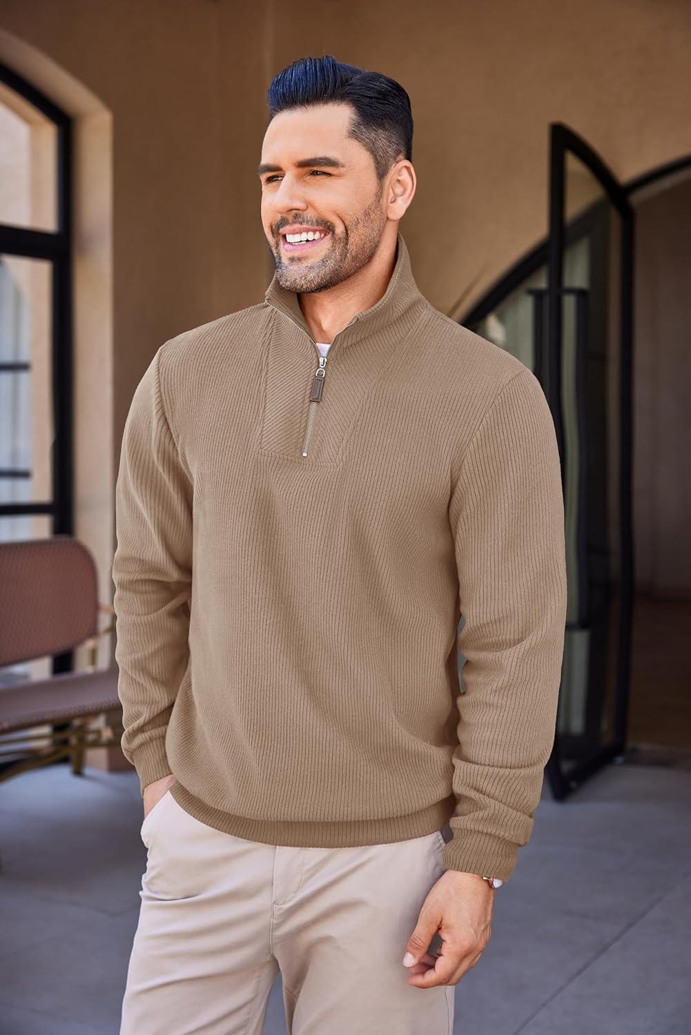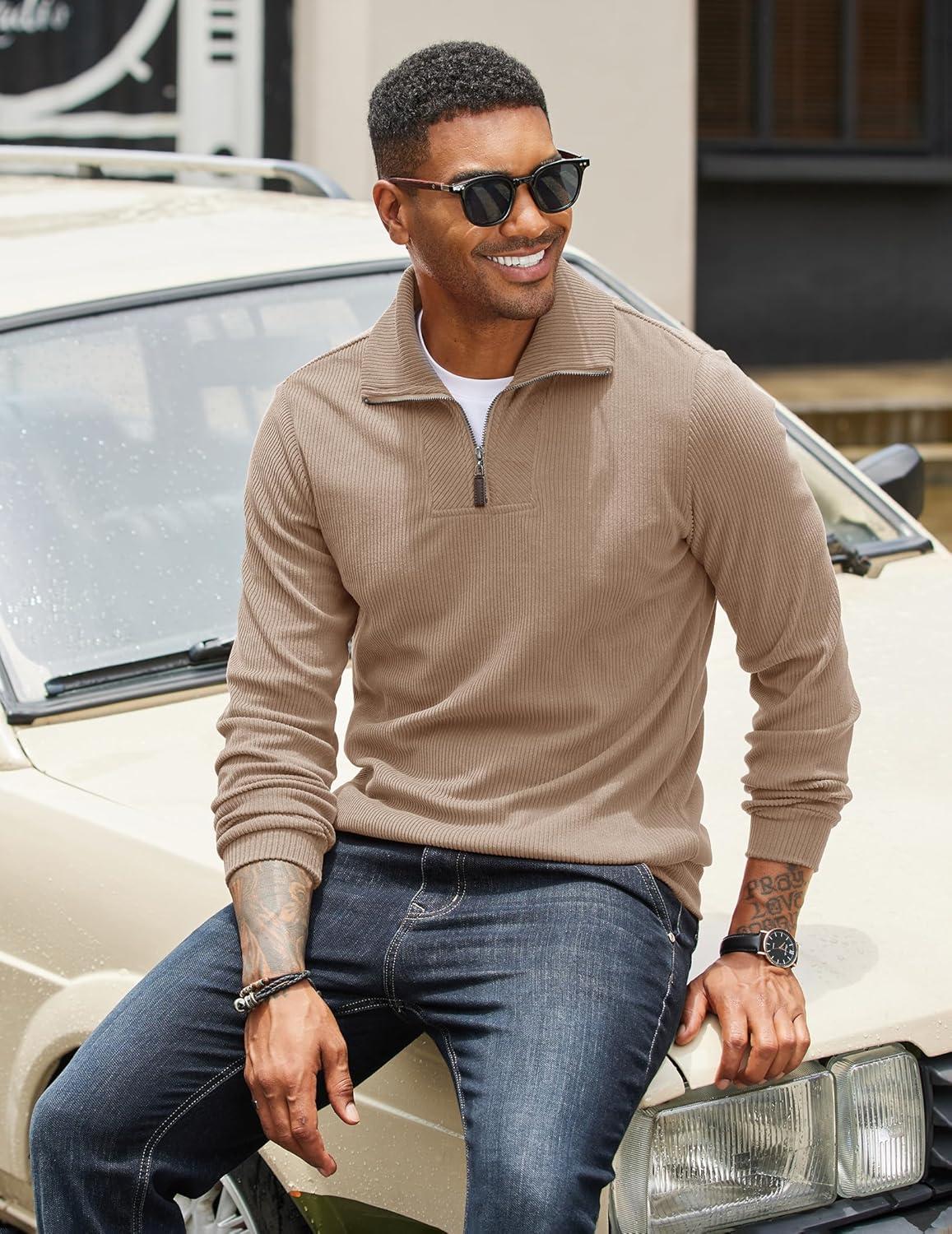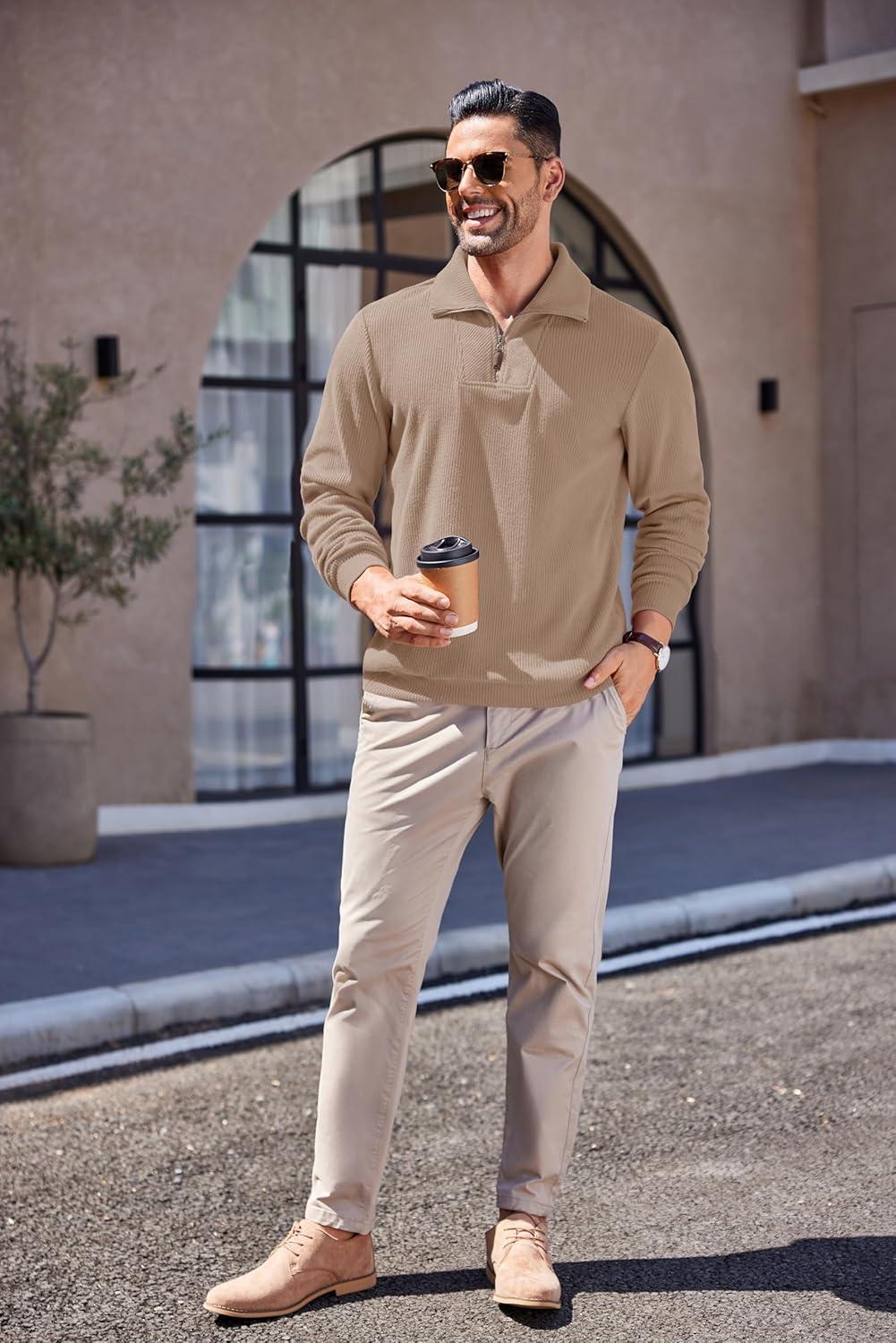 COOFANDY Men’s Quarter Zip Up Pullover Mock Neck Long Sleeve Sweater Casual Corduroy Polo Sweatshirt(Khaki)