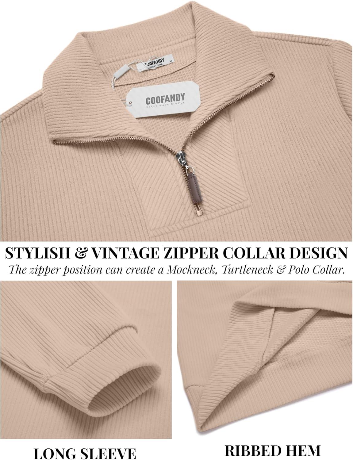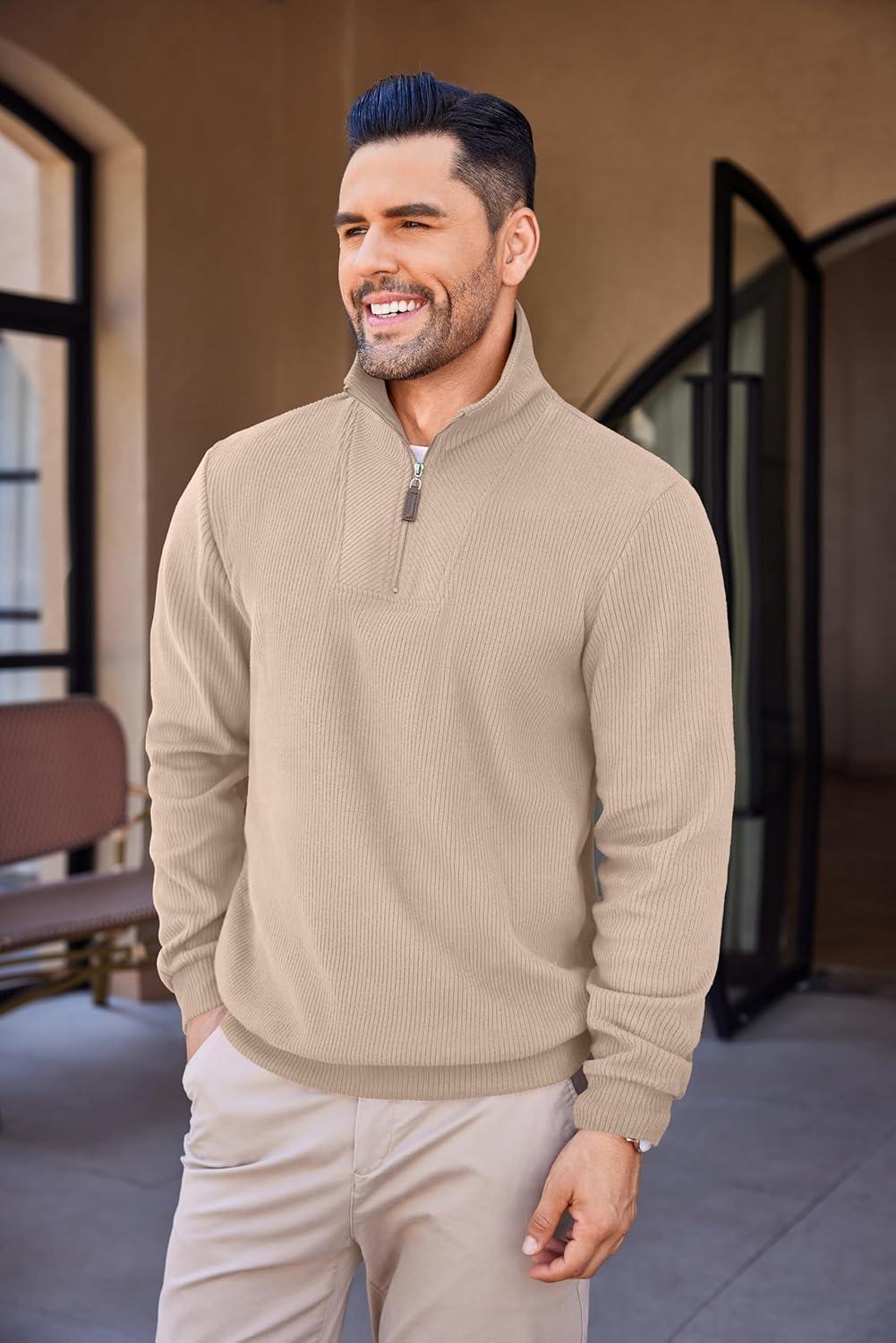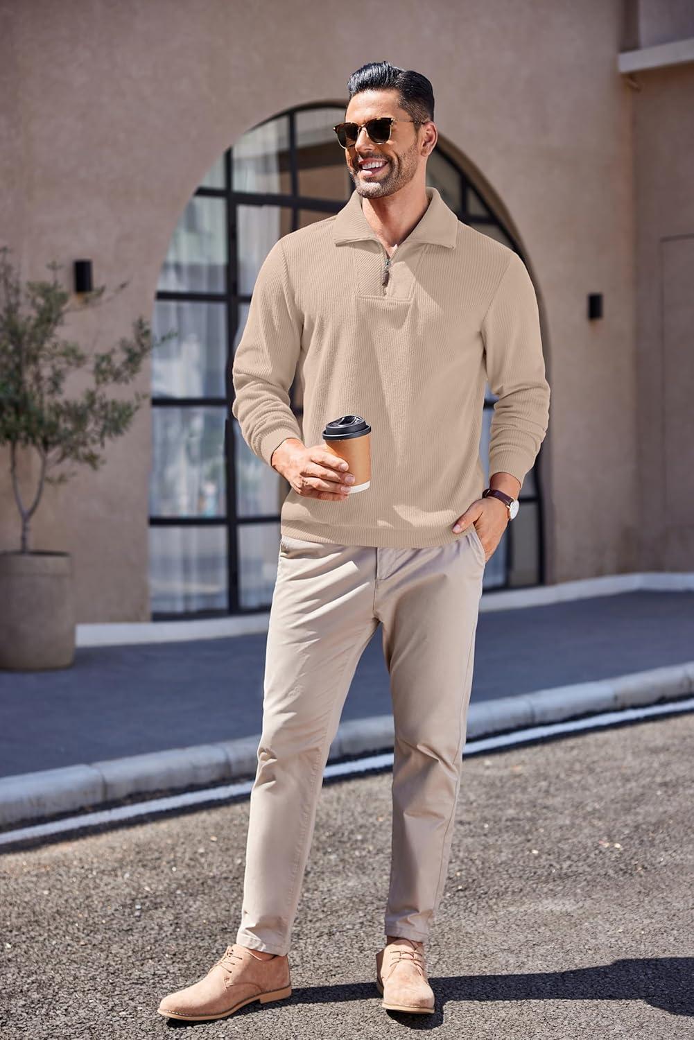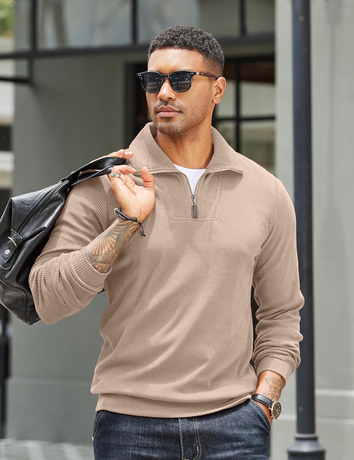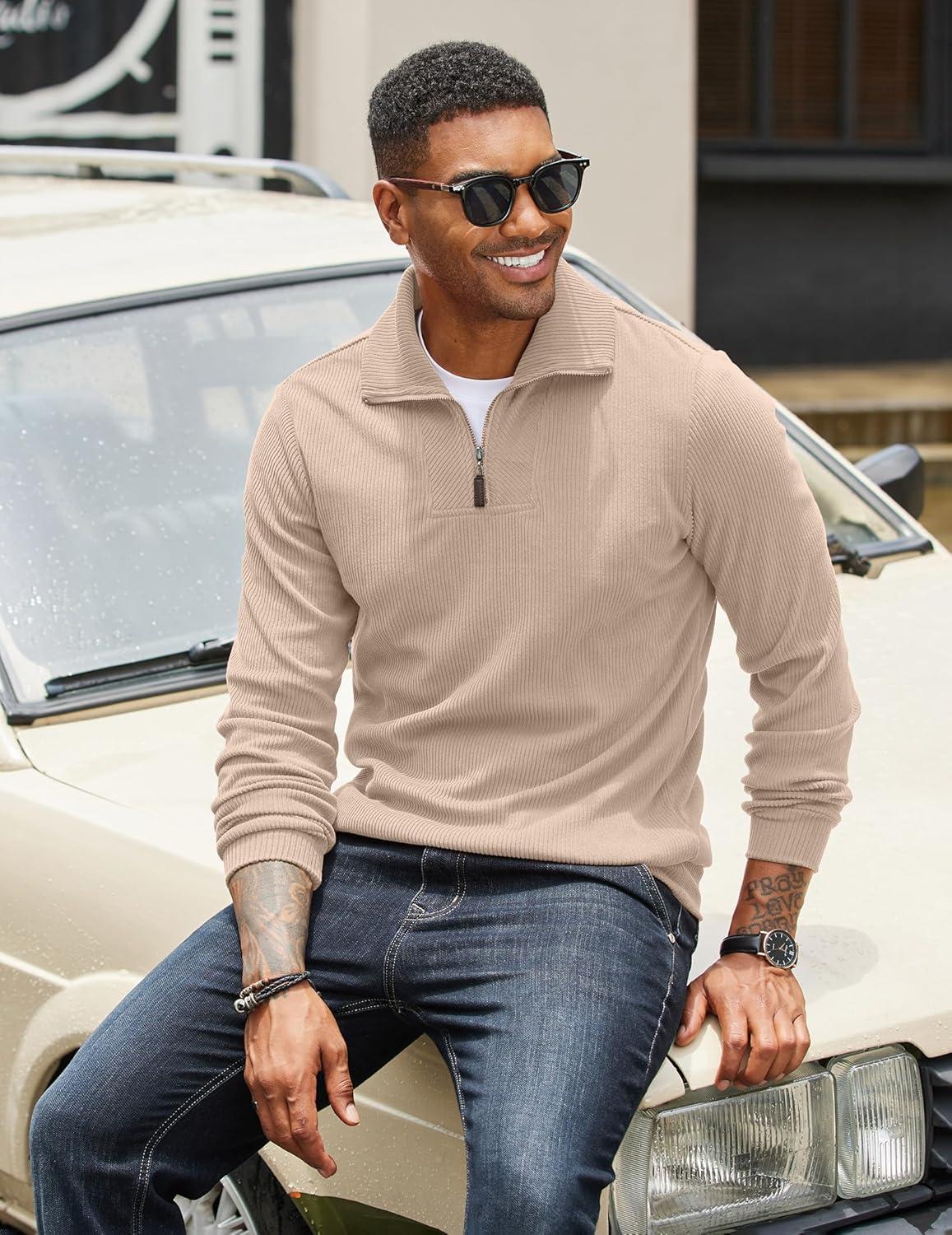 COOFANDY Men’s Quarter Zip Up Pullover Mock Neck Long Sleeve Sweater Casual Corduroy Polo Sweatshirt(Light Khaki)