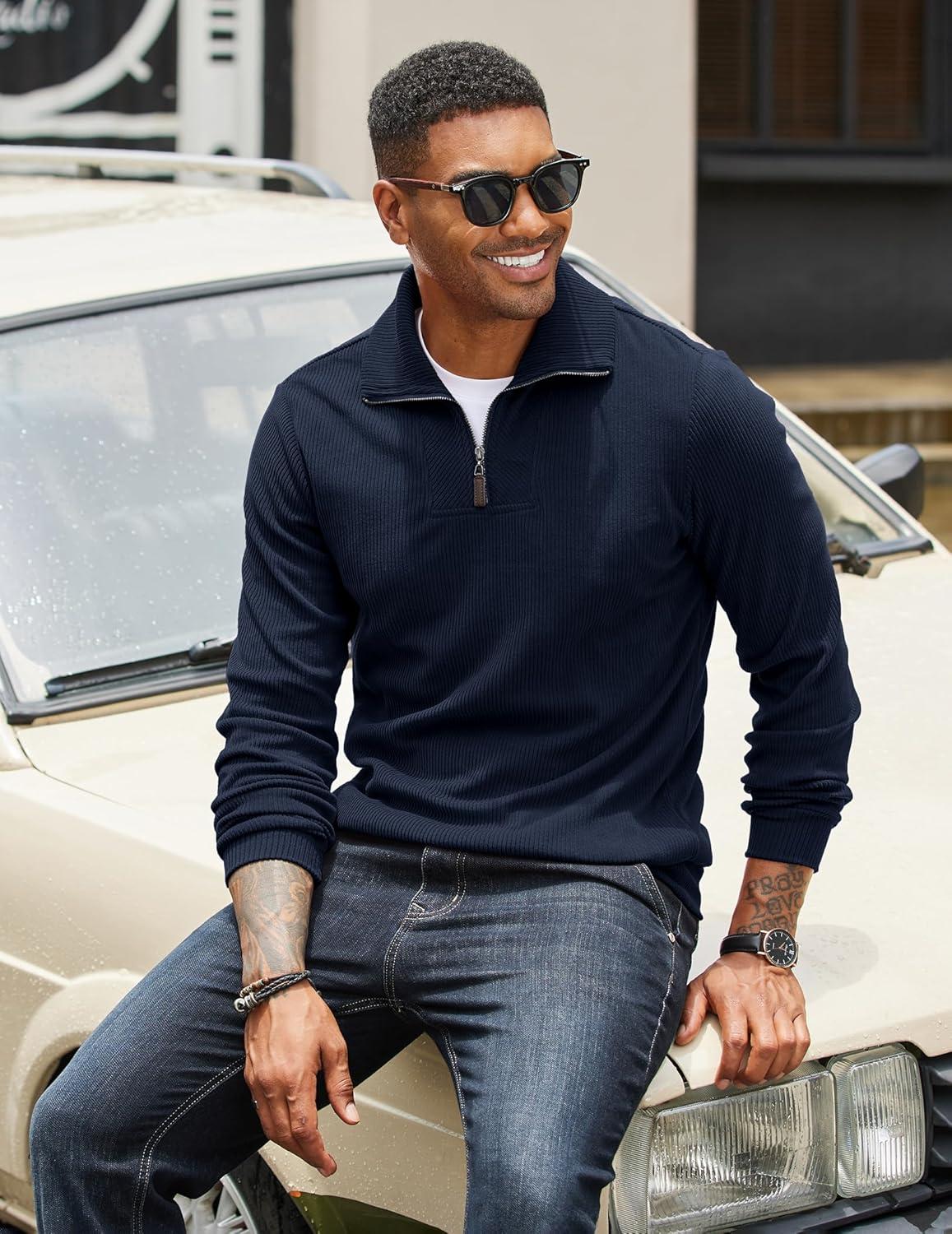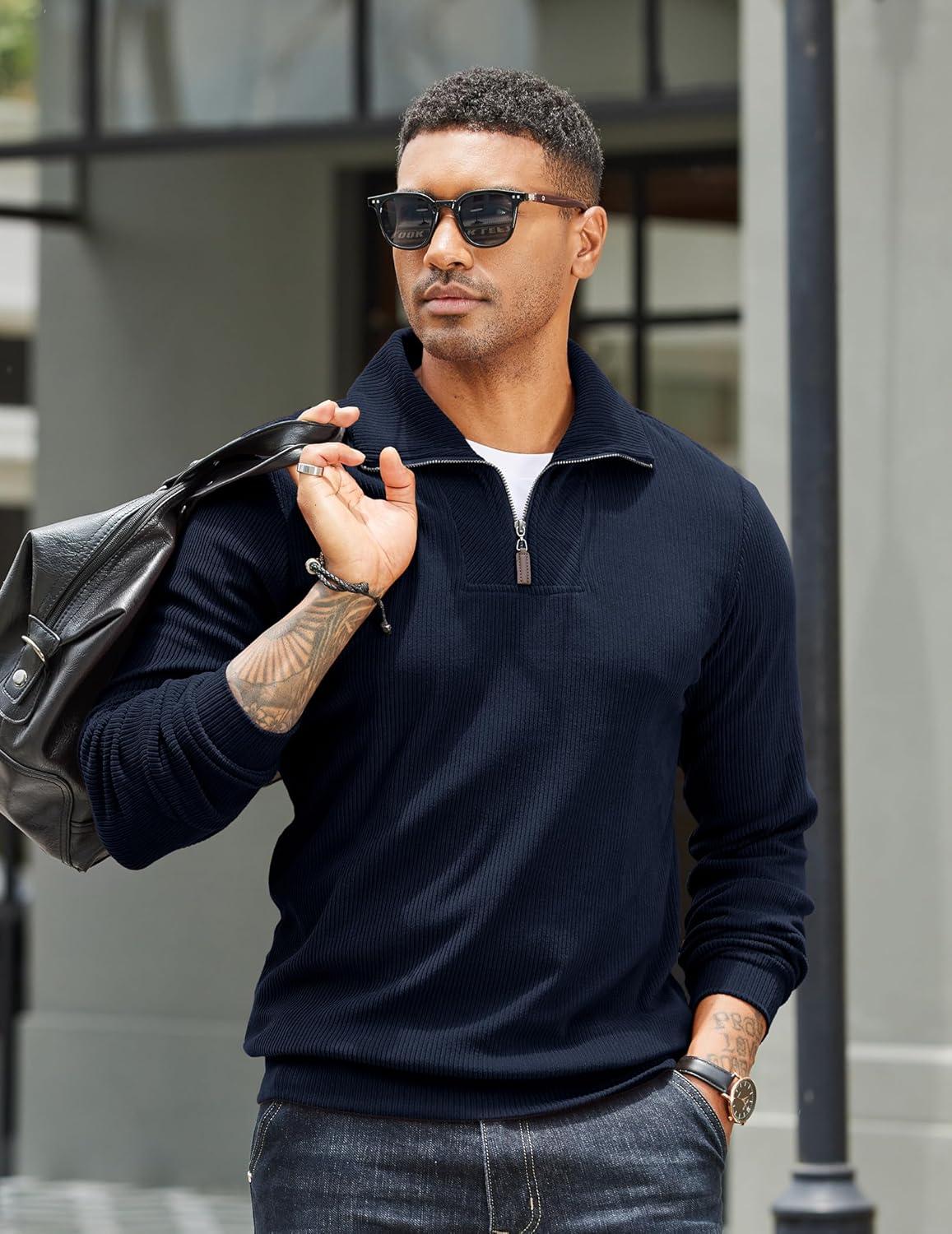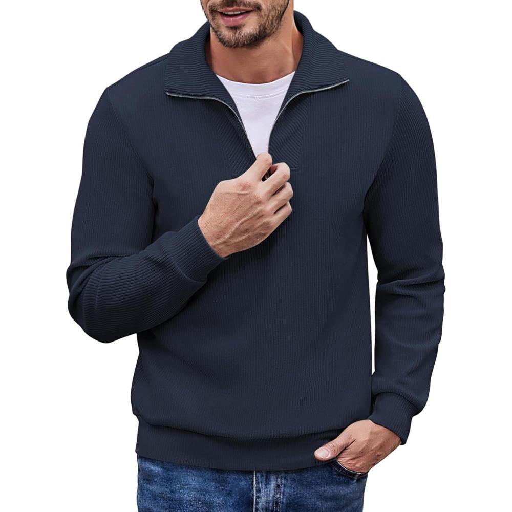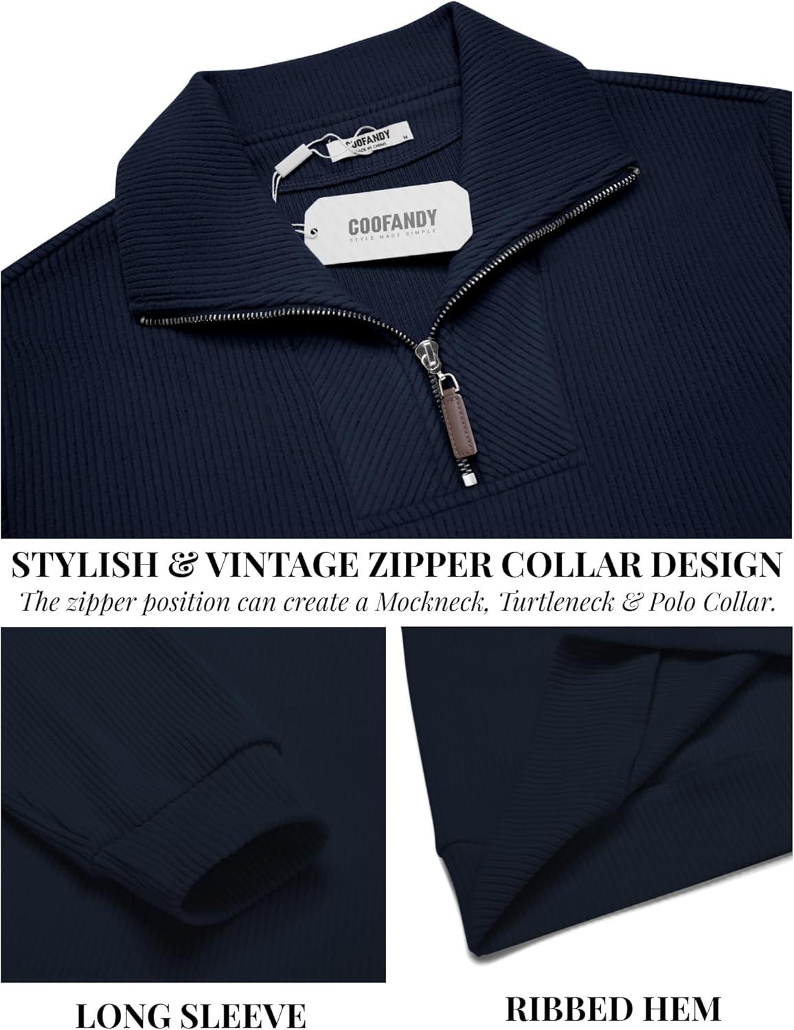 COOFANDY Men’s Quarter Zip Up Pullover Mock Neck Long Sleeve Sweater Casual Corduroy Polo Sweatshirt(Navy Blue)