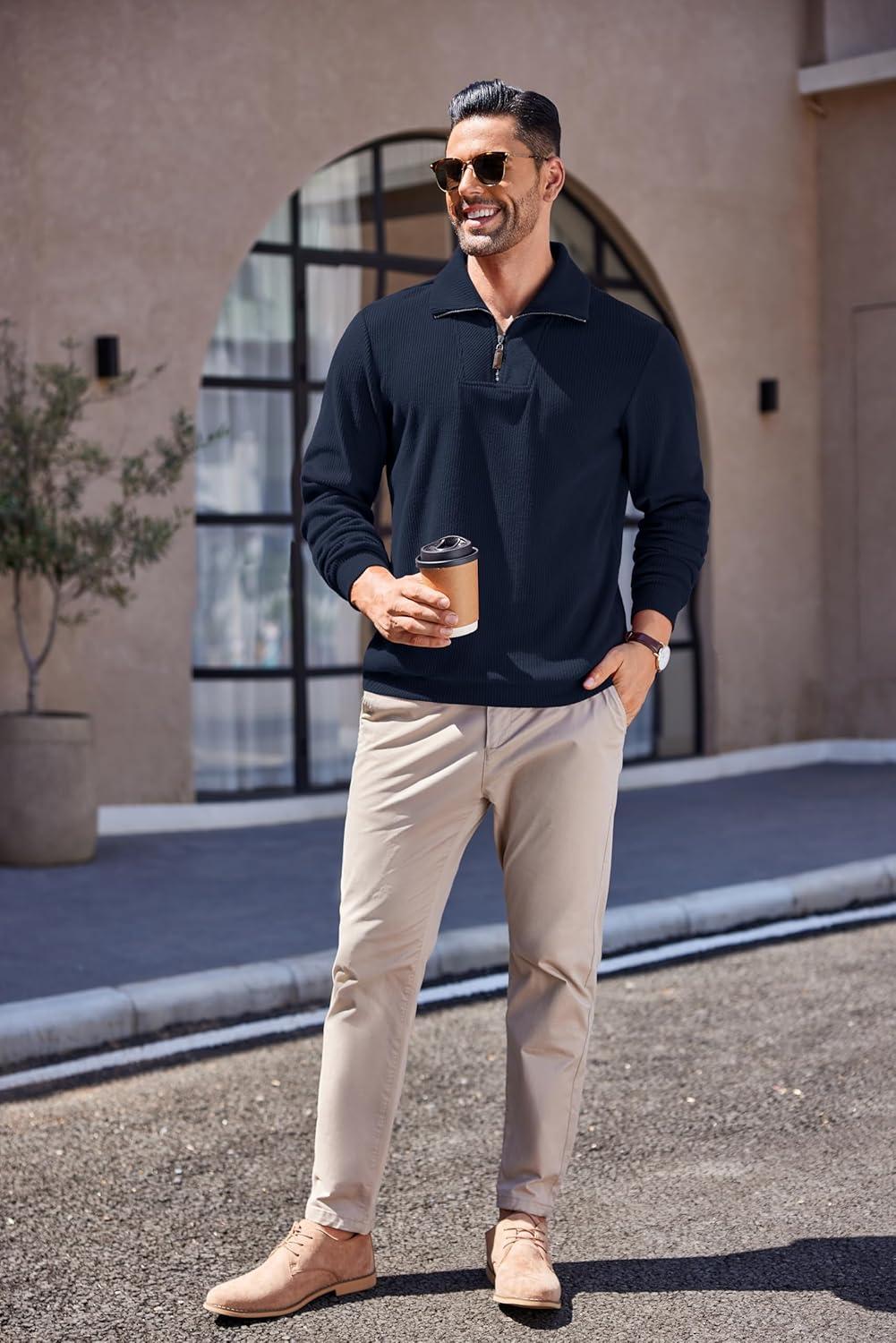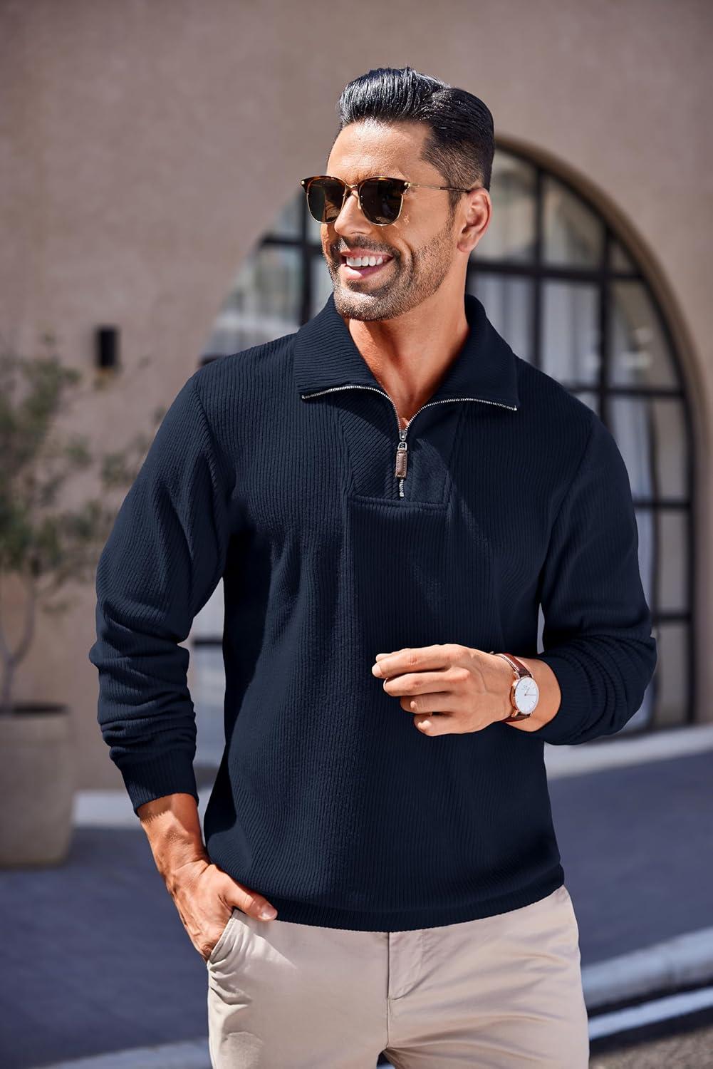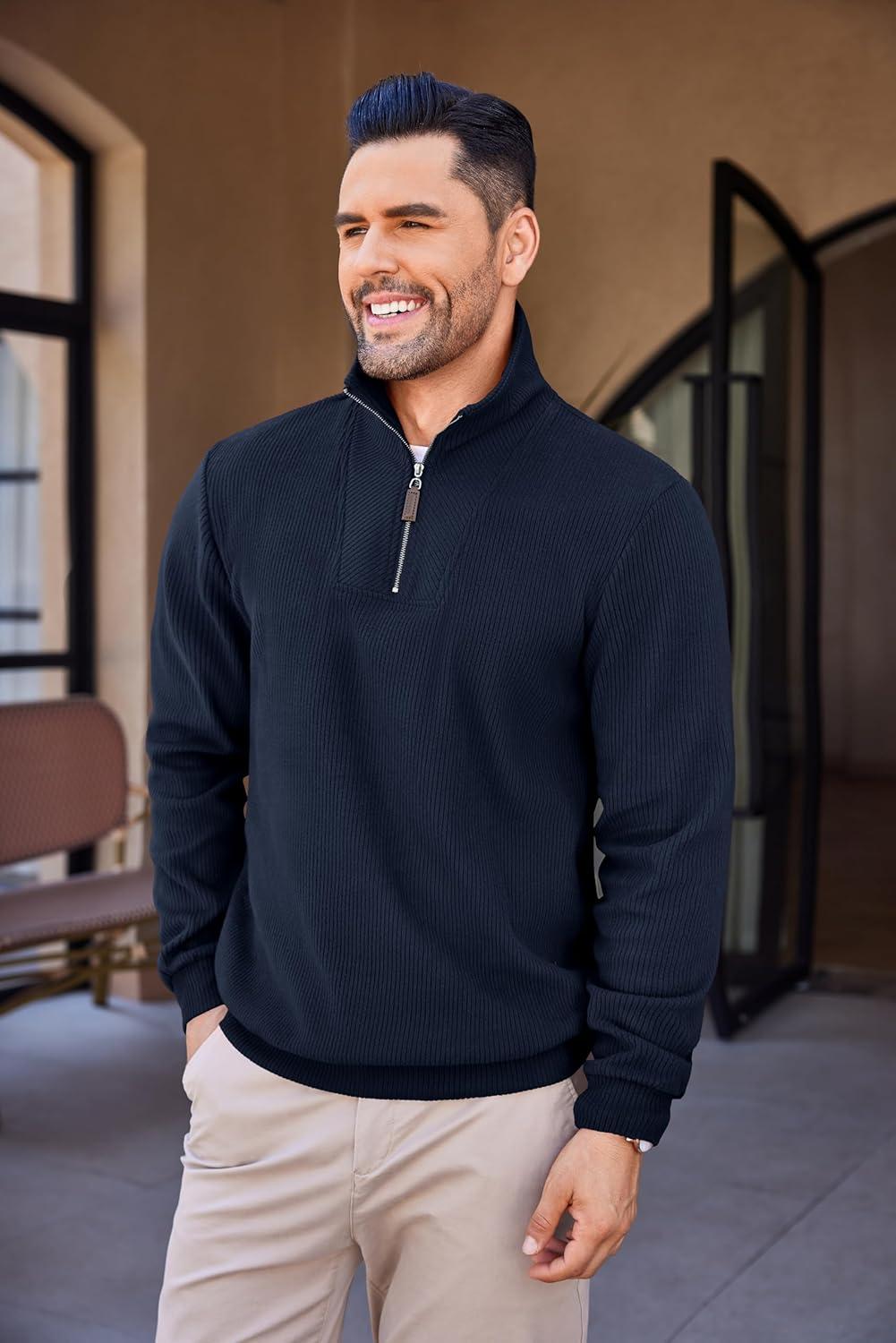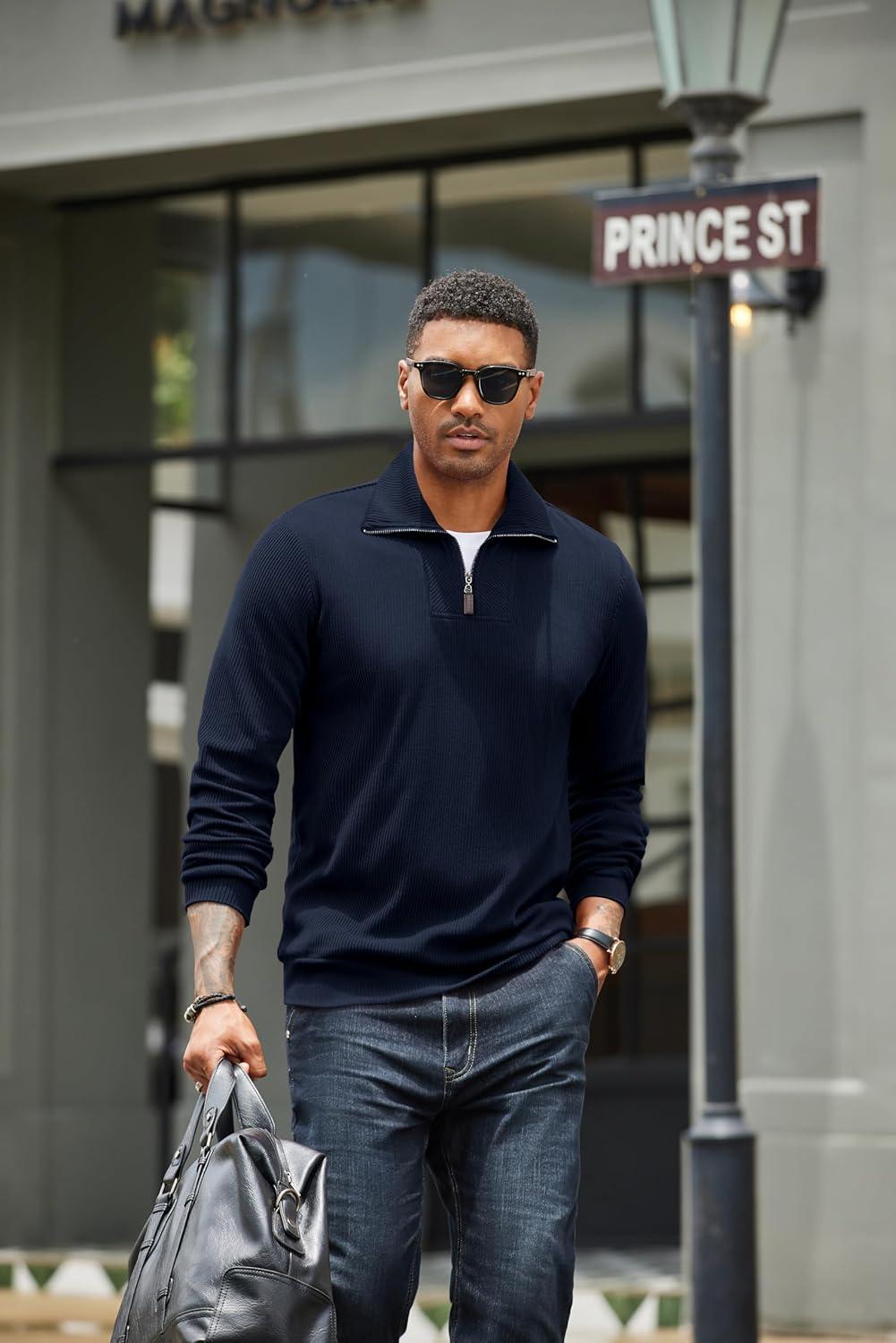 COOFANDY Men’s Quarter Zip Up Pullover Mock Neck Long Sleeve Sweater Casual Corduroy Polo Sweatshirt(Navy Blue)