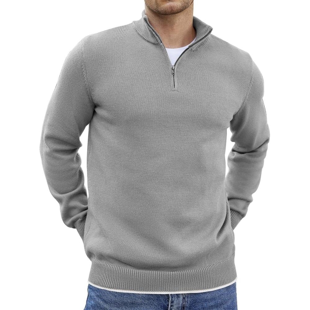 COOFANDY Men’s Quarter Zip Up Pullover Slim Fit Lightweight Mock Neck Long Sleeve Sweaters(Light Gray)