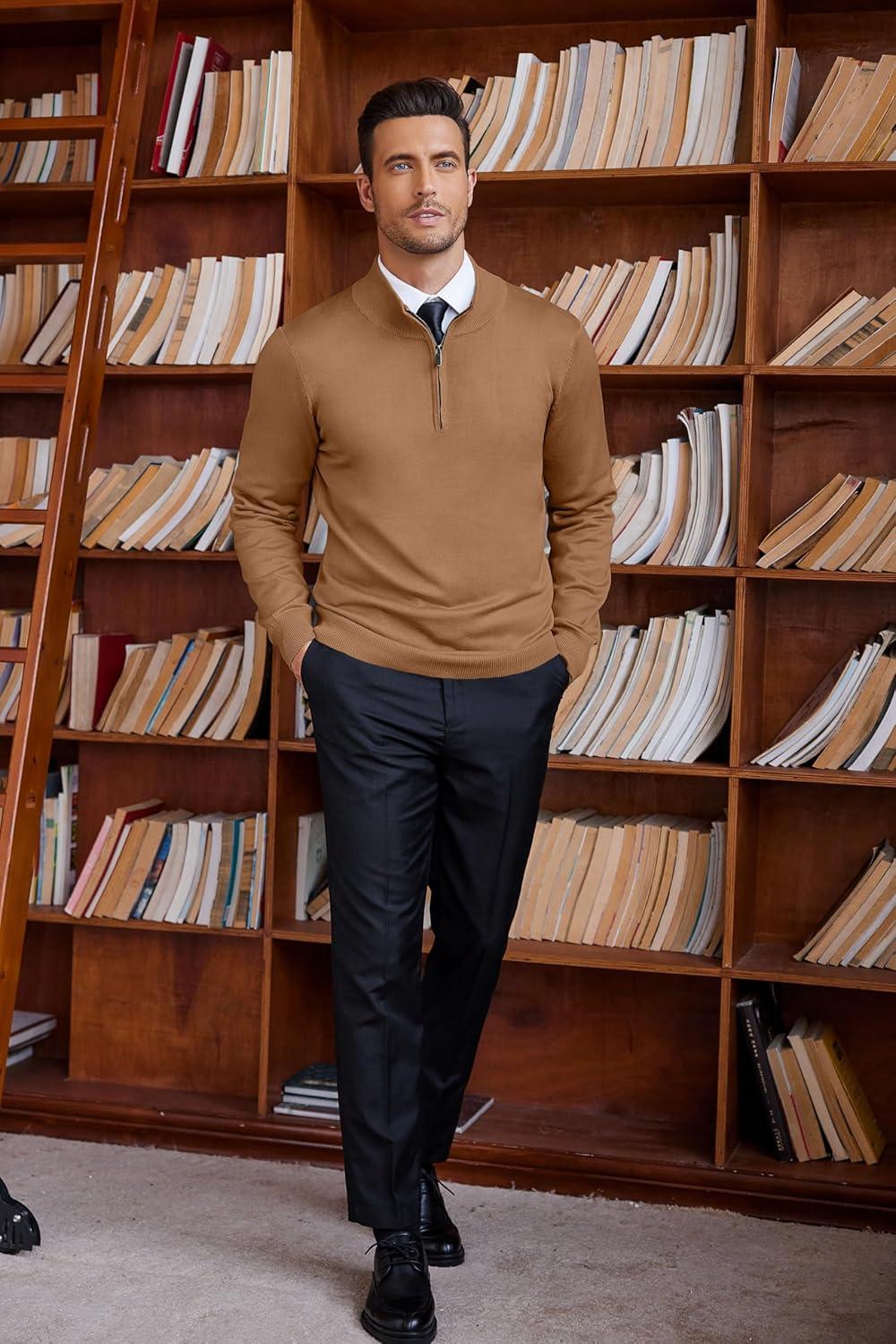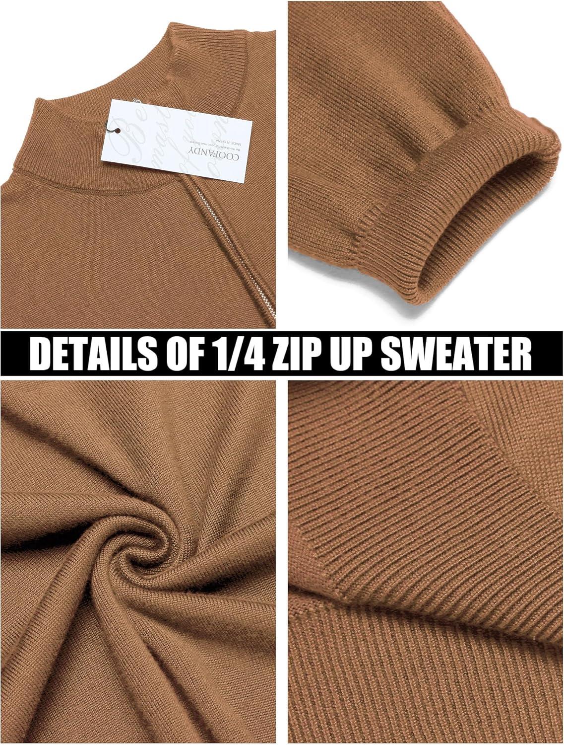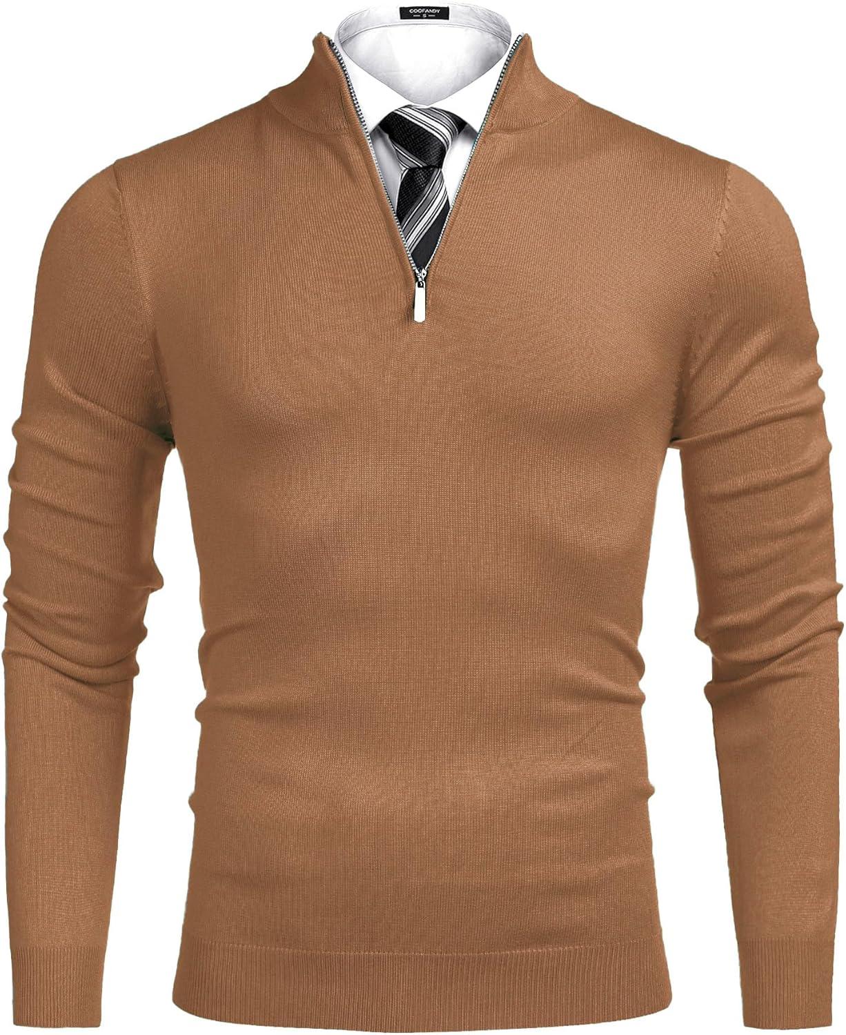 COOFANDY Men’s Quarter Zip Up Sweaters Slim Fit Lightweight Mock Neck Pullover Casual Polo Sweaters(Brown)