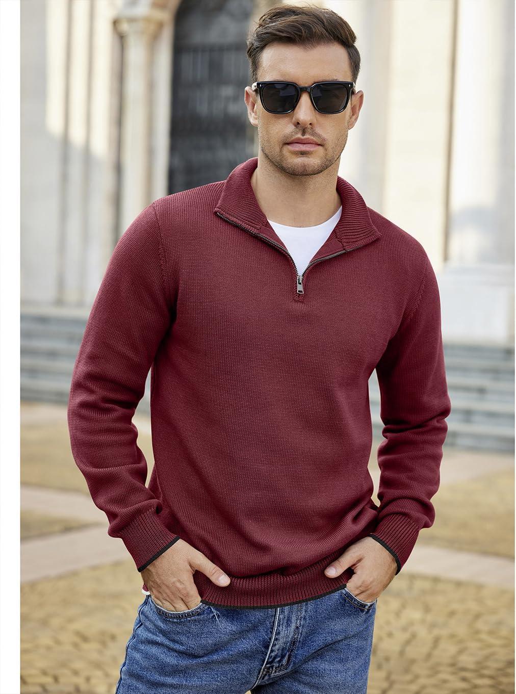 COOFANDY Men’s Quarter Zip Up Sweaters Slim Fit Lightweight Mock Neck Pullover Casual Polo Sweaters(Dark Red)