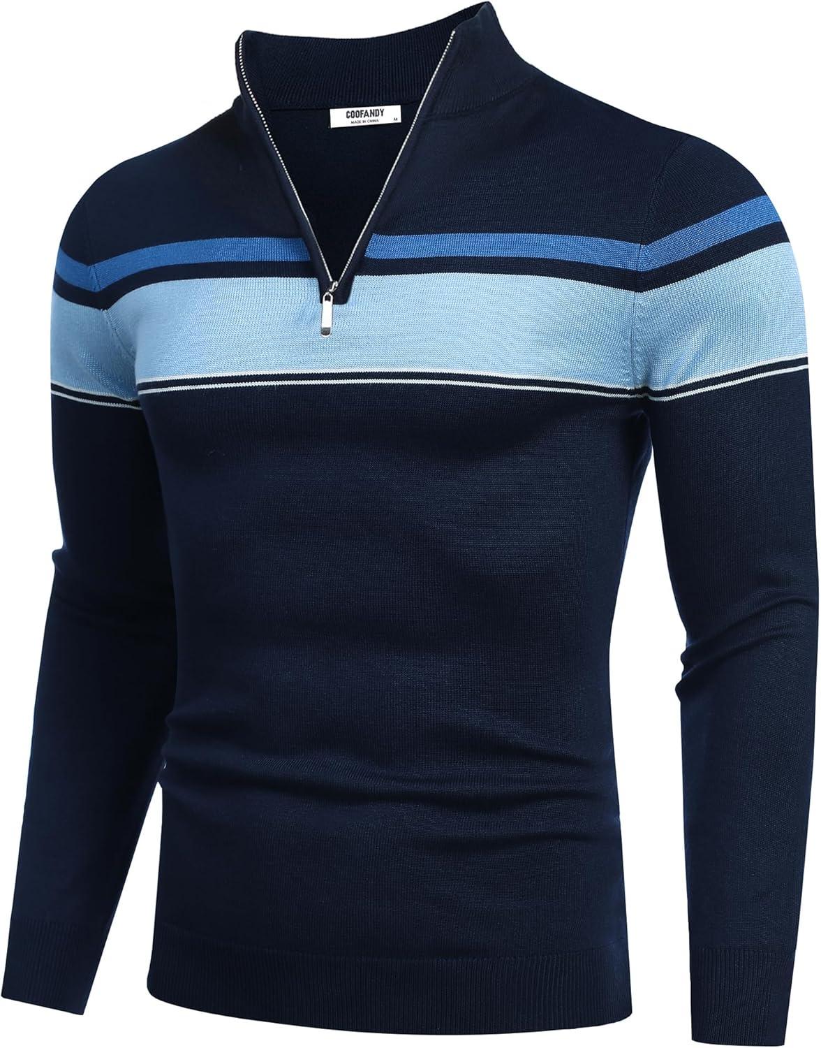COOFANDY Men’s Quarter Zip Up Sweaters Slim Fit Lightweight Mock Neck Pullover Casual Polo Sweaters(Stripe-blue)