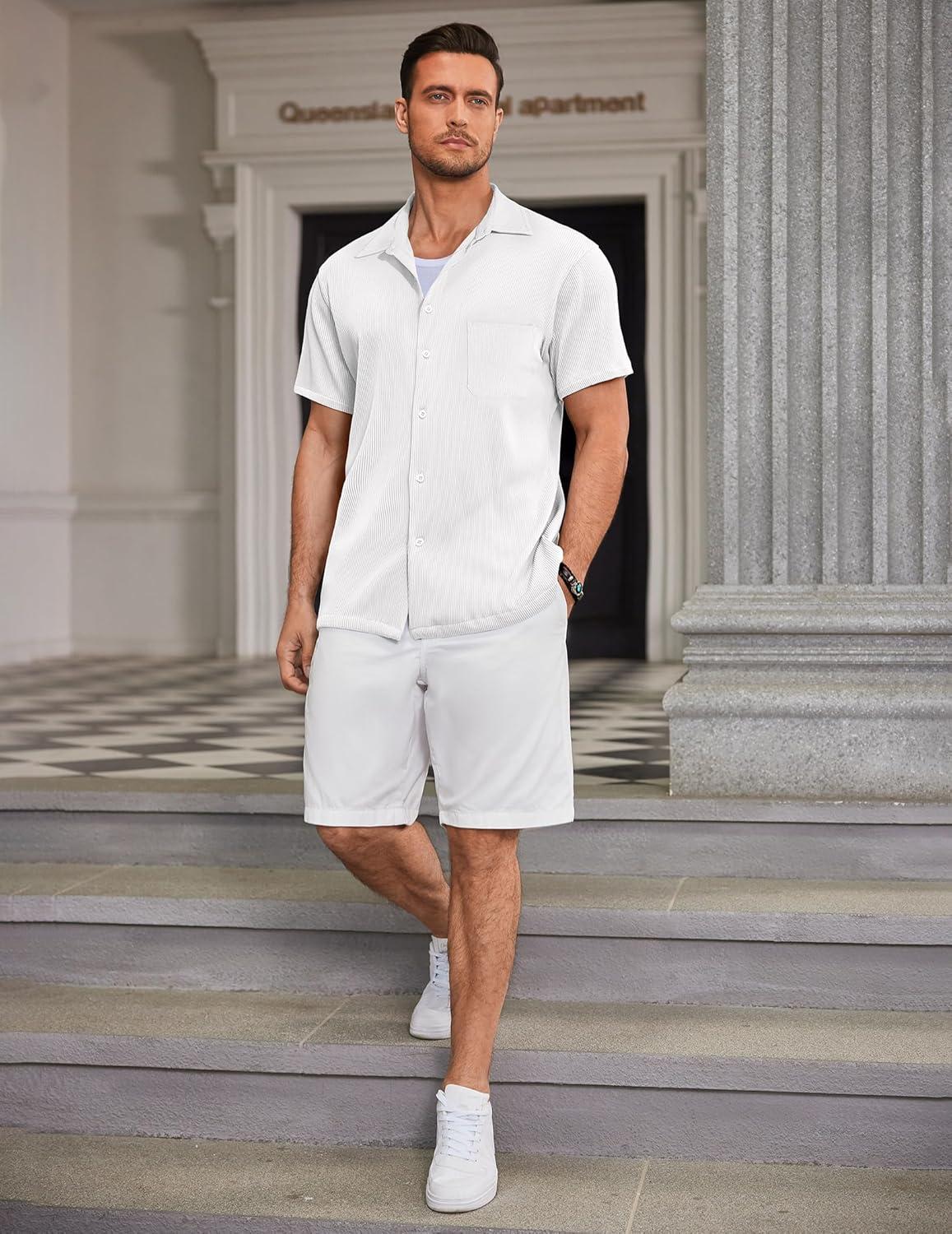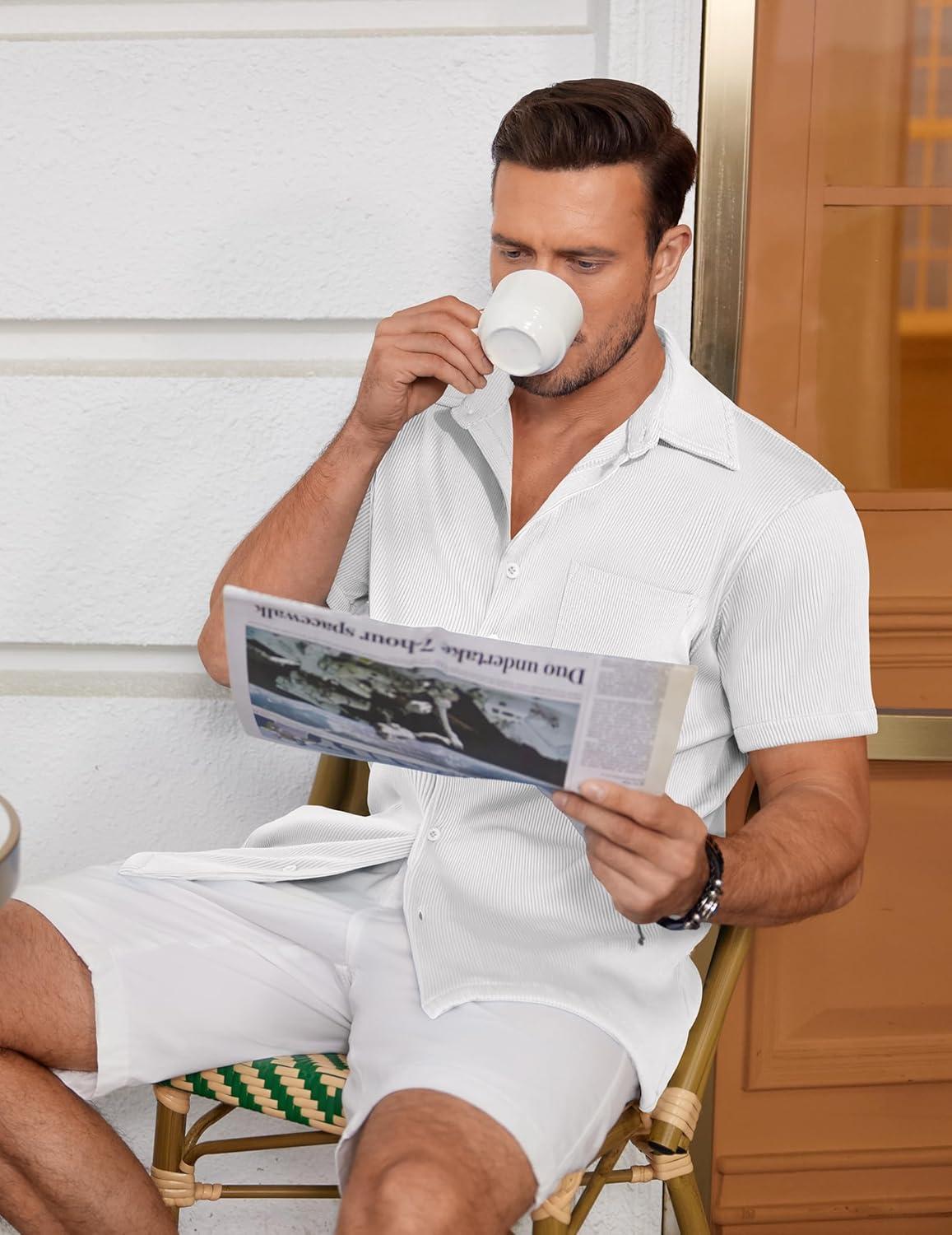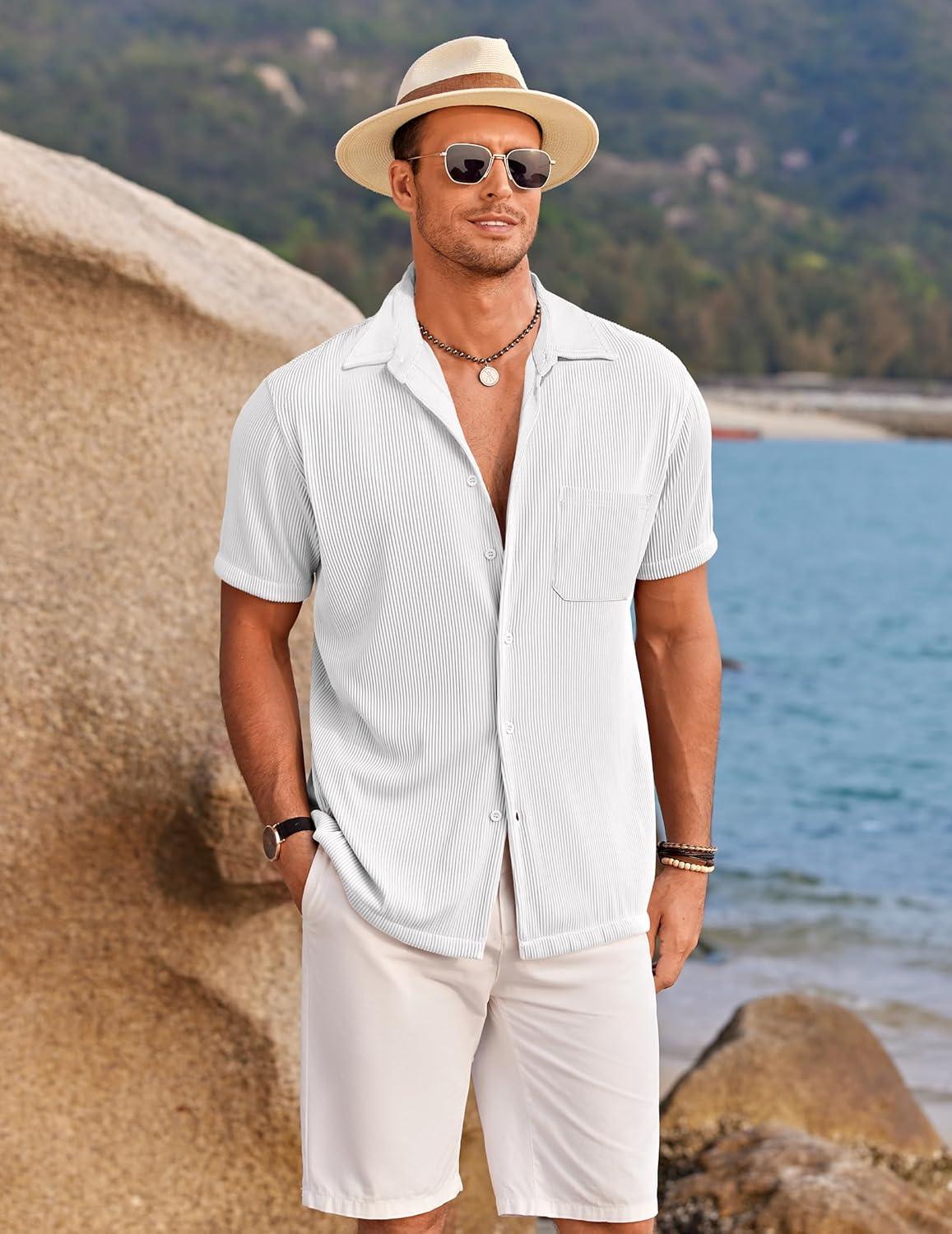 COOFANDY Men’s Ribbed Button Down Shirts Short Sleeve Casual Shirt with Pocket Summer Beach Camp Tops(White)