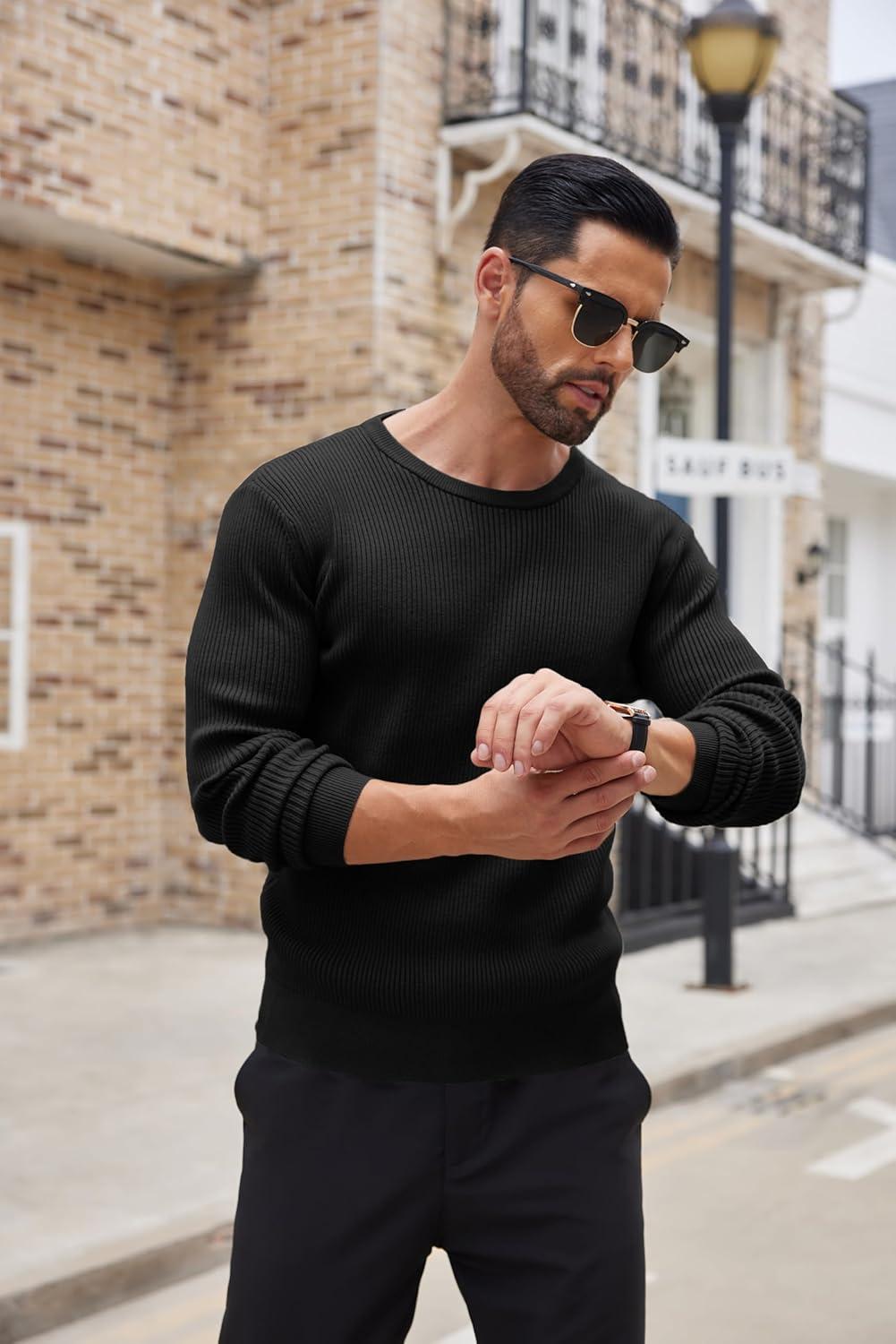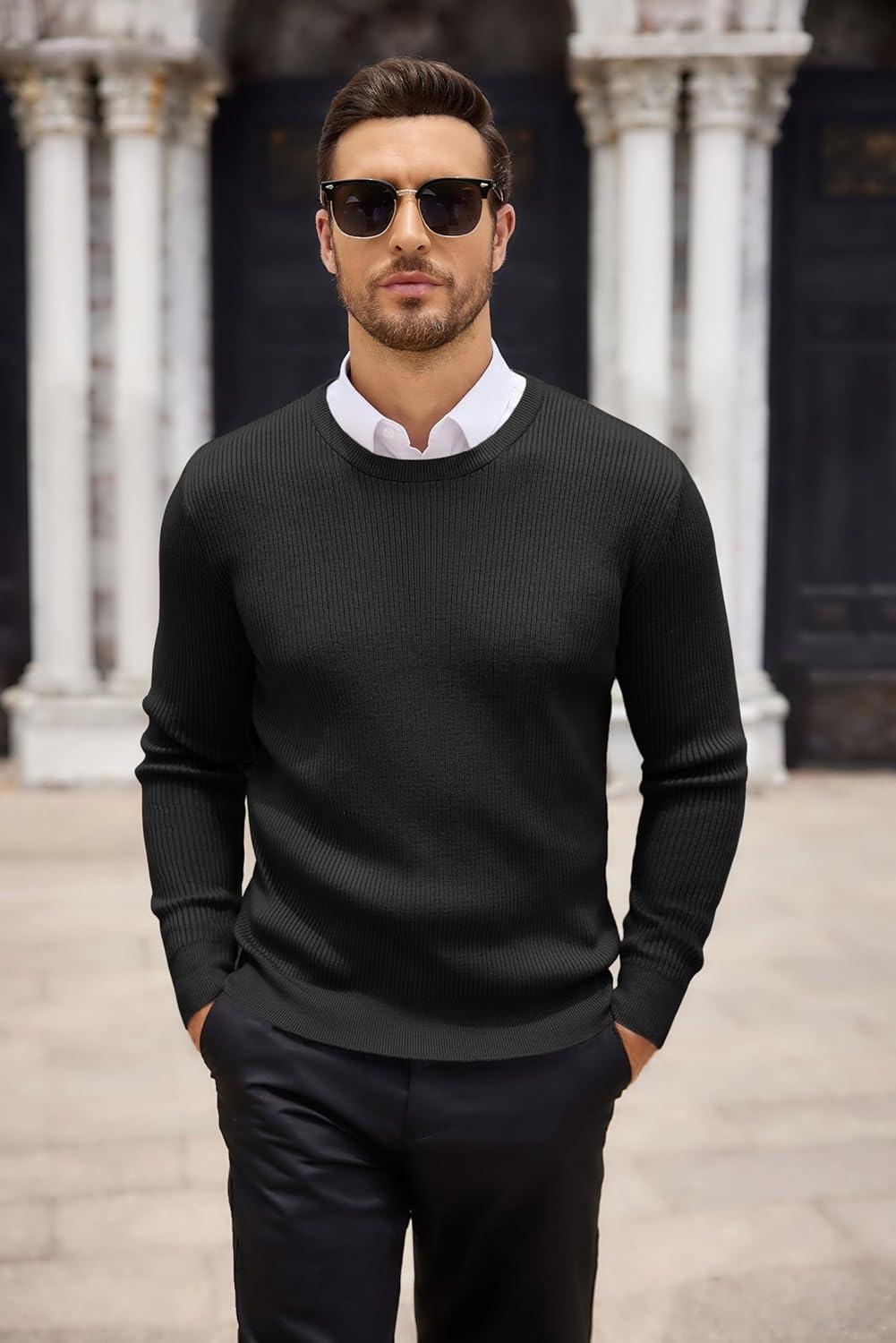 COOFANDY Men’s Ribbed Crewneck Sweater Long Sleeve Slim Fit Knitted Pullover Sweater(A-black)