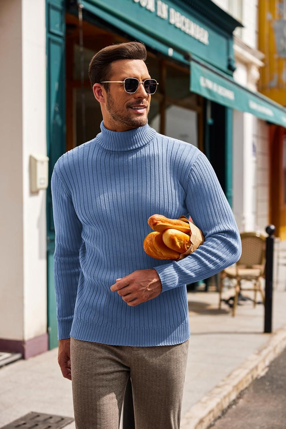 COOFANDY Mens Ribbed Slim Fit Knitted Pullover Casual Turtleneck Sweater(Blue-gray)