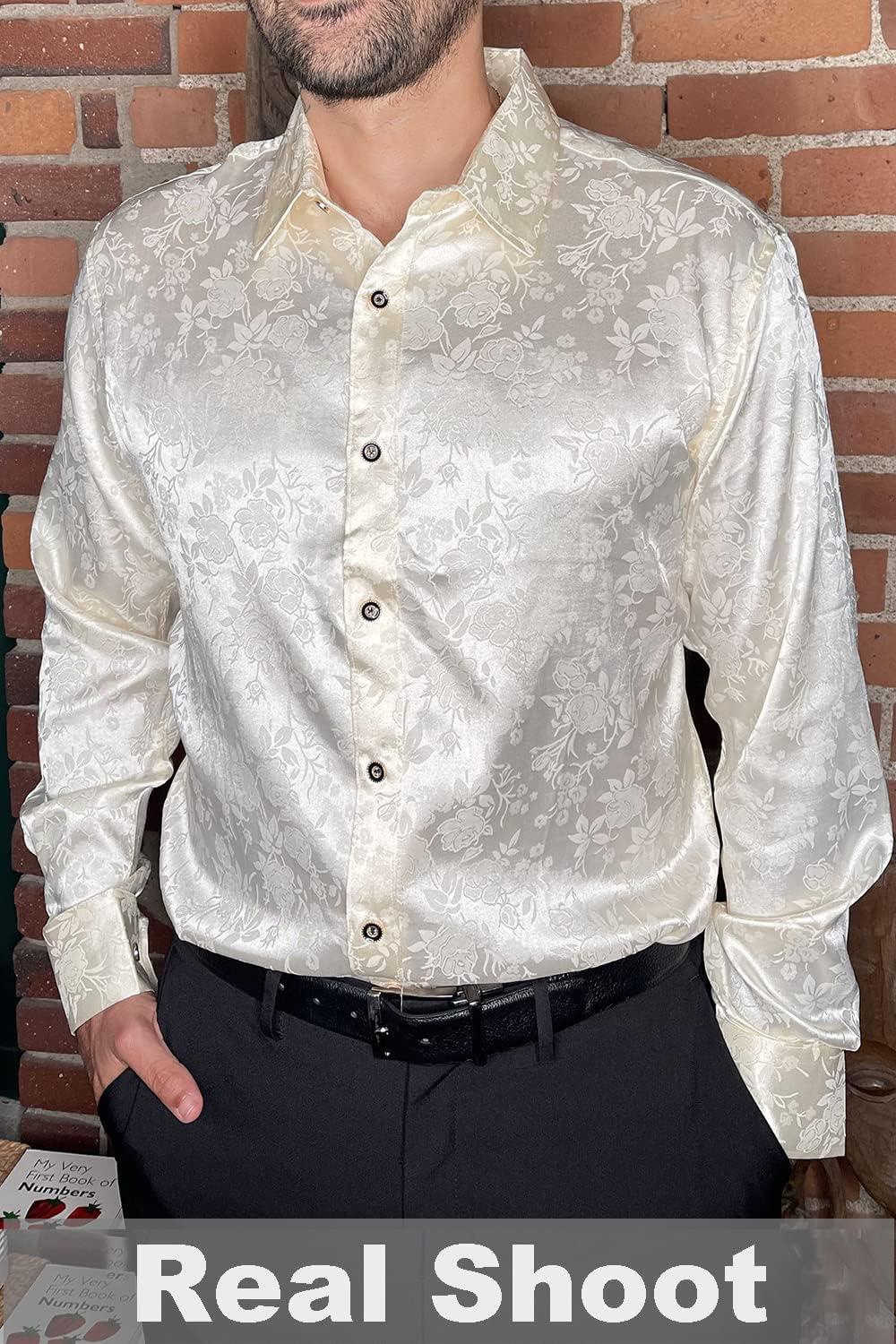 COOFDANDY men's shiny stylish shirt combines with the full rose pattern to create different vintage elegance, luxury floral print, slim fit button closure, turndown collar, the special printed design show your distinctive taste and fashion feel.