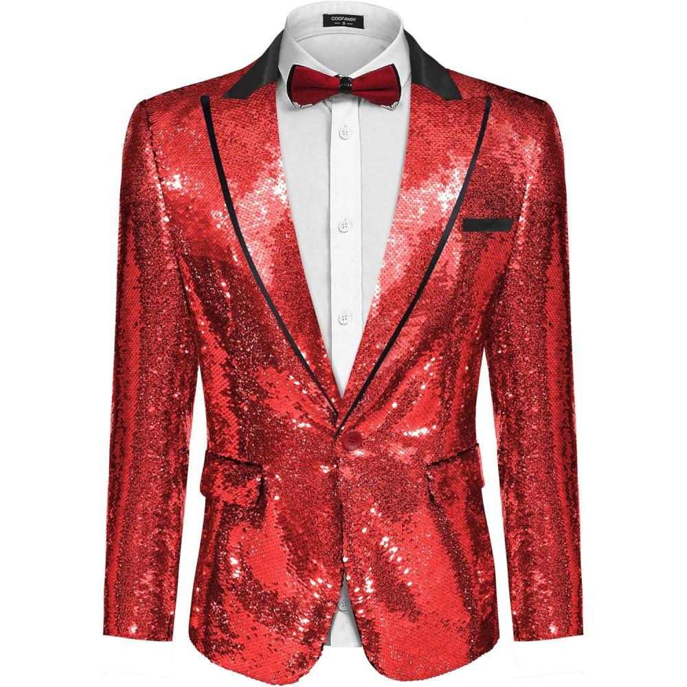 COOFANDY Mens Sequin Blazer Tuxedo Party Prom Wedding Tuxedo One Button Jacket(Red-lapel Sequins)