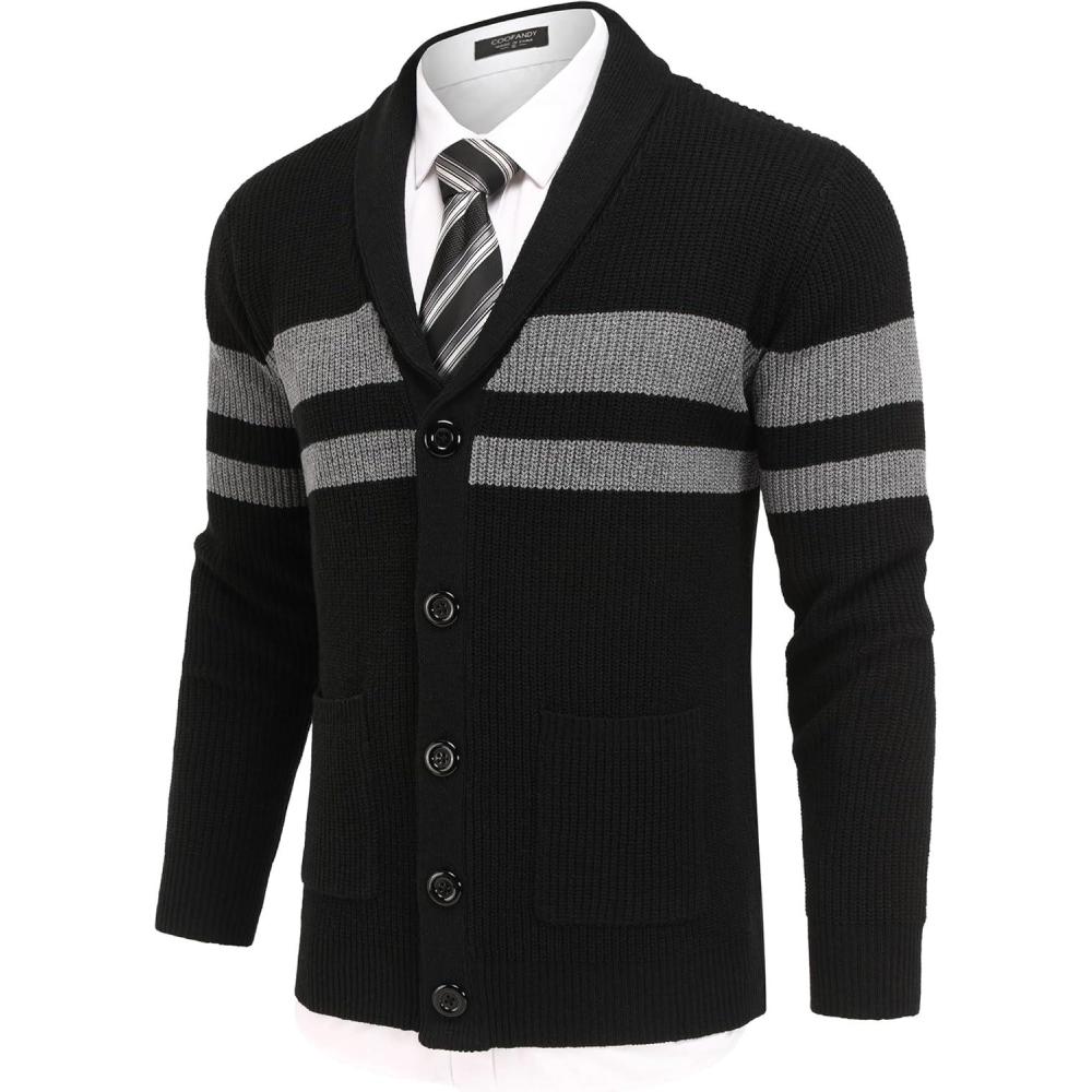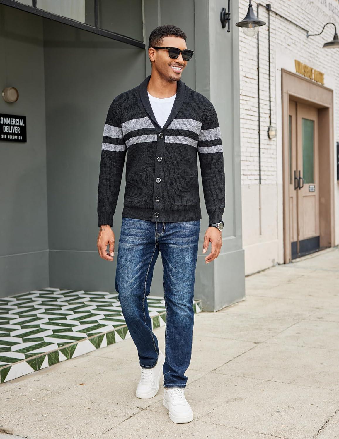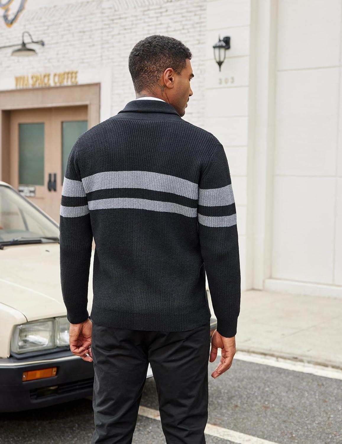 COOFANDY Men’s Shawl Collar Cardigan Sweater Slim Fit Cable Knit Button up Sweater with Pockets(Stripes-dark Gray on Black)