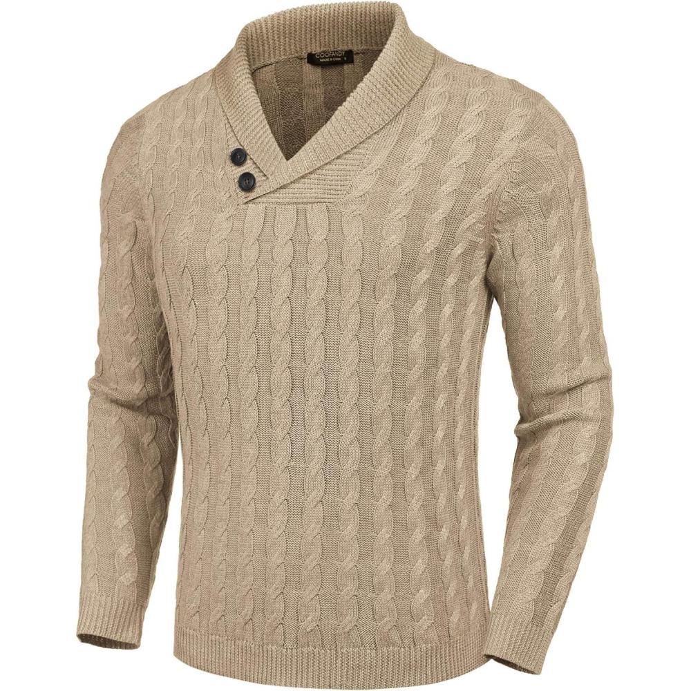COOFANDY Men’s Shawl Collar Pullover Sweater Slim Fit Casual Button Cable Knit Sweaters(Khaki)