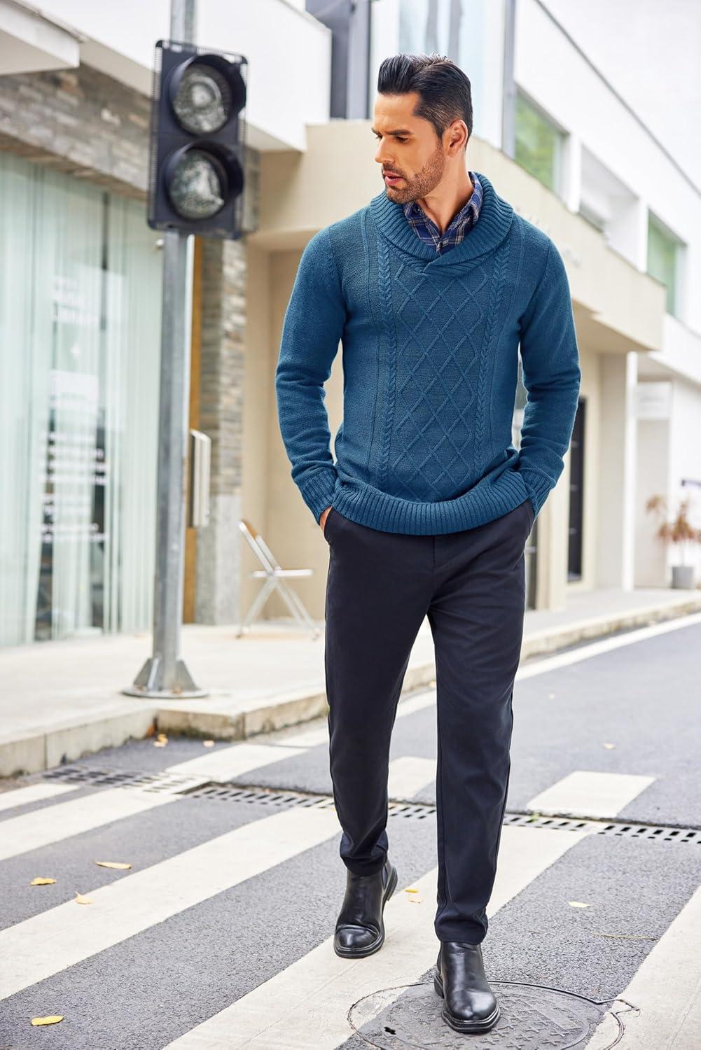 COOFANDY Men’s Shawl Collar Sweaters V-Neck Relaxed Fit Cable Pullovers(Denim Blue)