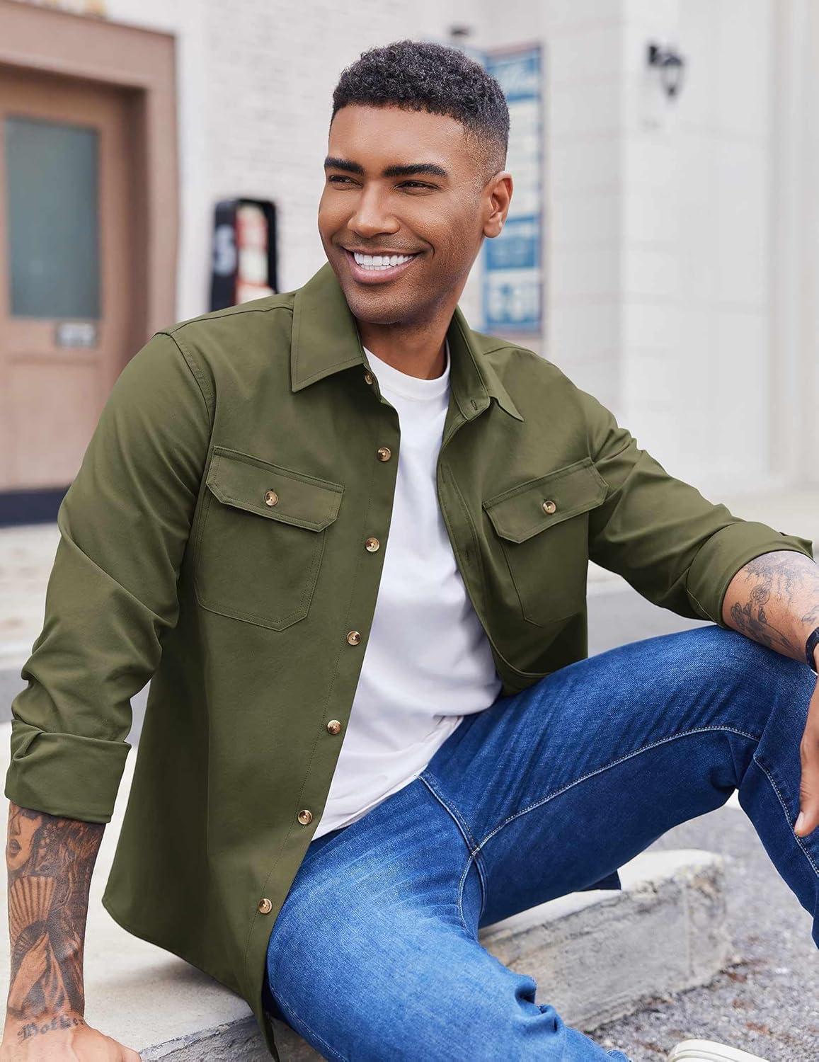 COOFANDY Mens Shirt Jacket Casual Button Up Shirts Long Sleeve Lightweight Shacket with Flap Pockets(Olive Green)