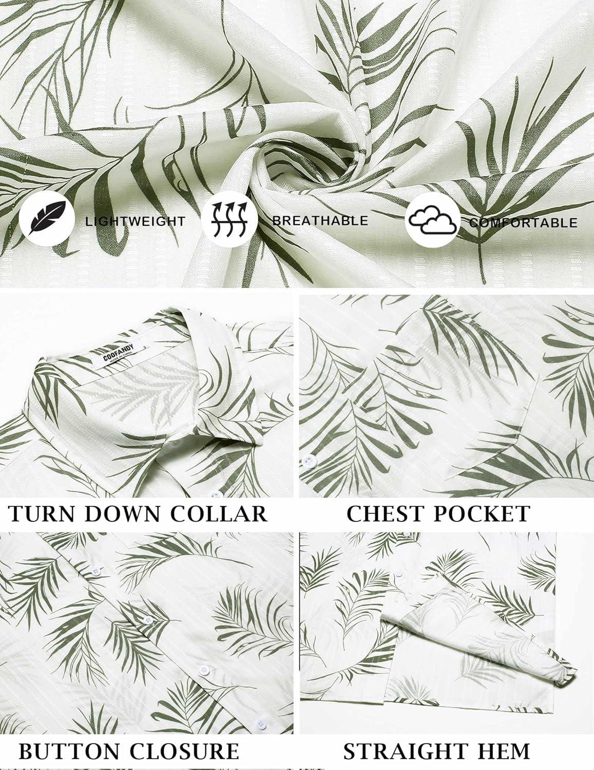 COOFANDY Men’s Short Sleeve Button Down Shirt Casual Summer Beach Untucked Vacation Textured Shirts with Pocket(White-green Leaves)