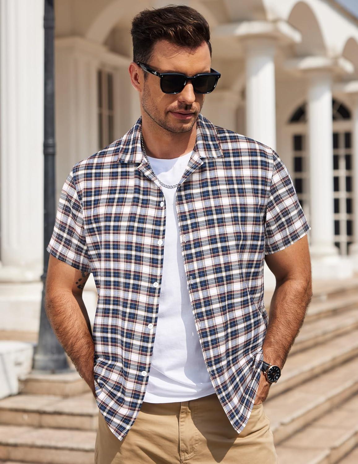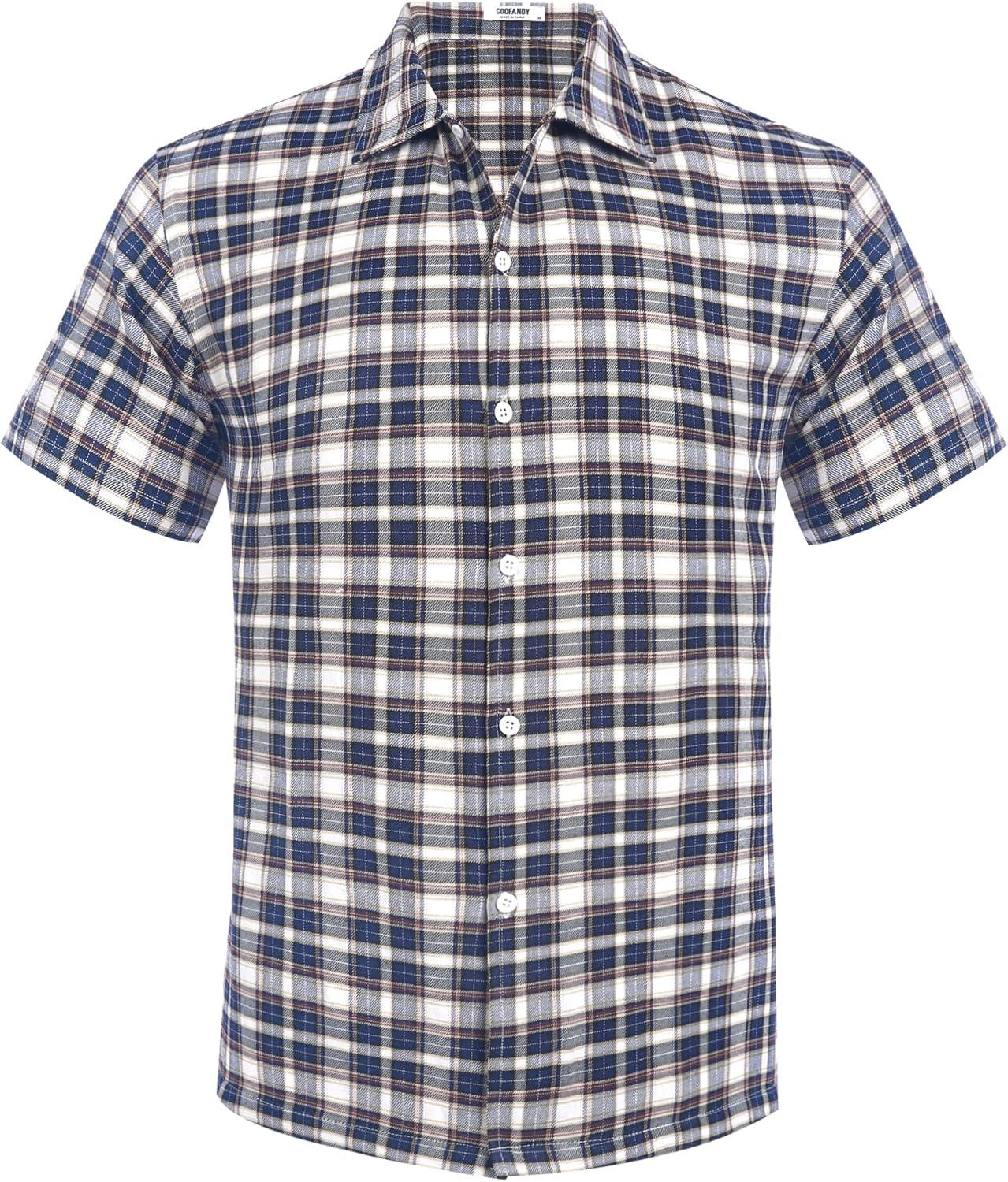 COOFANDY Mens Short Sleeve Button Down Shirt Plaid Button Up Shirts Casual 75% Cotton Work Shirts(Dark Blue&white)