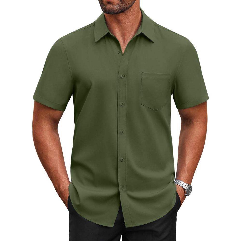 COOFANDY Men’s Short Sleeve Button Down Shirts Casual Dress Shirts for Men Untucked Shirt with Pocket(Army Green)