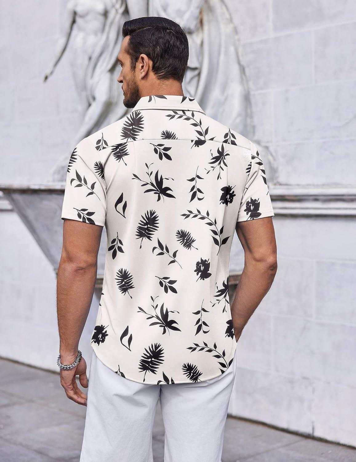 COOFANDY Men’s Short Sleeve Button Down Shirts Casual Summer Dress Untucked Shirts(White – Leaf)