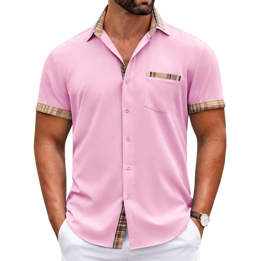 COOFANDY Mens Short Sleeve Button Down Shirts Casual Wrinkle Free Dress Shirt Plaid Collar Summer Shirts(Pink)