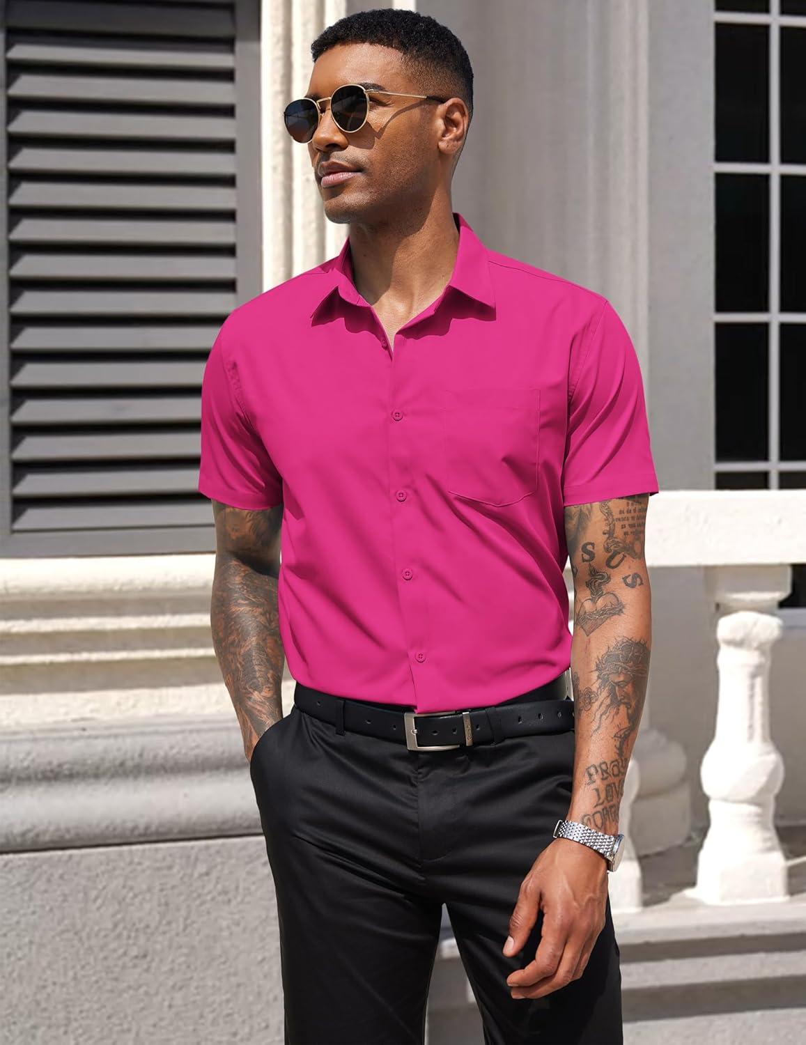 COOFANDY Men’s Short Sleeve Casual Button Down Shirt Business Untucked Dress Shirts with Pocket(Bright Pink)