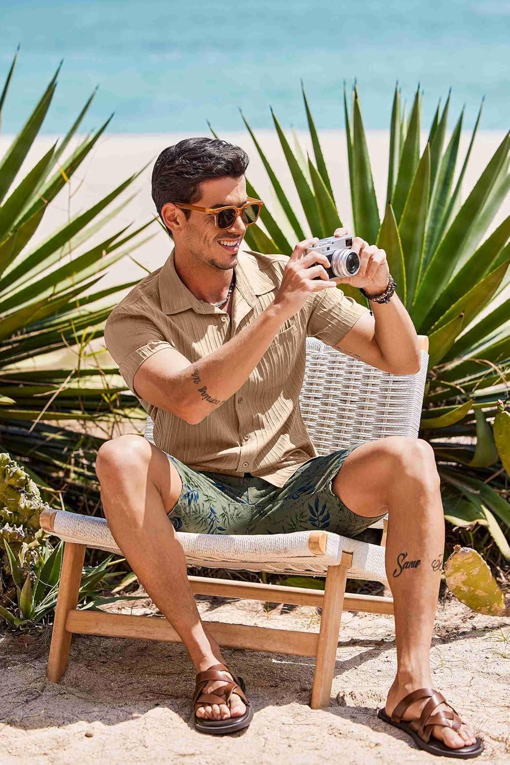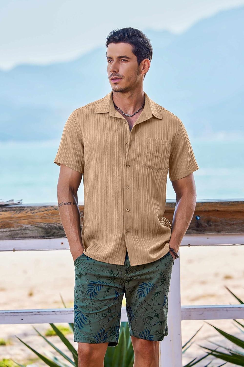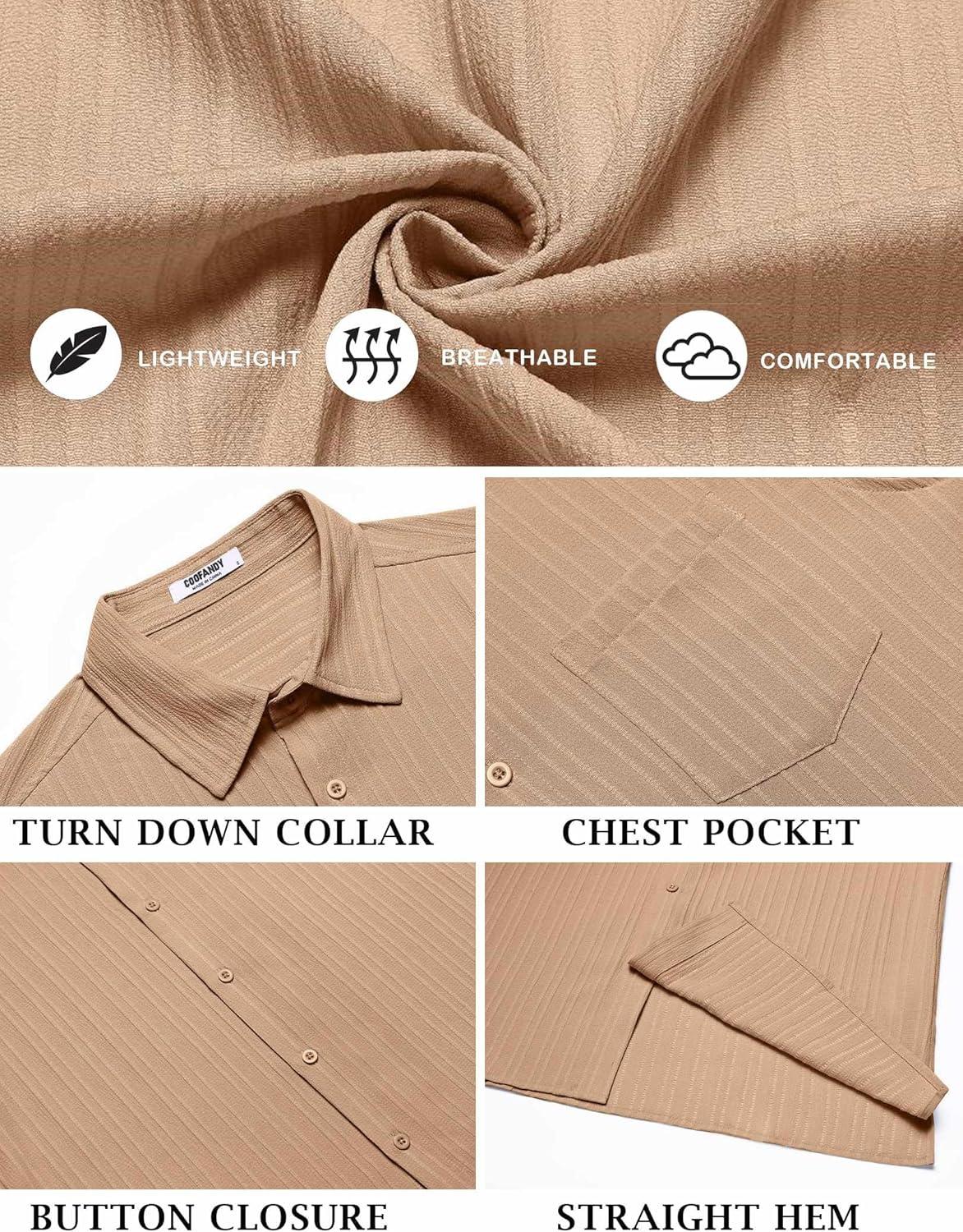 COOFANDY Men’s Short Sleeve Casual Button Down Shirts Textured Summer Beach Shirt with Pocket(Khaki)