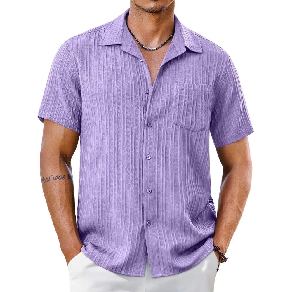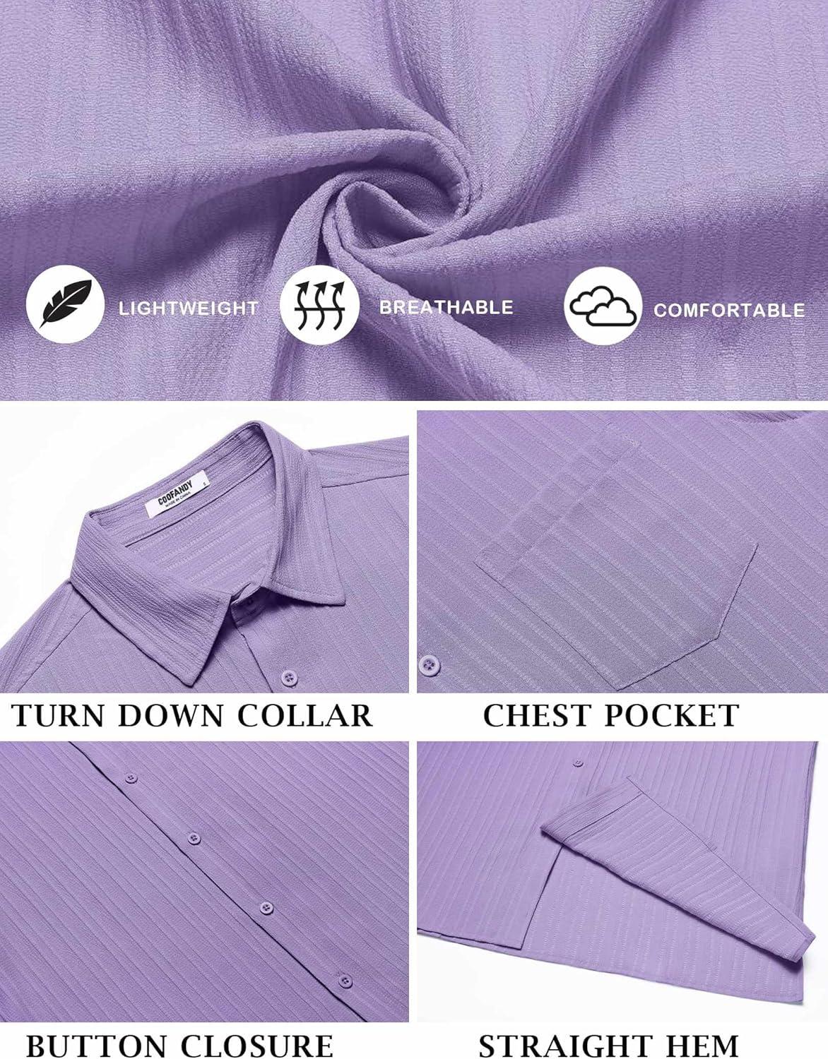 COOFANDY Men’s Short Sleeve Casual Button Down Shirts Textured Summer Beach Shirt with Pocket(Light Purple)