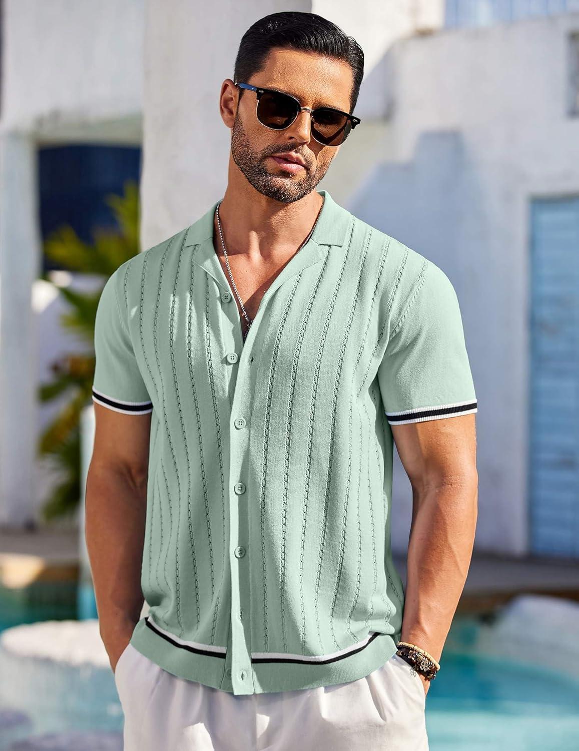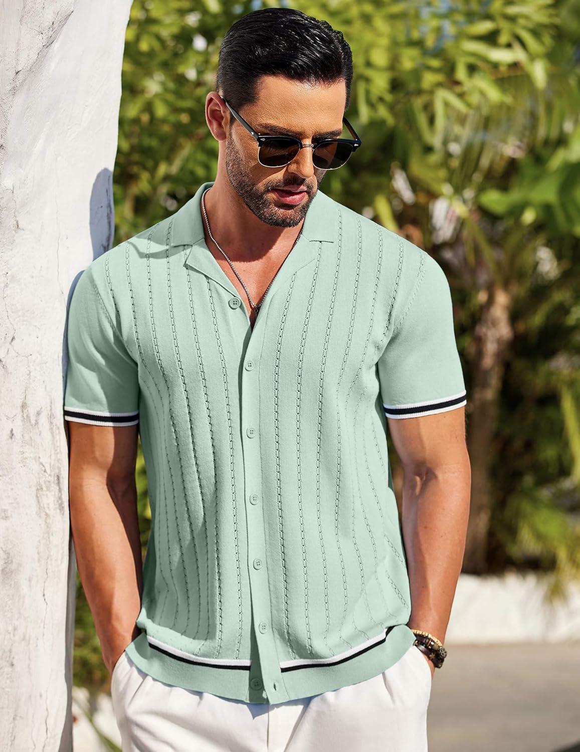 COOFANDY Men’s Short Sleeve Knit Shirt Casual Button Down Shirt Vintage Striped Knitted Golf Beach Tops(Light Green)