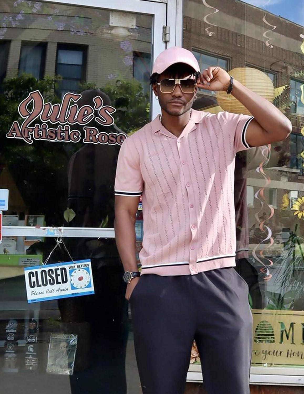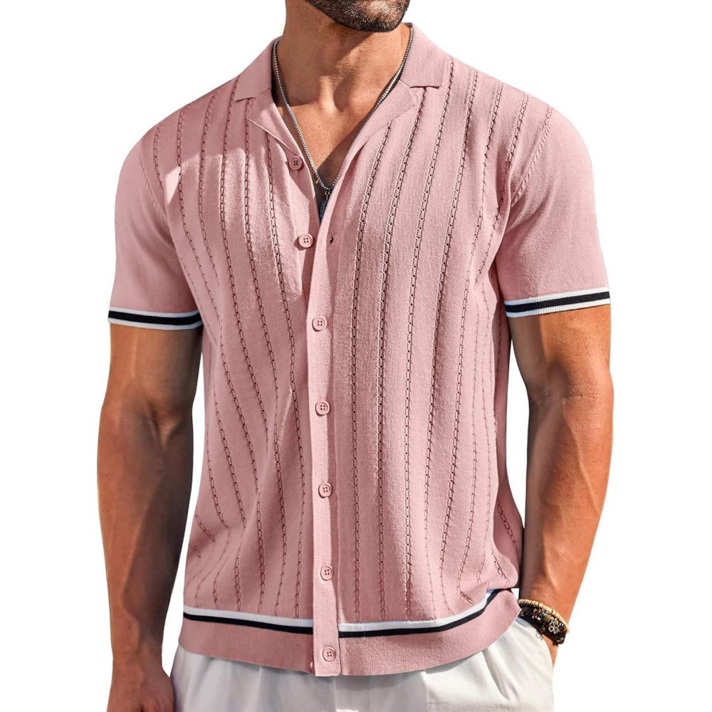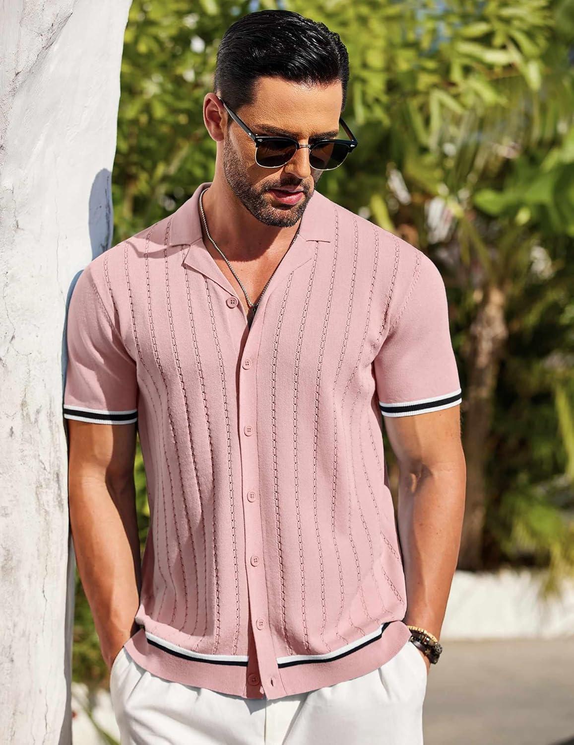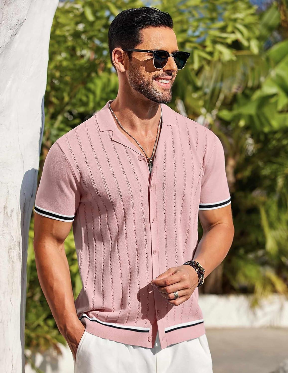 COOFANDY Men’s Short Sleeve Knit Shirt Casual Button Down Shirt Vintage Striped Knitted Golf Beach Tops(Light Pink)