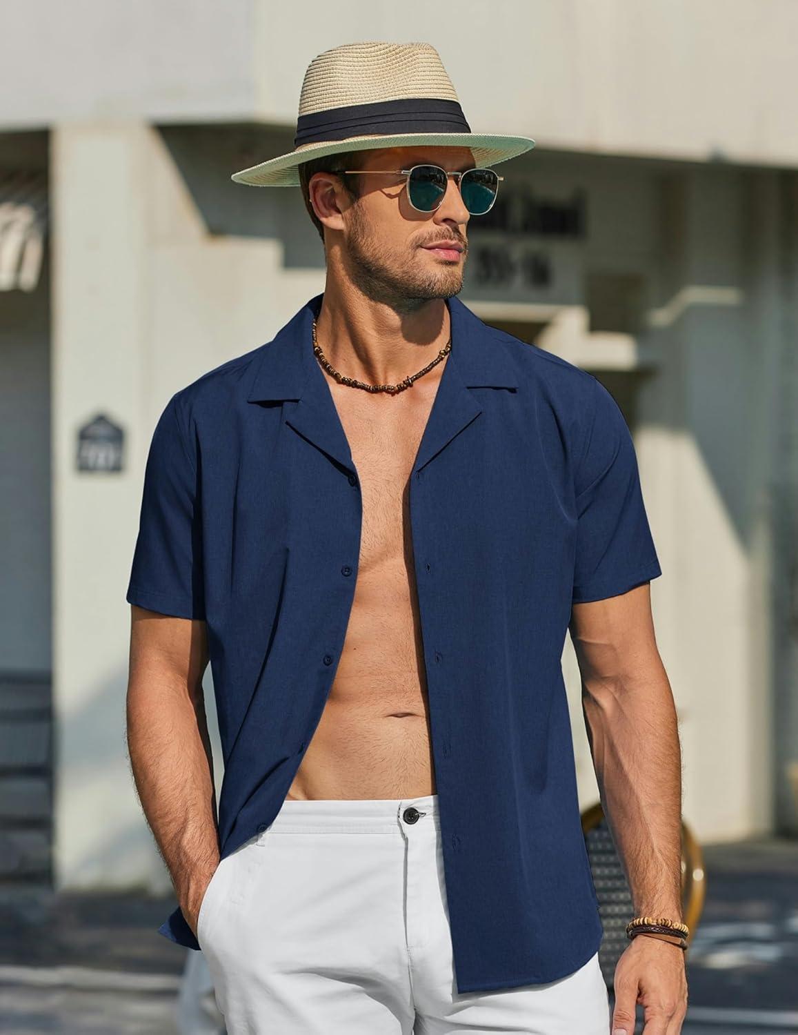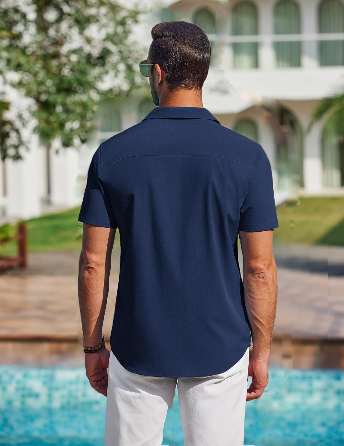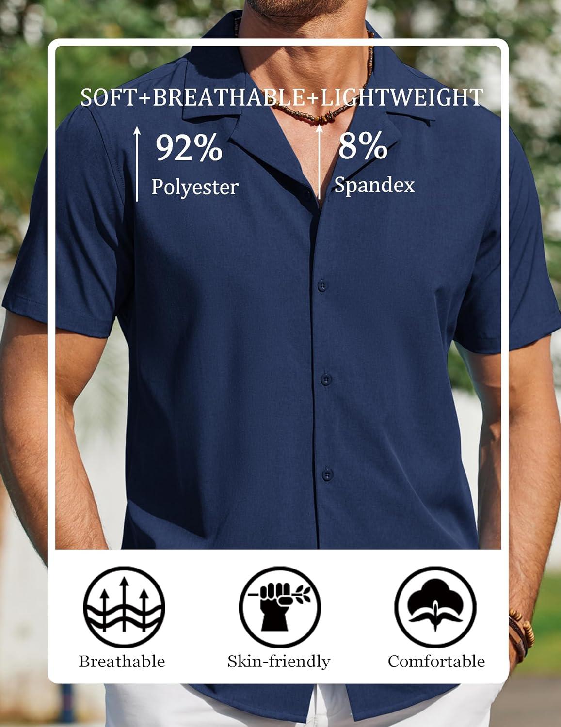 COOFANDY Mens Short Sleeve Shirts Casual Button Down Shirts Cuban Textured Summer Beach Shirts(Dark Blue)
