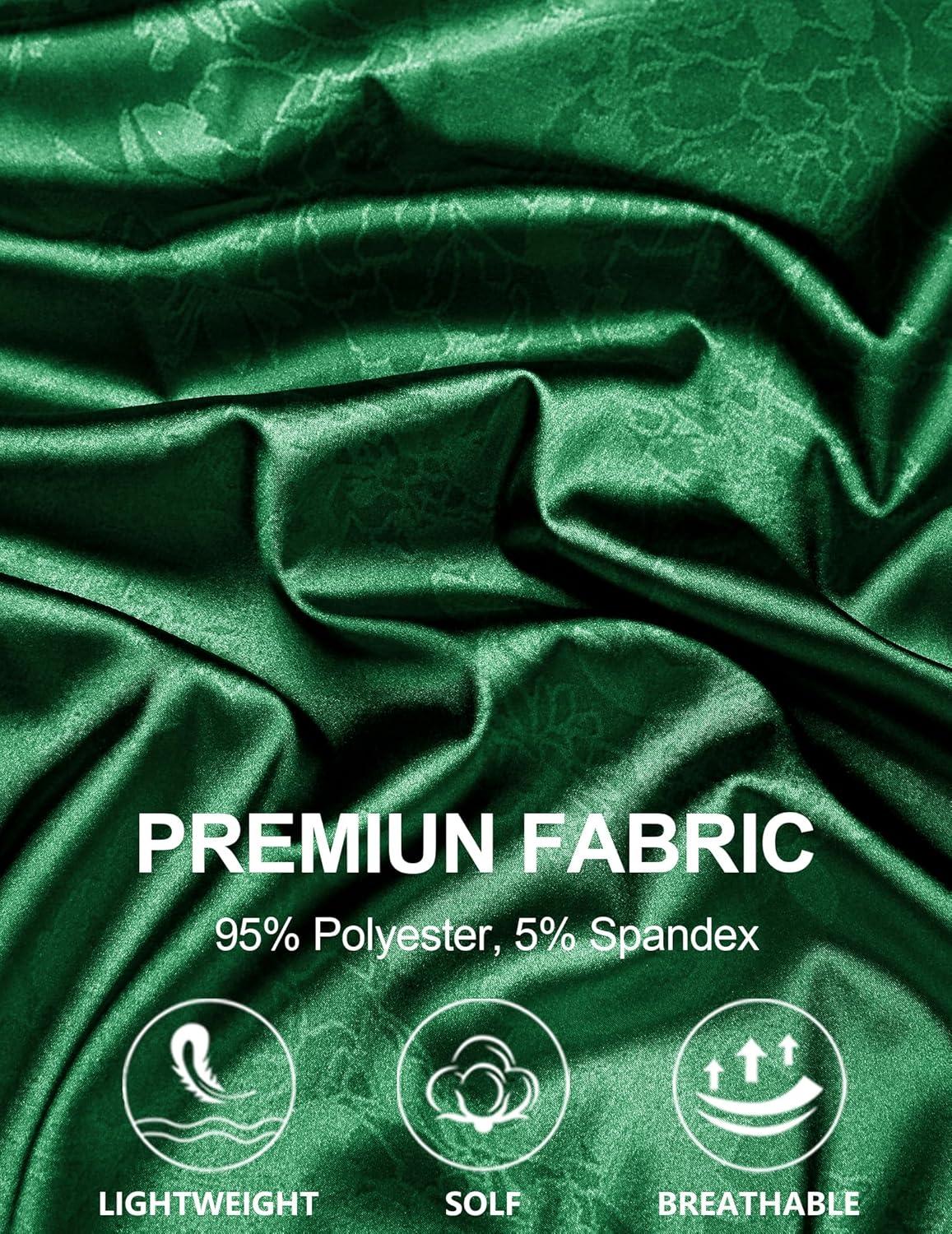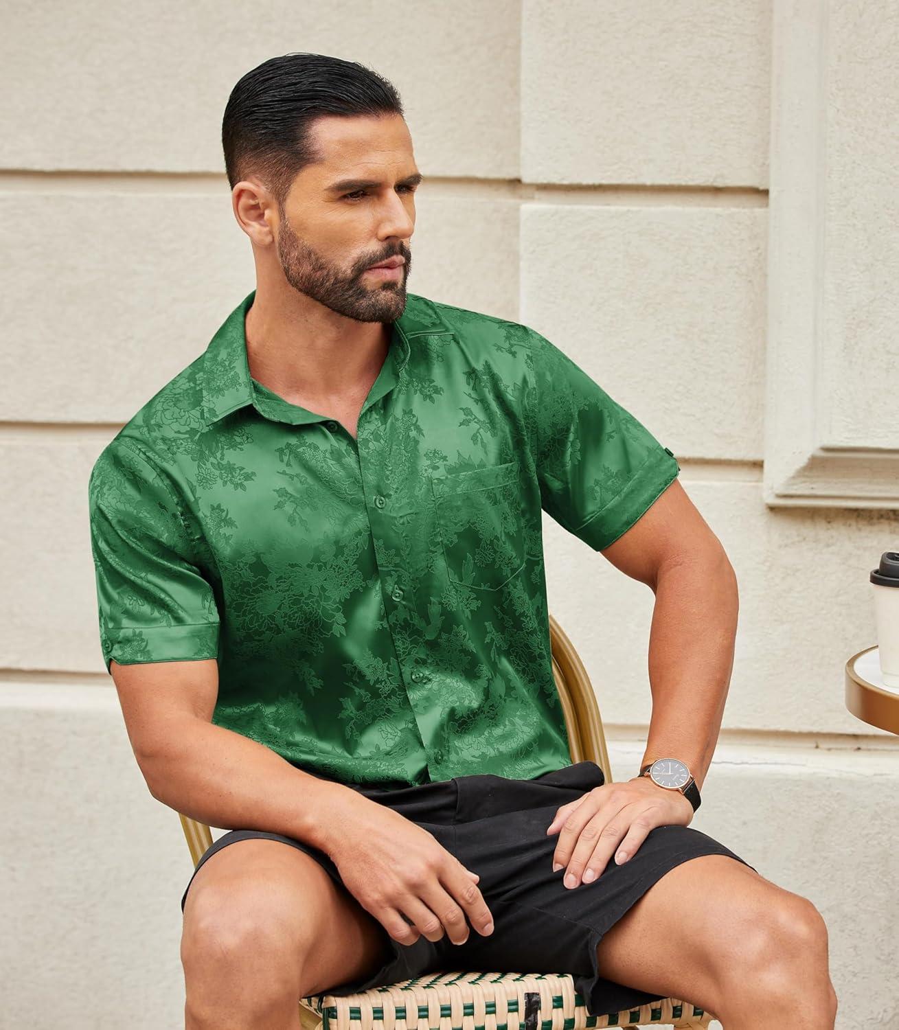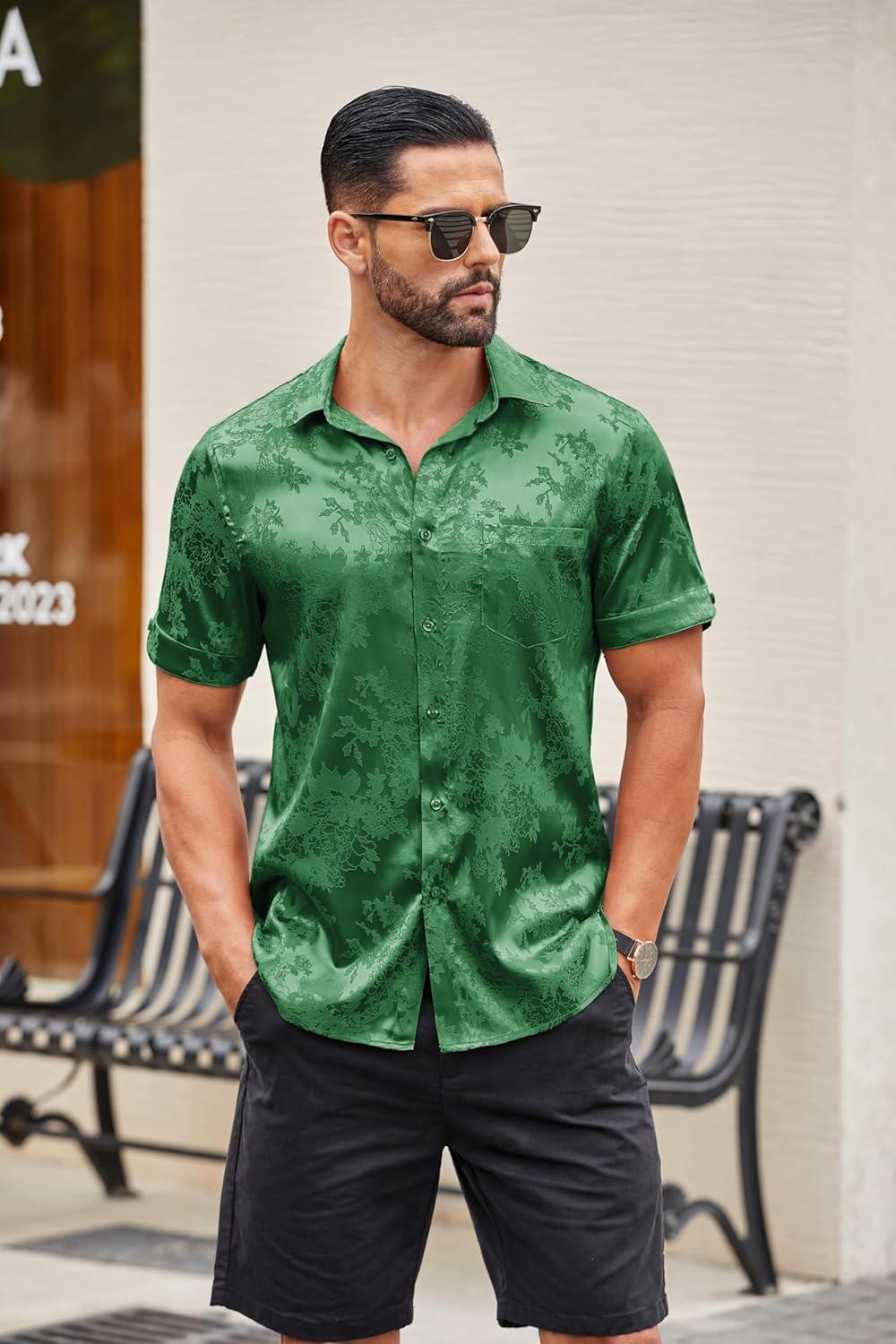 COOFANDY Mens Silk Button Down Short Sleeve Shirt Satin Dress Shirts Summer Beach Wedding Shirt(03 Deep Green)