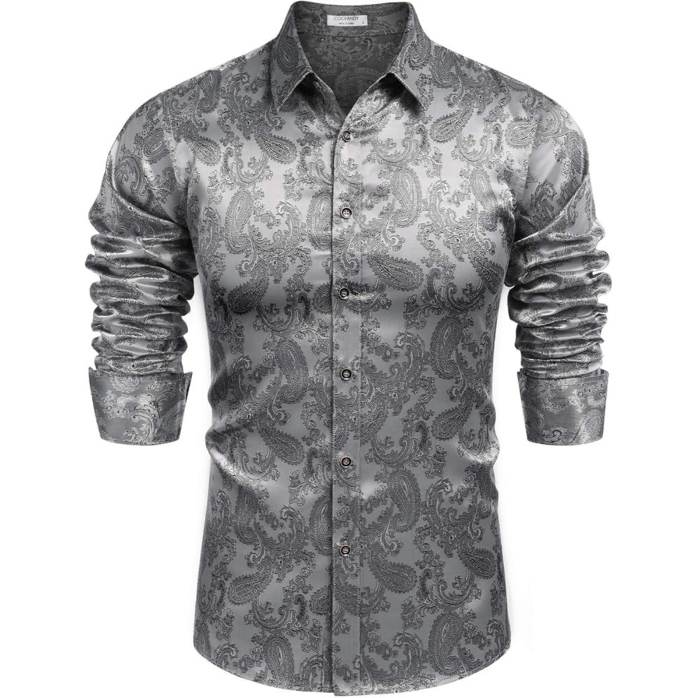 COOFANDY Men’s Silk Satin Dress Shirts Jacquard Long Sleeve Floral Button Up Shirts Party Prom Wedding Shirt(Grey)
